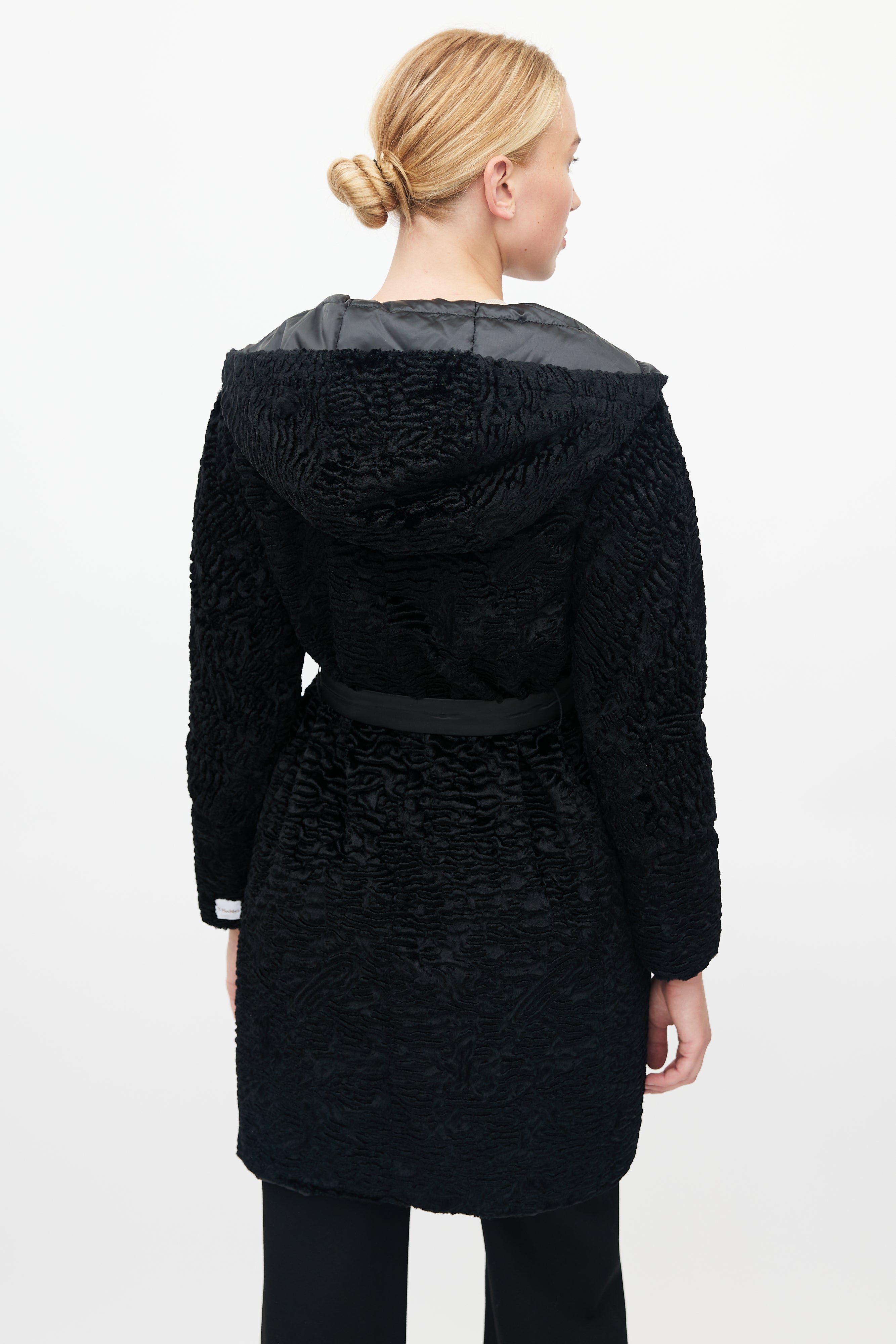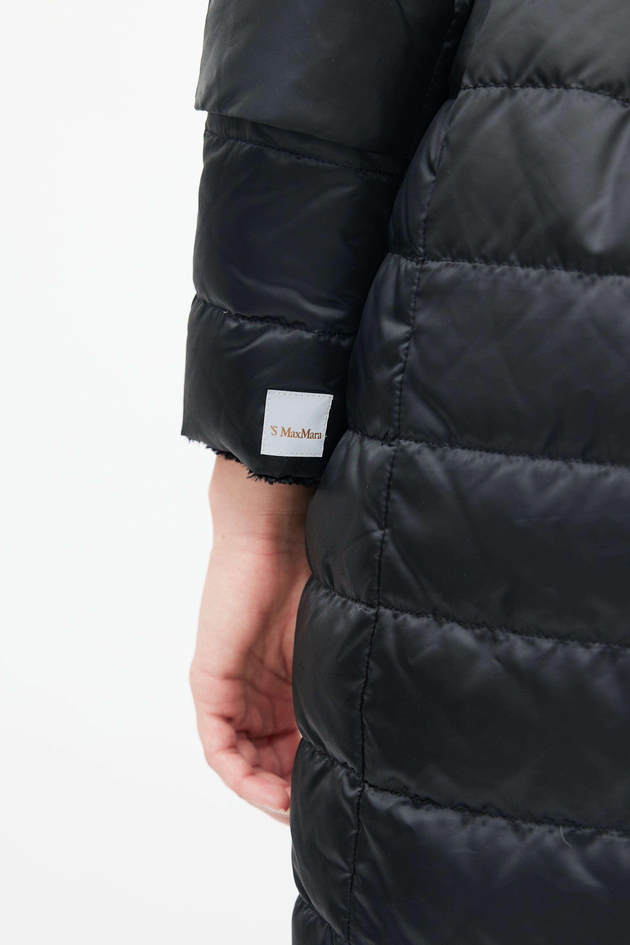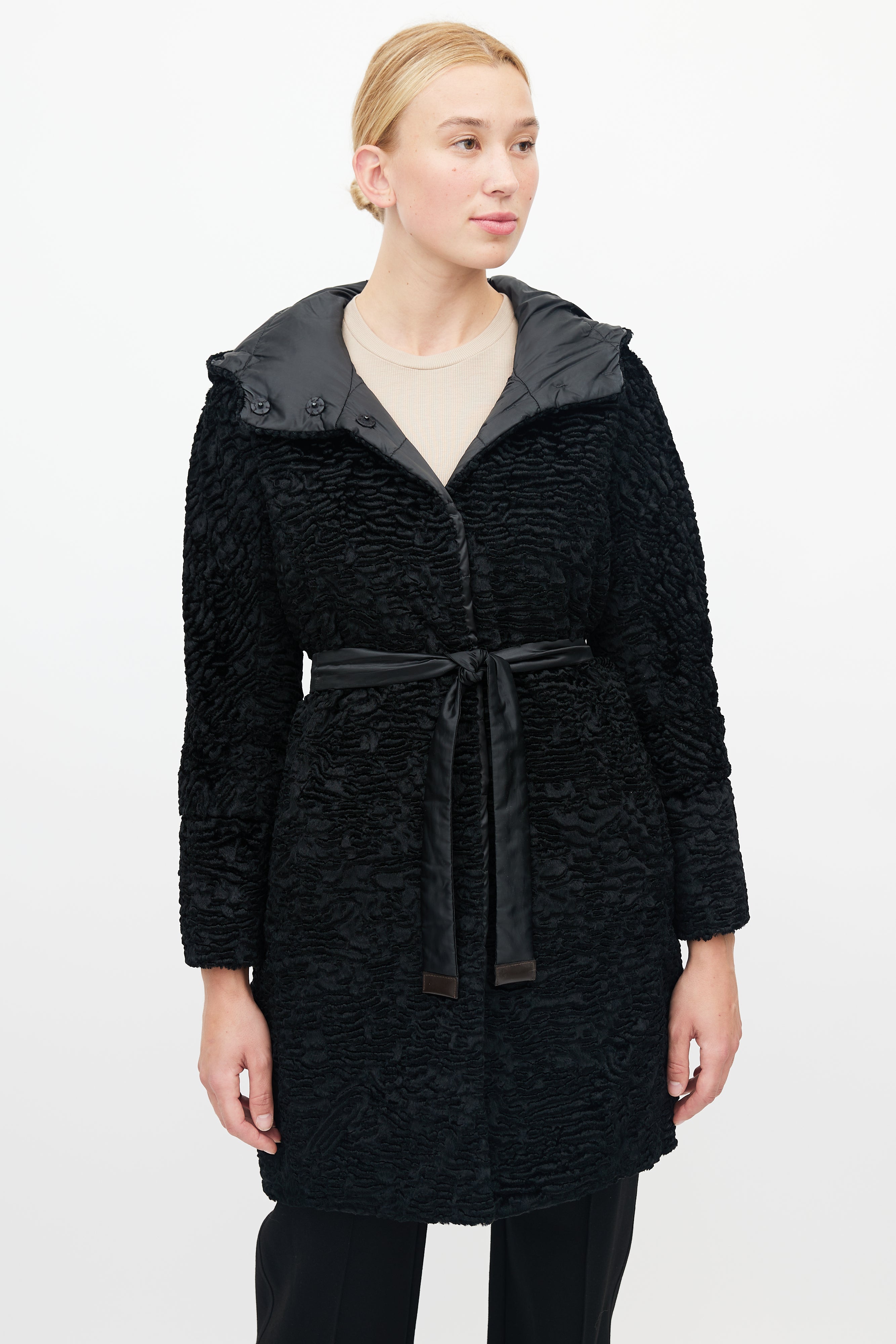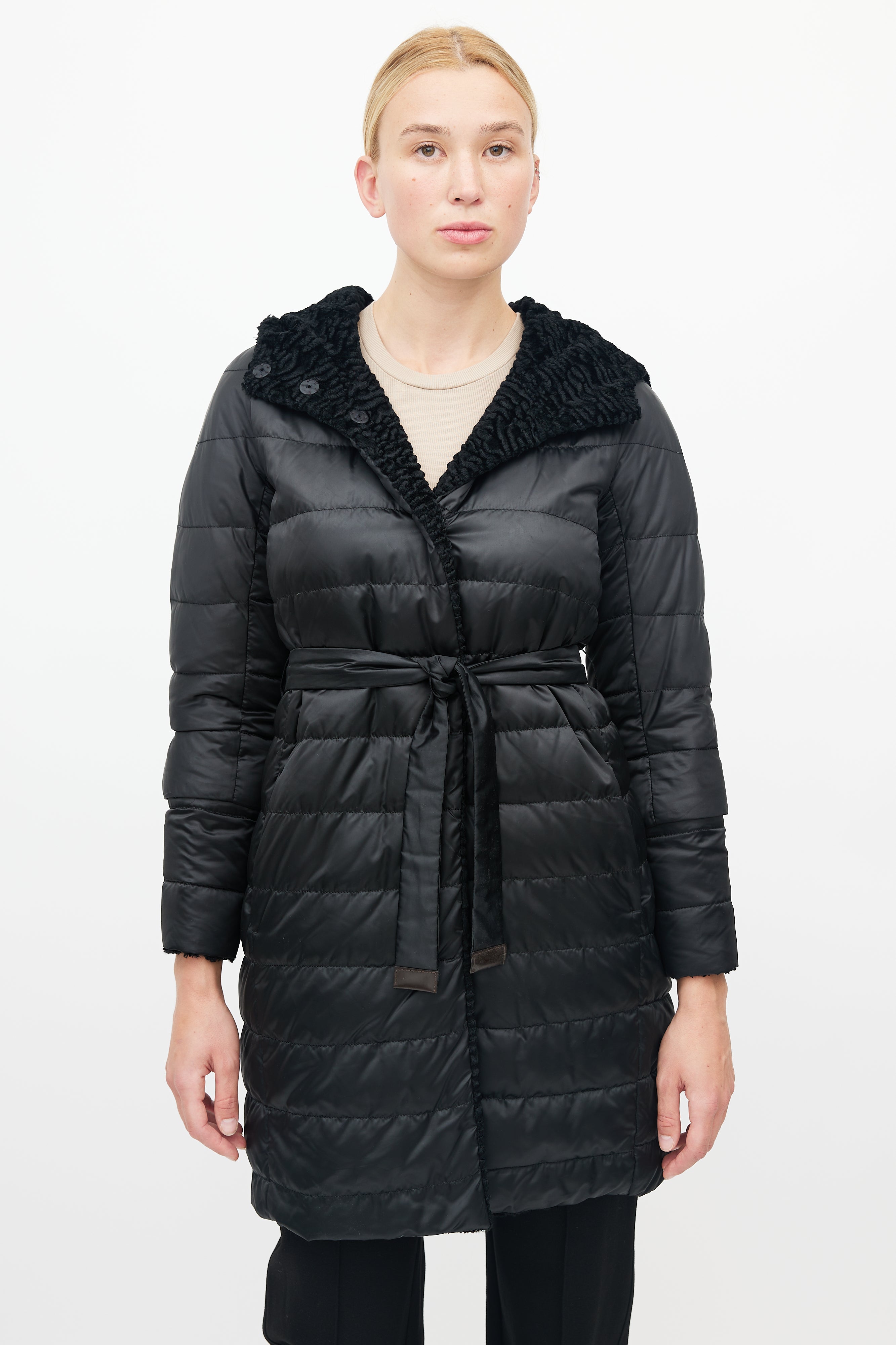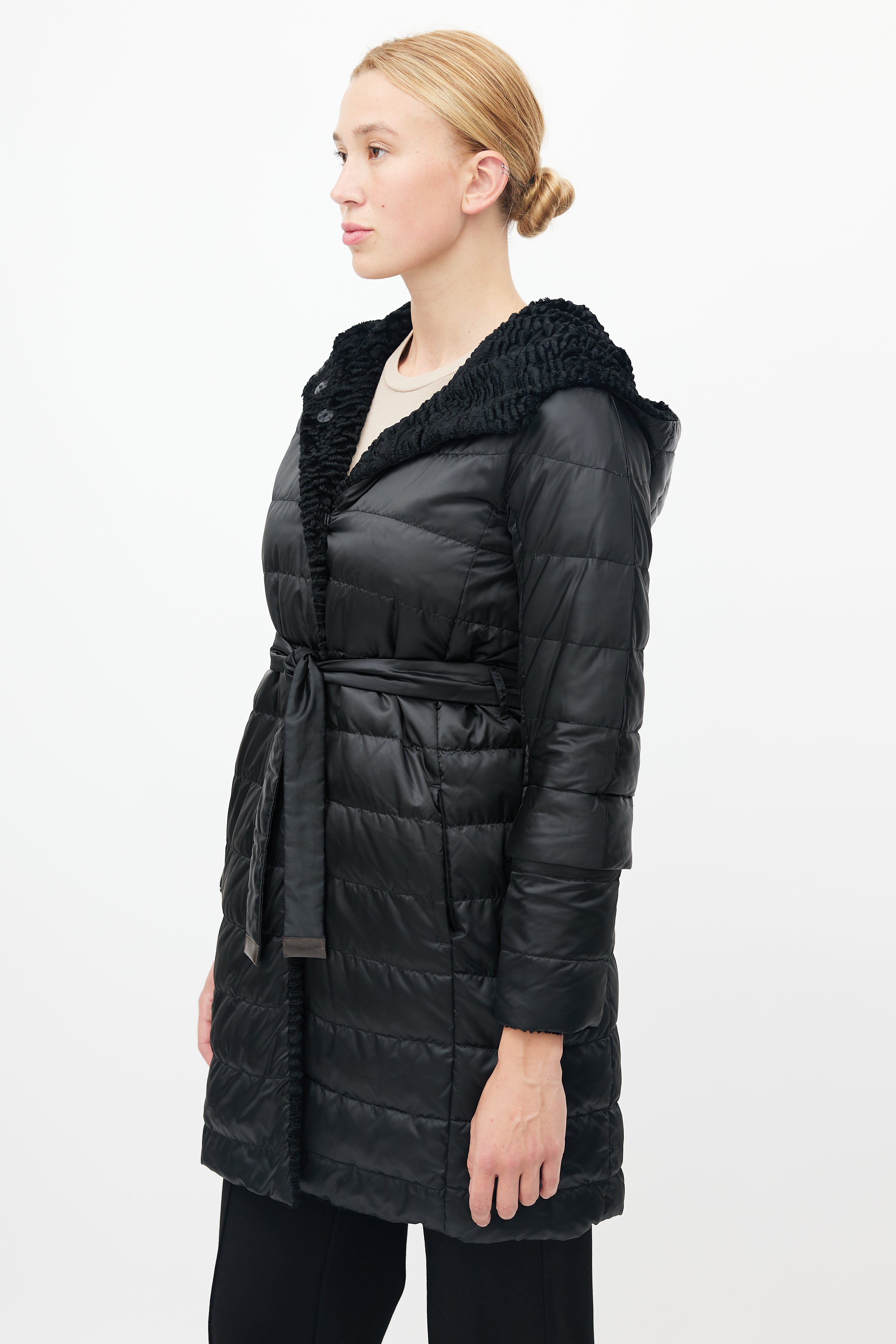 Pre-owned 'S Max Mara reversible coat featuring quilted nylon on one side and textured faux fur on the other, reversible hood, snap buttons, down fill, reflective 'S Max Mara tag at wrist and detachable belt which can be used for both sides.