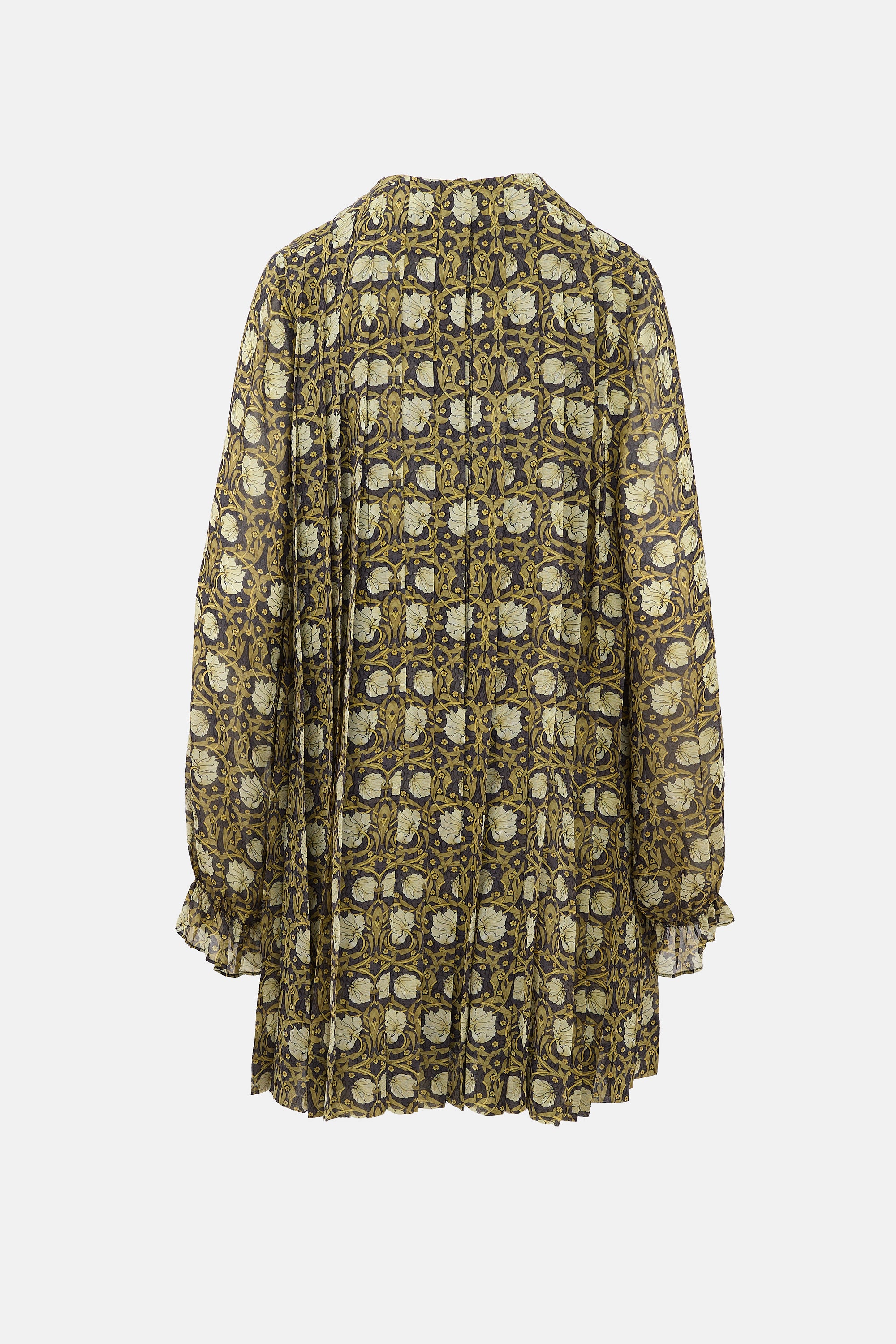 Pre-owned Robert Rodriguez green silk dress featuring floral print, pleats, long sleeves with elasticized cuffs, and snap button closure at back. Lined.