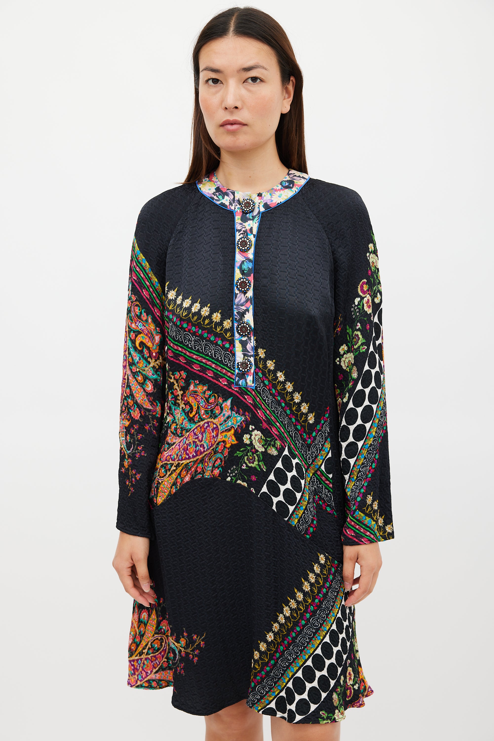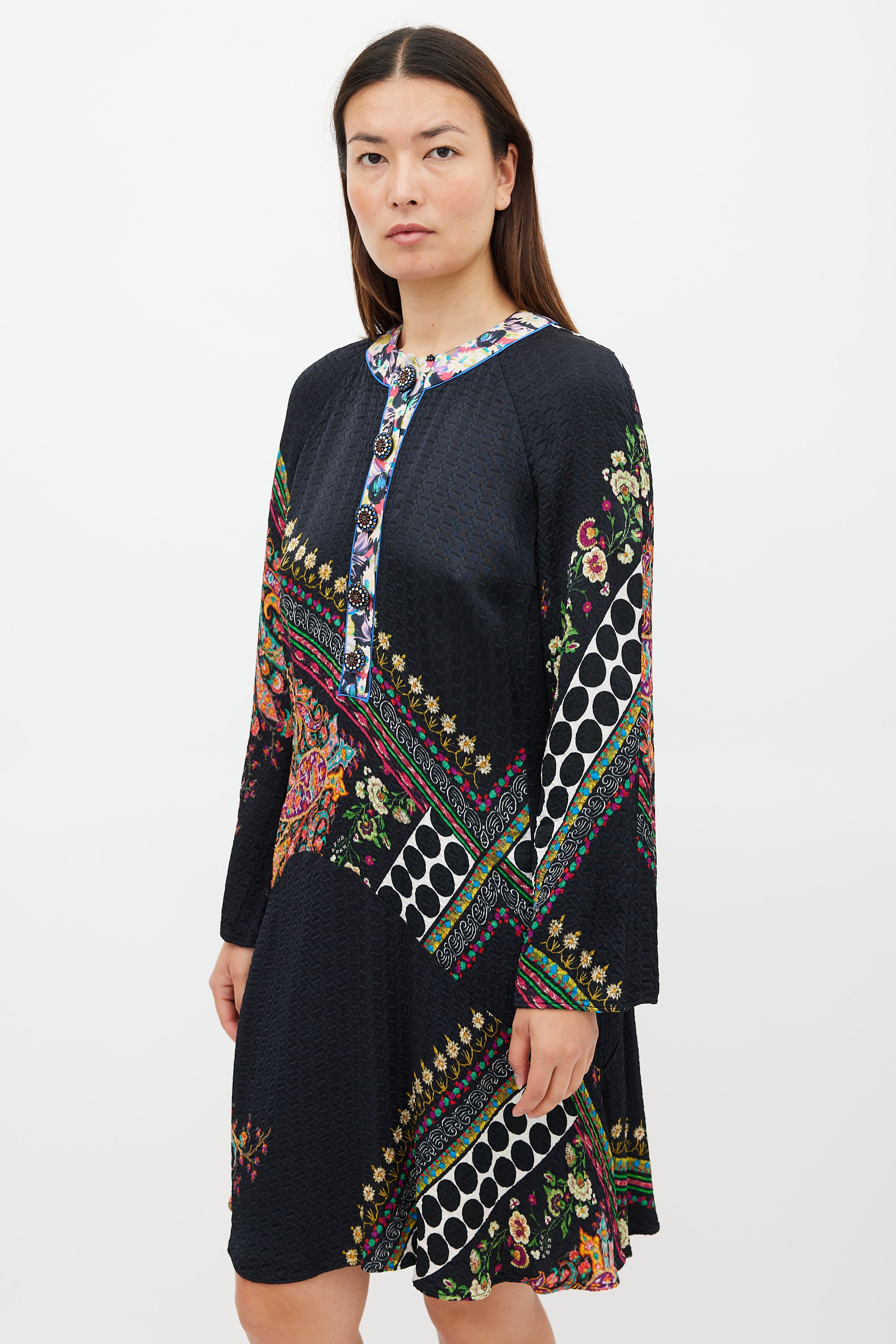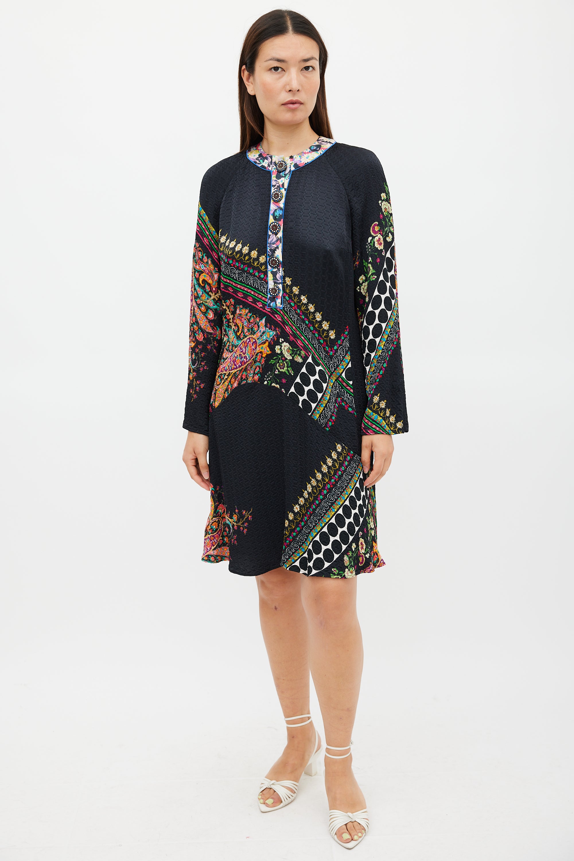 Pre-owned Etro black and multicolour midi dress featuring a round neck, half button up front, panelled construction, mixed floral, paisley, and polka dot prints throughout, and long sleeves. Lined.