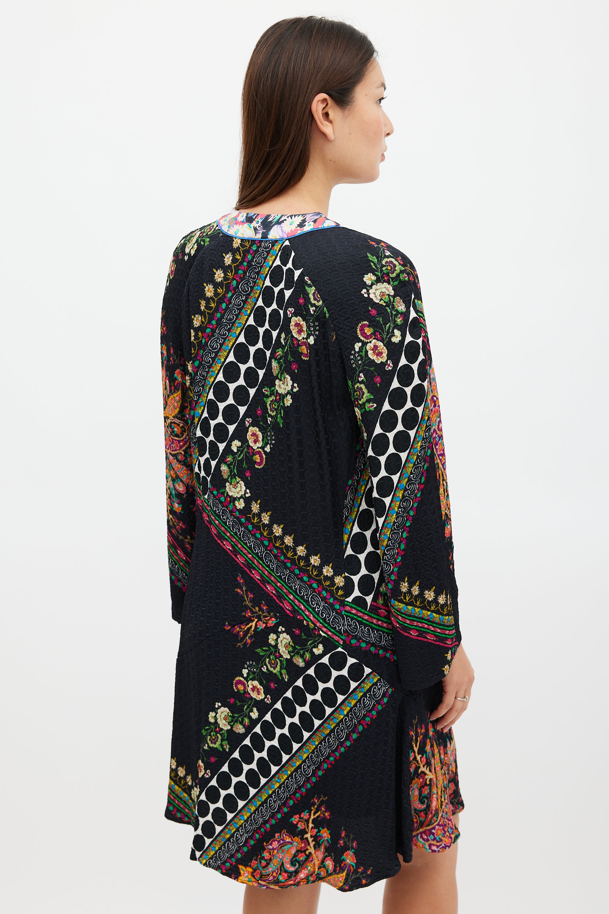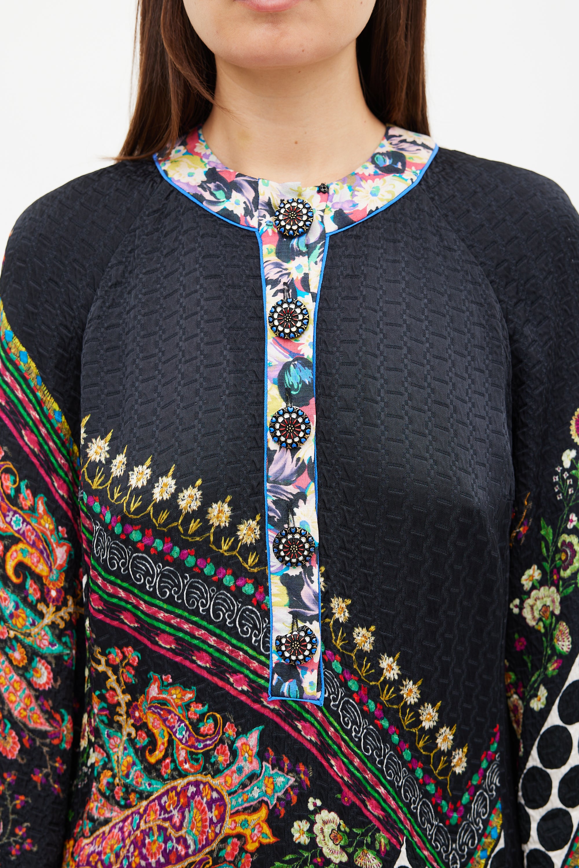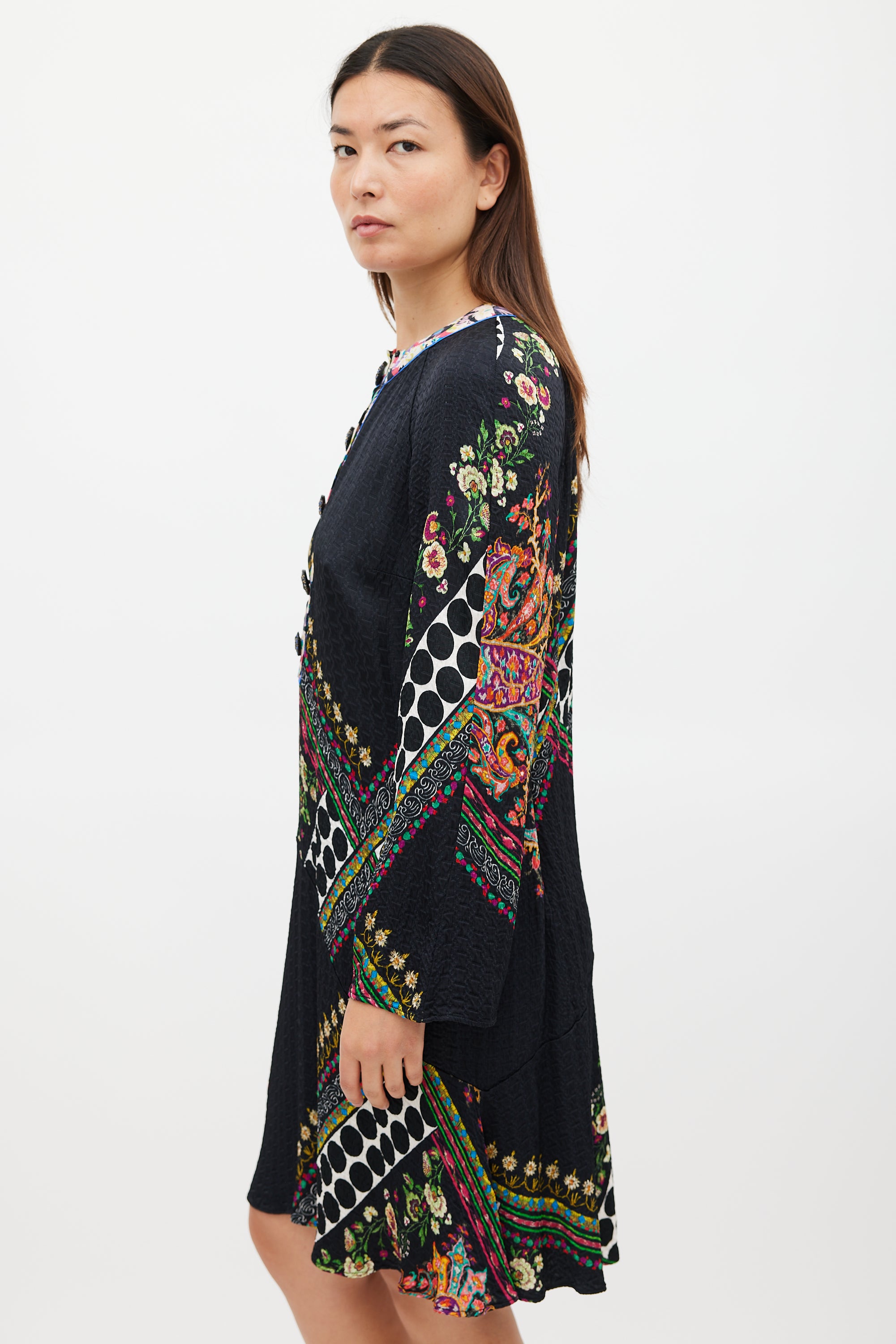 Pre-owned Etro black and multicolour midi dress featuring a round neck, half button up front, panelled construction, mixed floral, paisley, and polka dot prints throughout, and long sleeves. Lined.