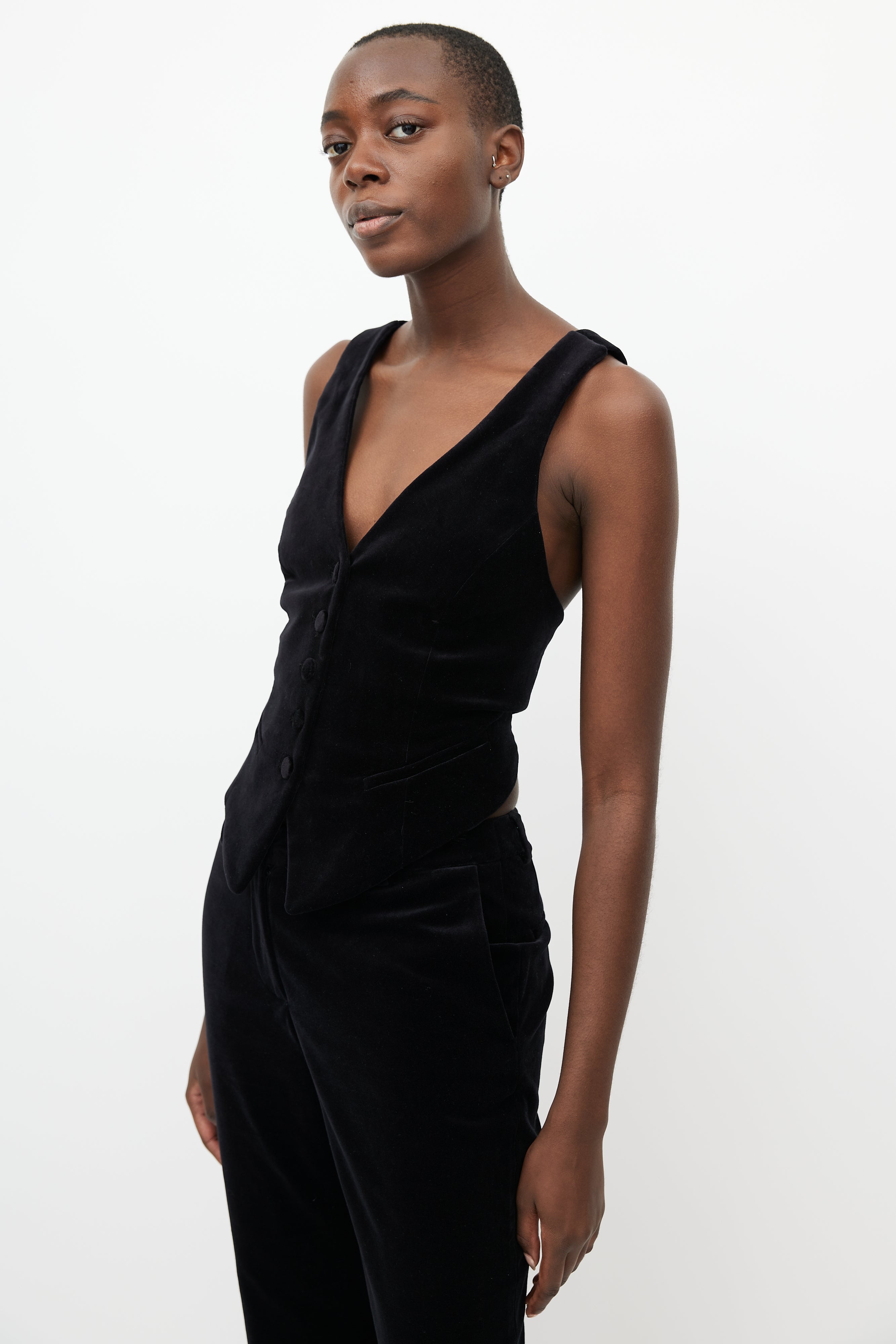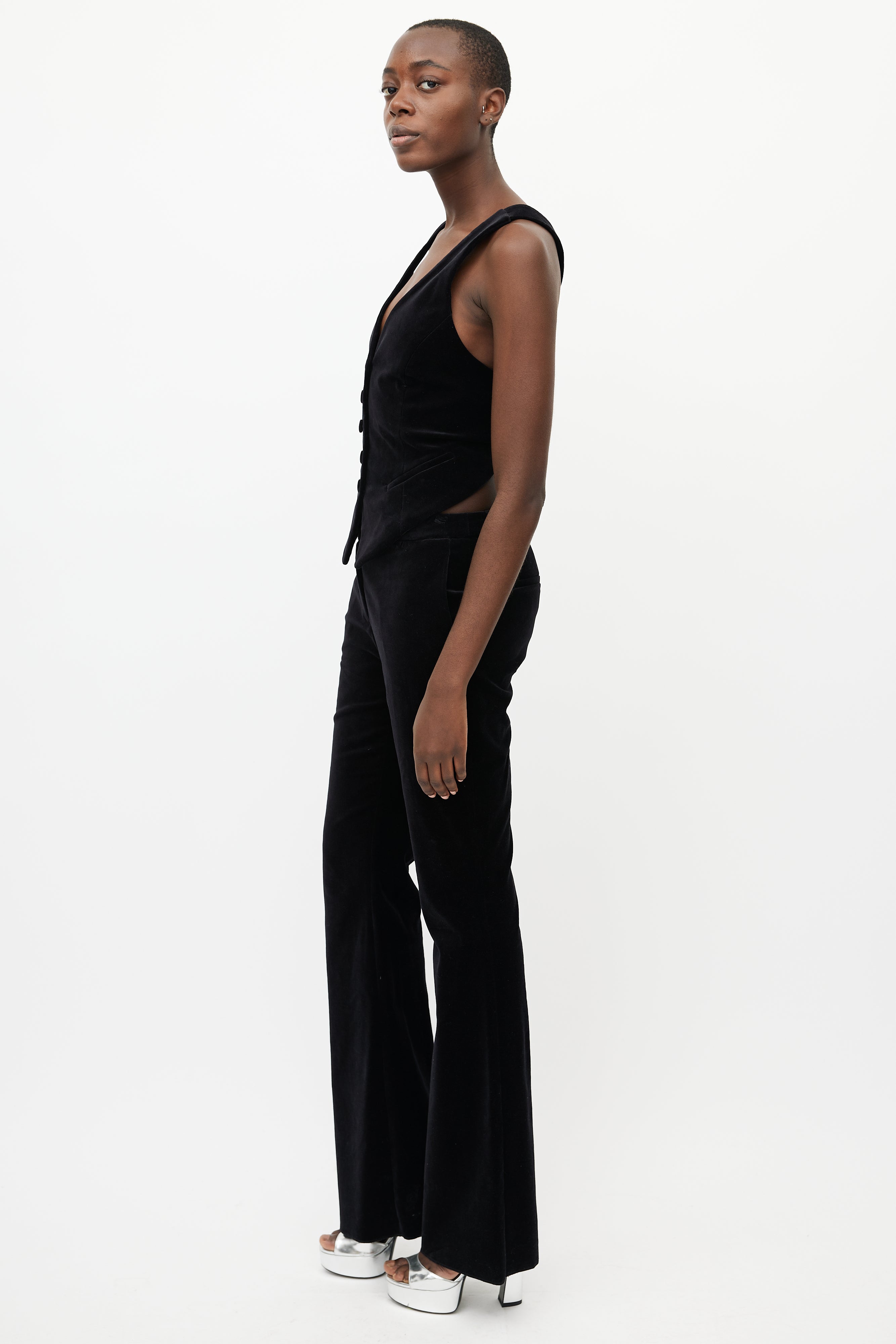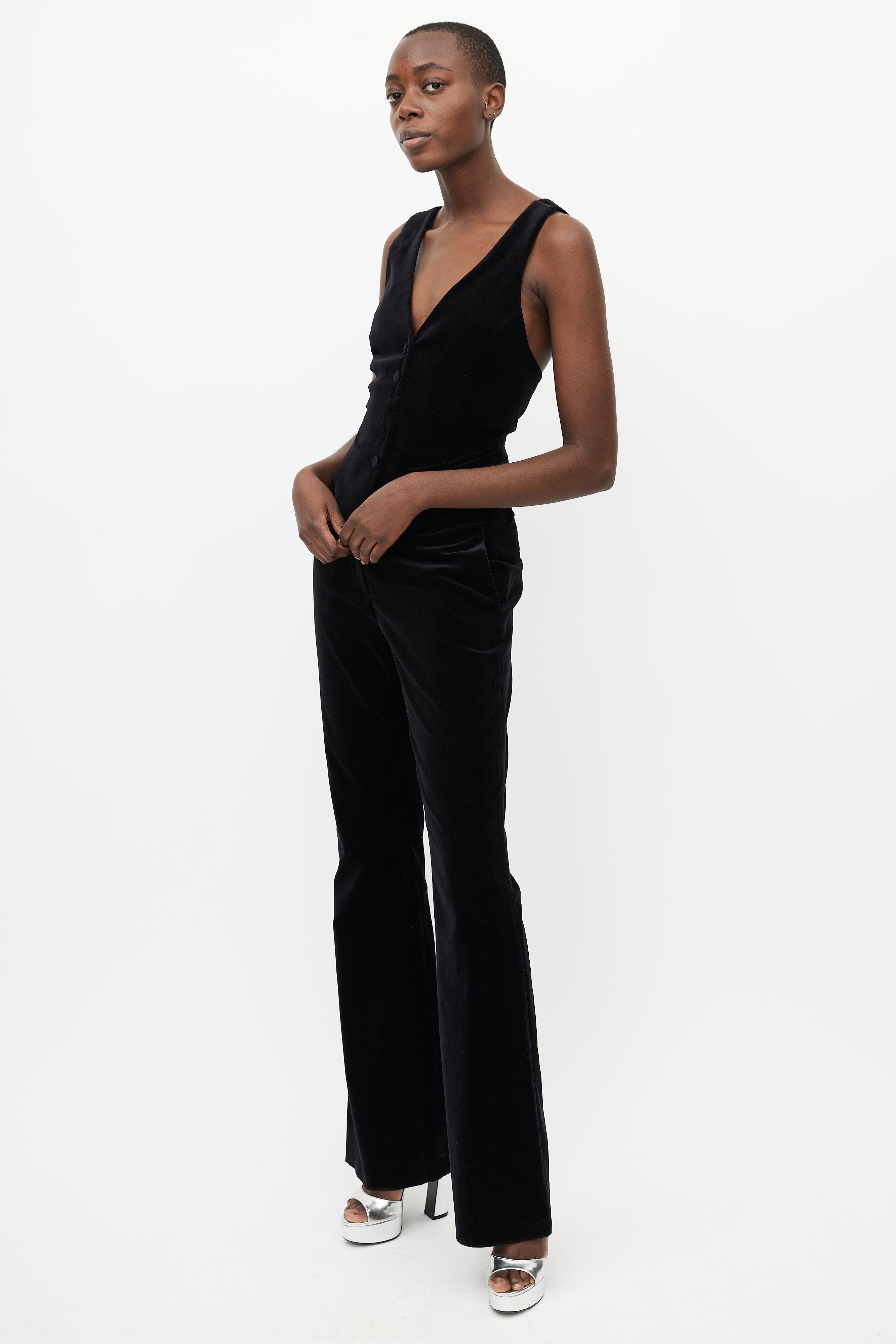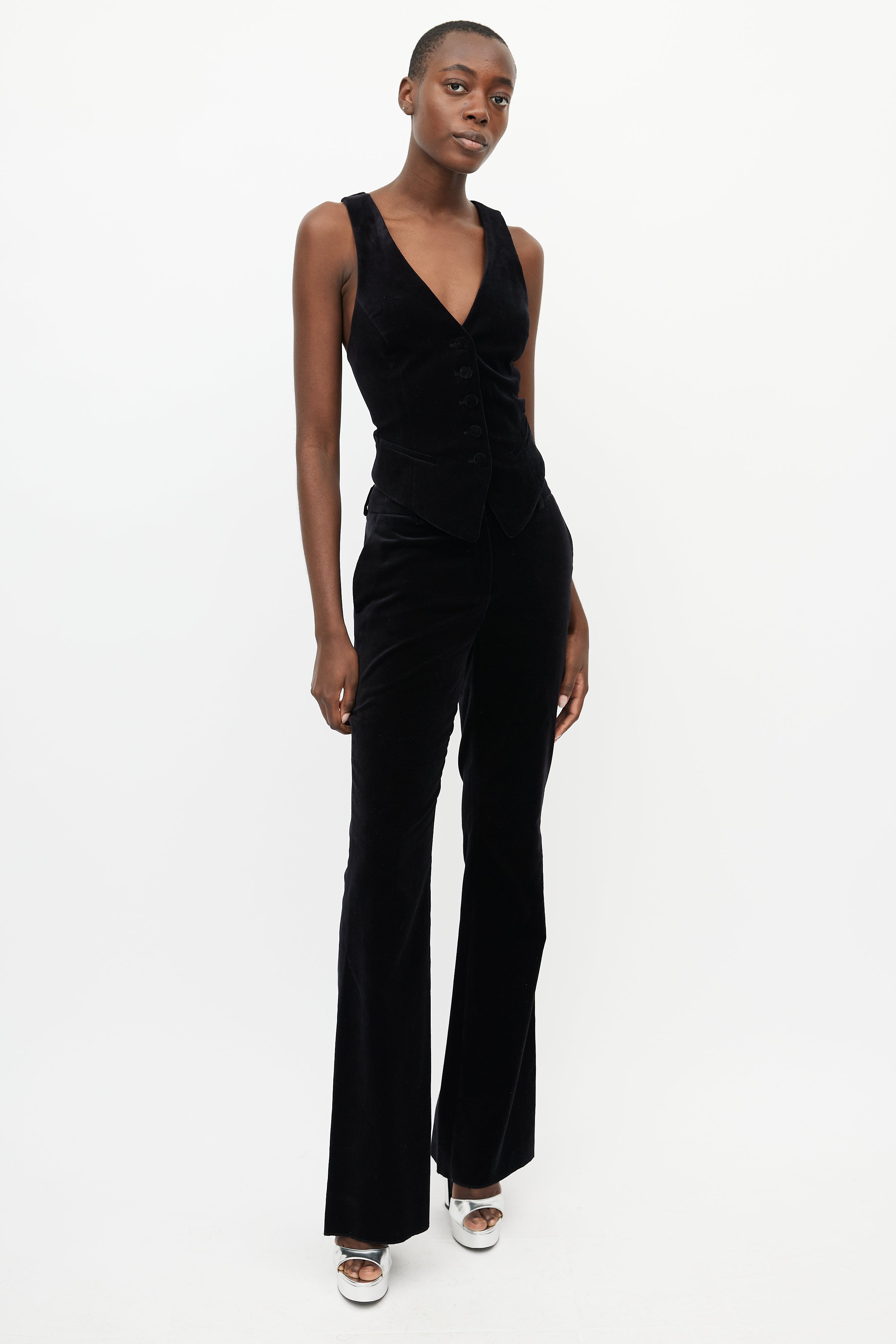 Pre-owned Etro black velvet vest featuring criss cross back, button up front, V-neckline, and two welt pockets at hips. Matching pants featuring flared legs, zip fly, belt loops, two slash pockets at front, and two welt pockets at back. Lined.