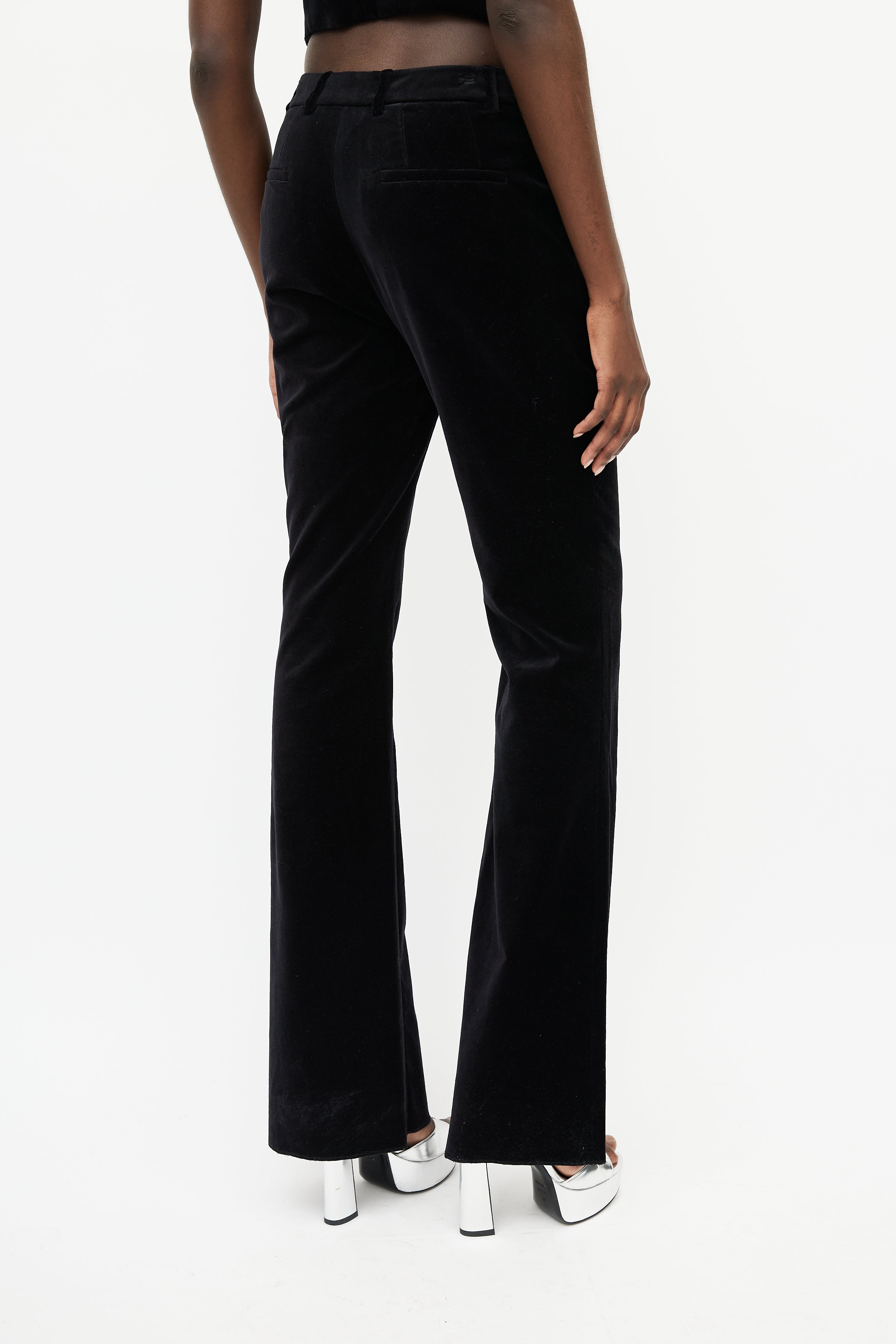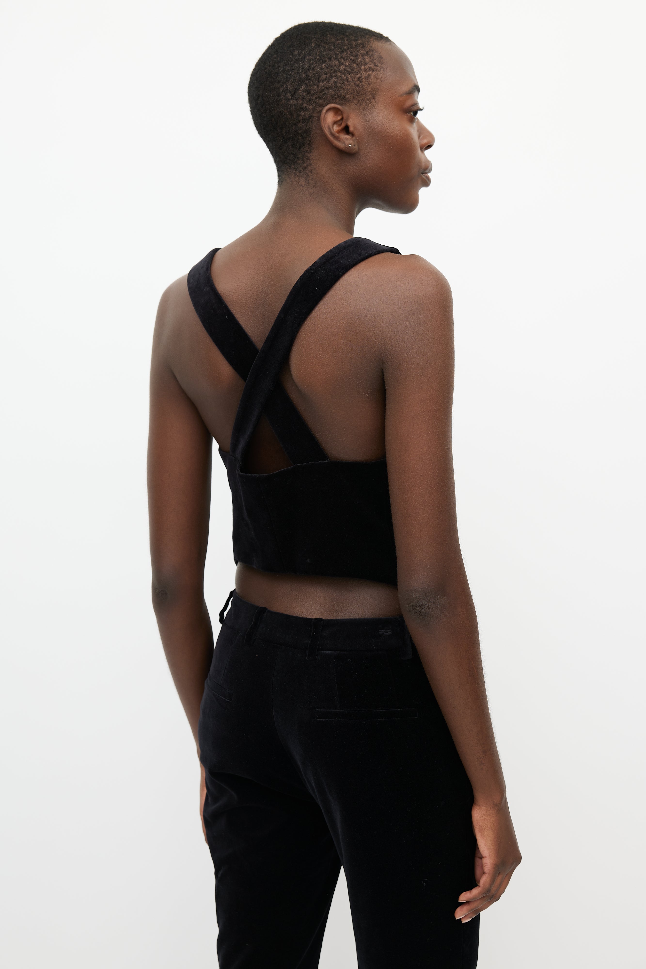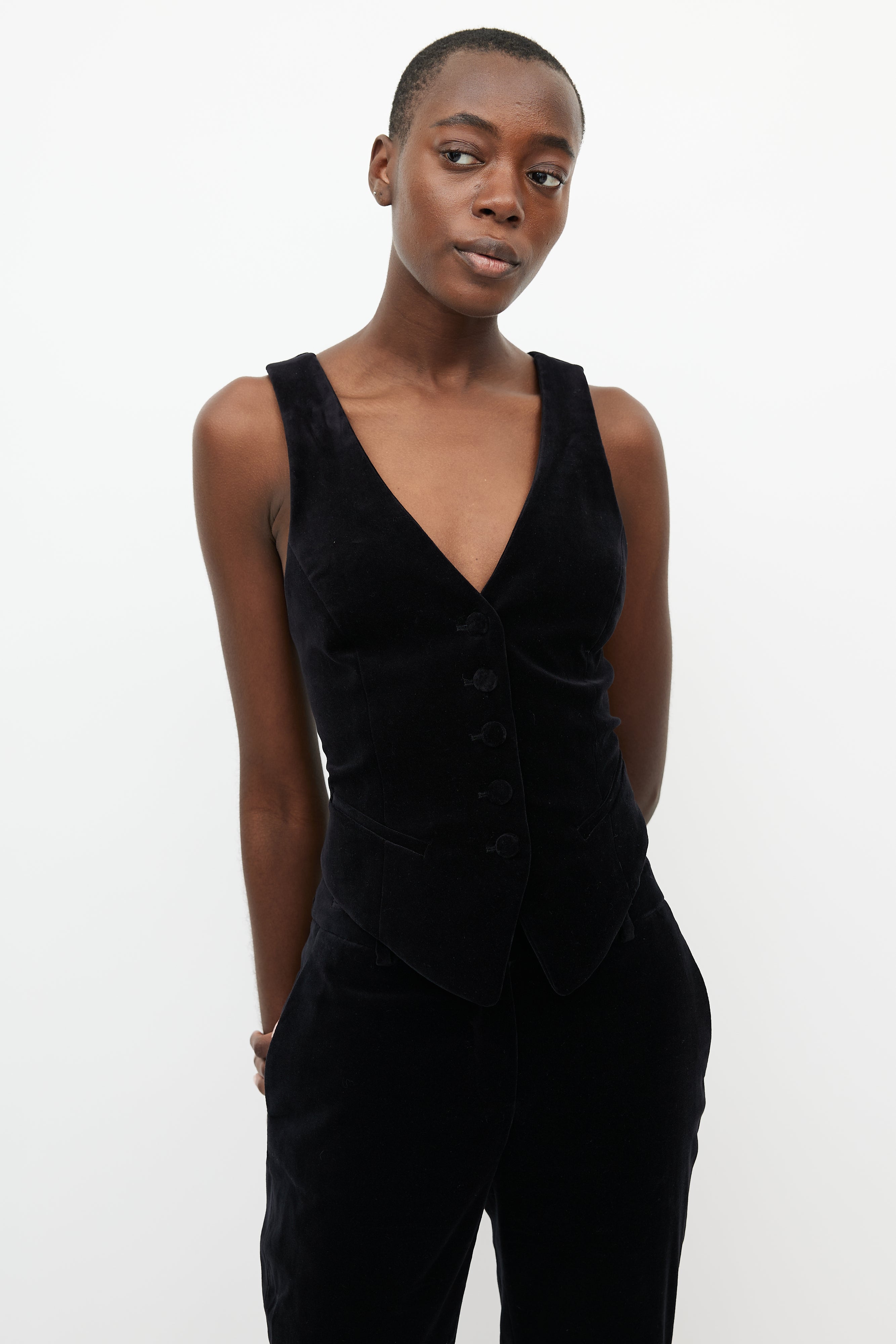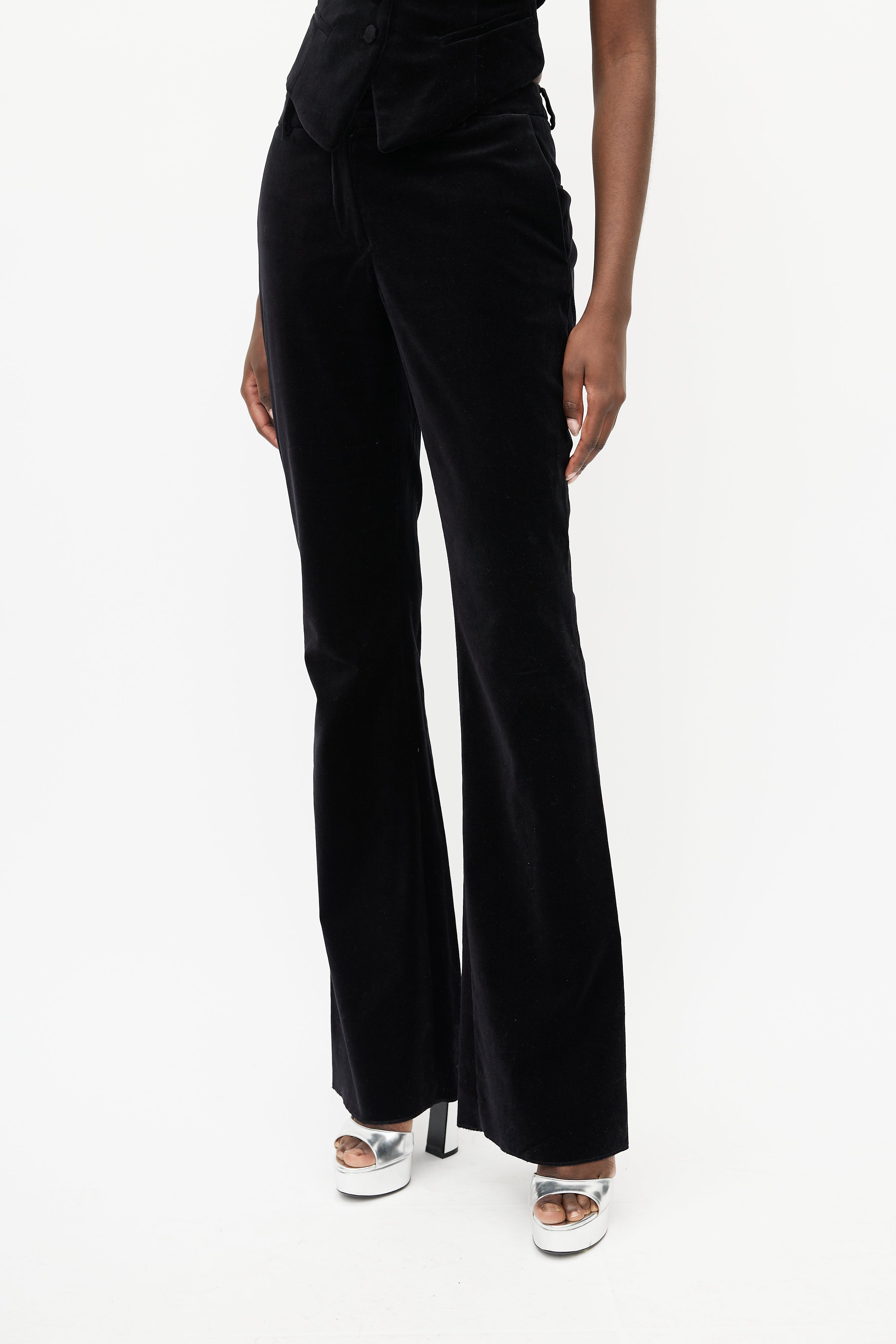 Pre-owned Etro black velvet vest featuring criss cross back, button up front, V-neckline, and two welt pockets at hips. Matching pants featuring flared legs, zip fly, belt loops, two slash pockets at front, and two welt pockets at back. Lined.