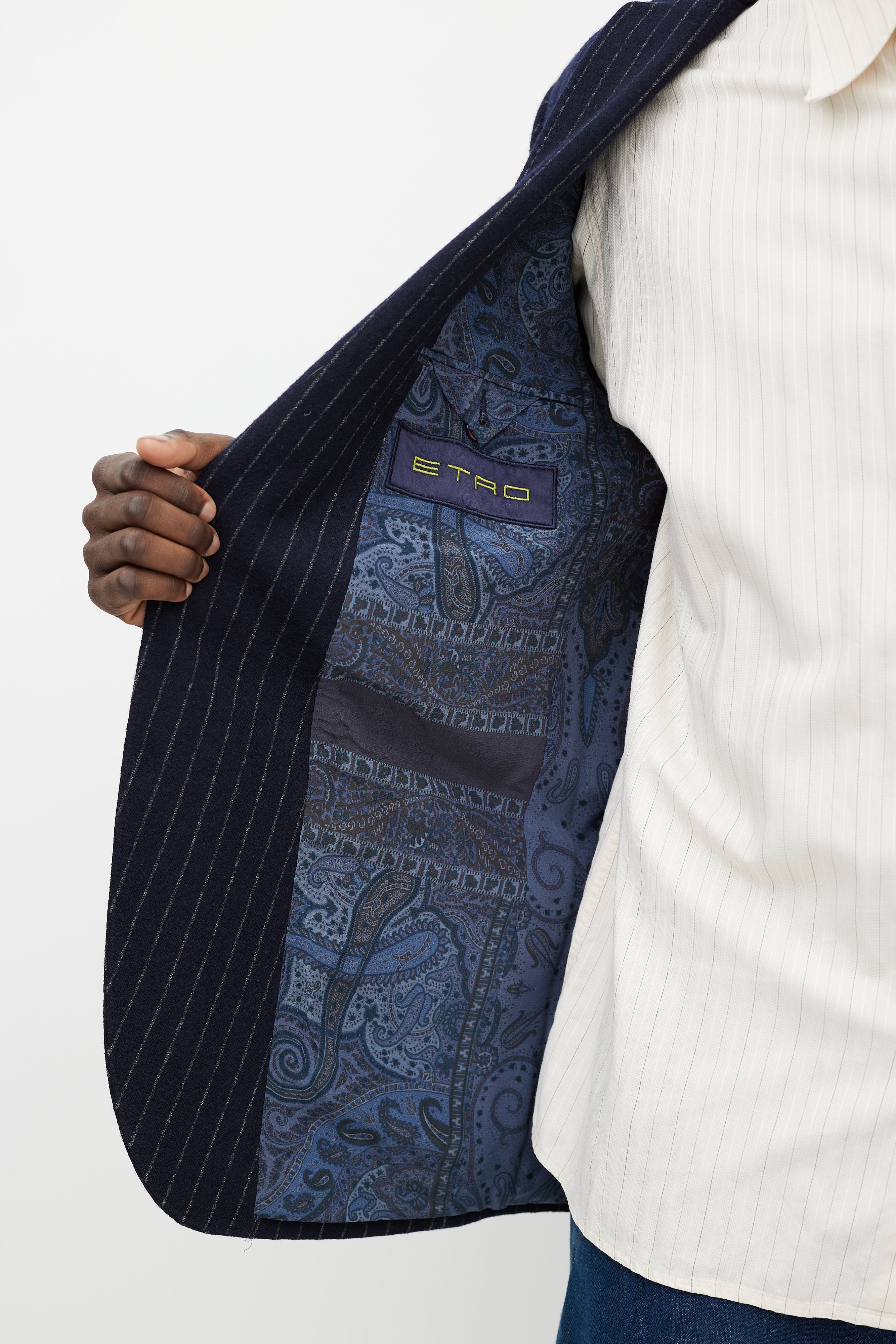 Pre-owned Etro blue pinstripe blazer featuring notched lapel, two vents at back, two button front closure and two flap pockets at front. Silk lined.