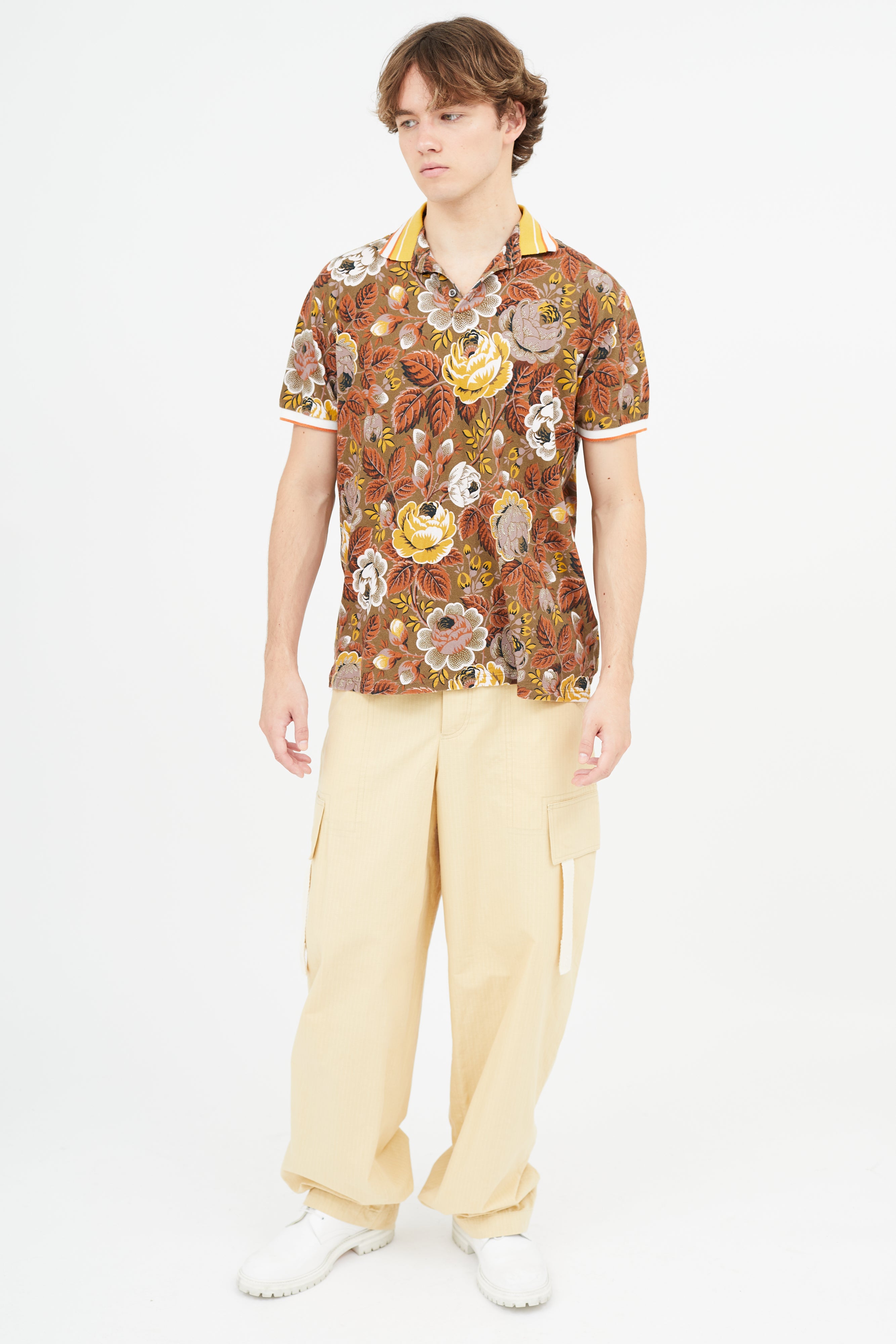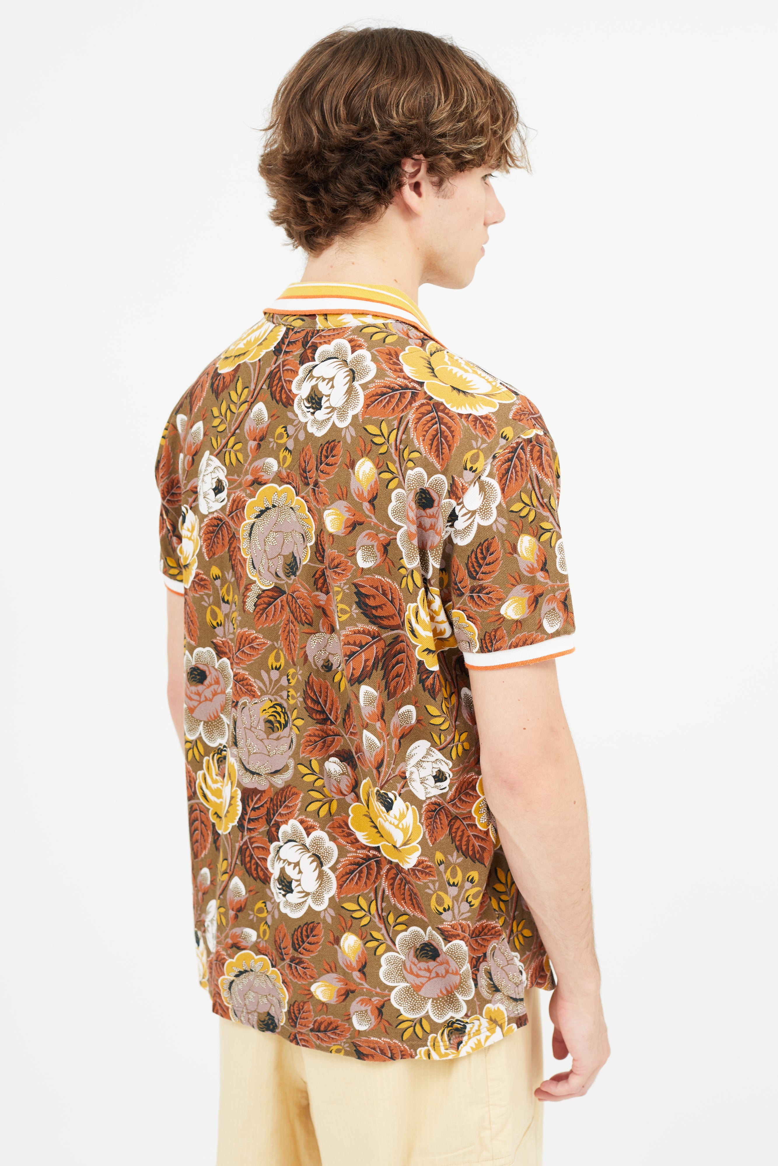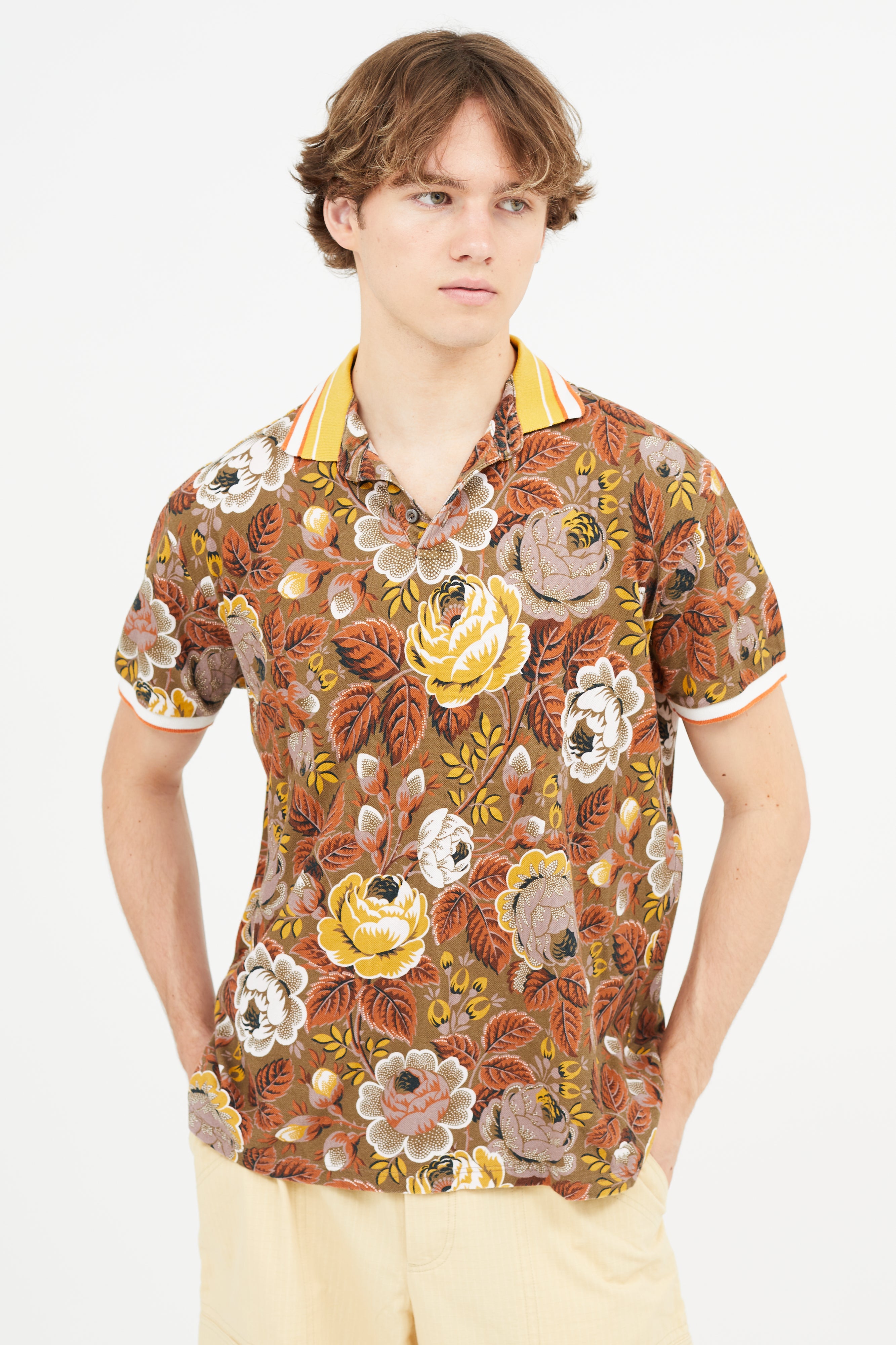 Pre-owned Etro brown polo shirt featuring yellow and orange collar, quarter button up front, floral print, and ribbed cuffs.