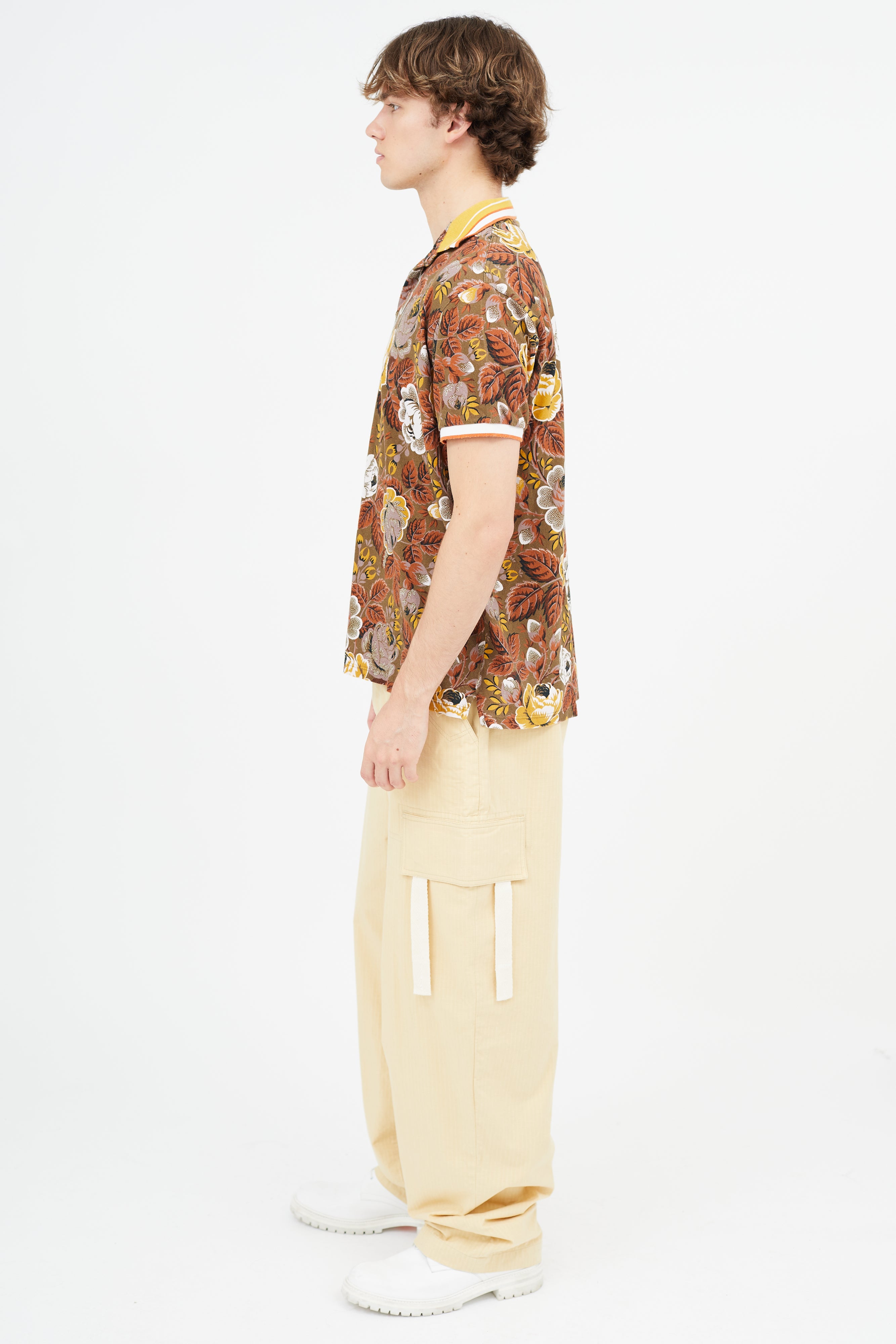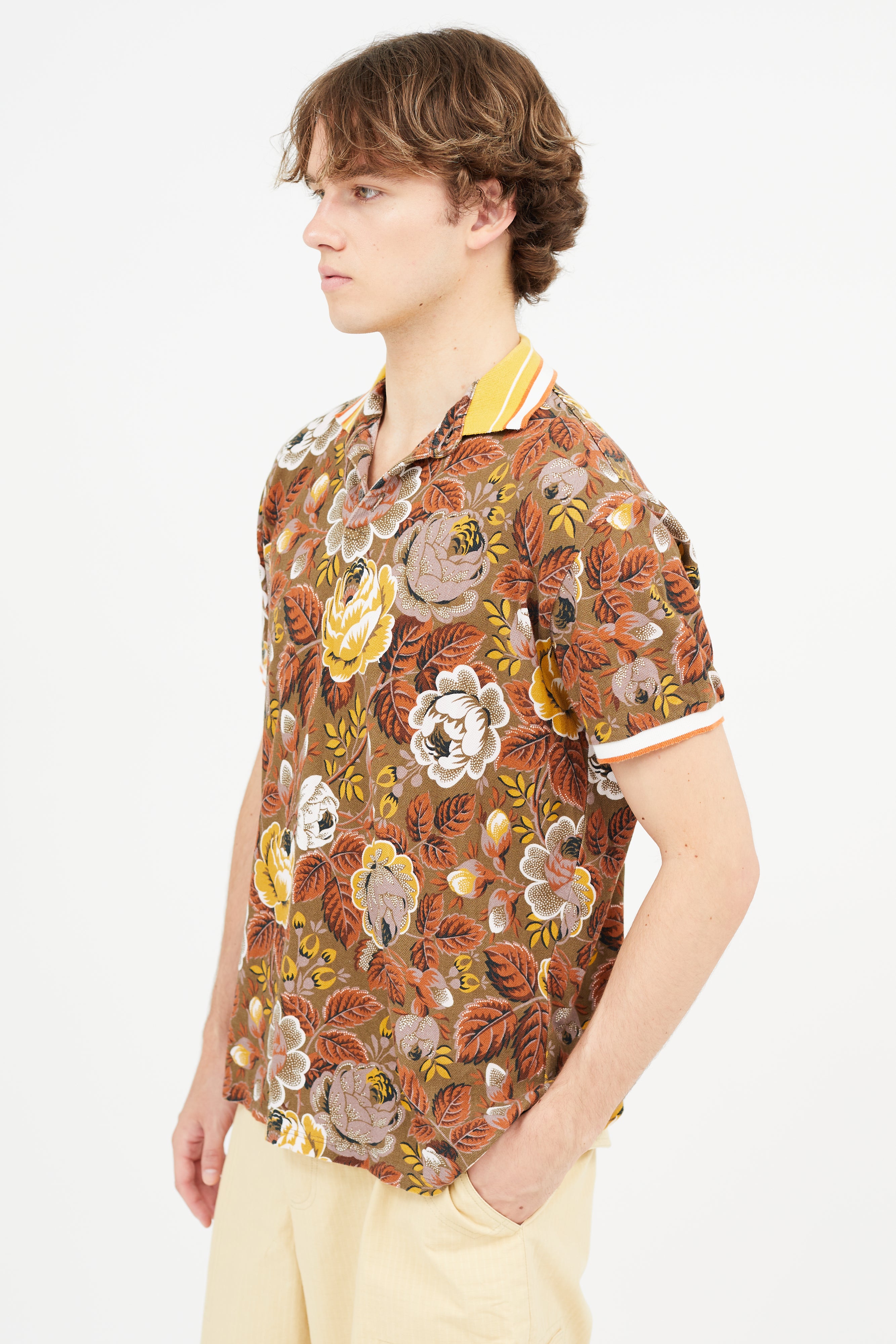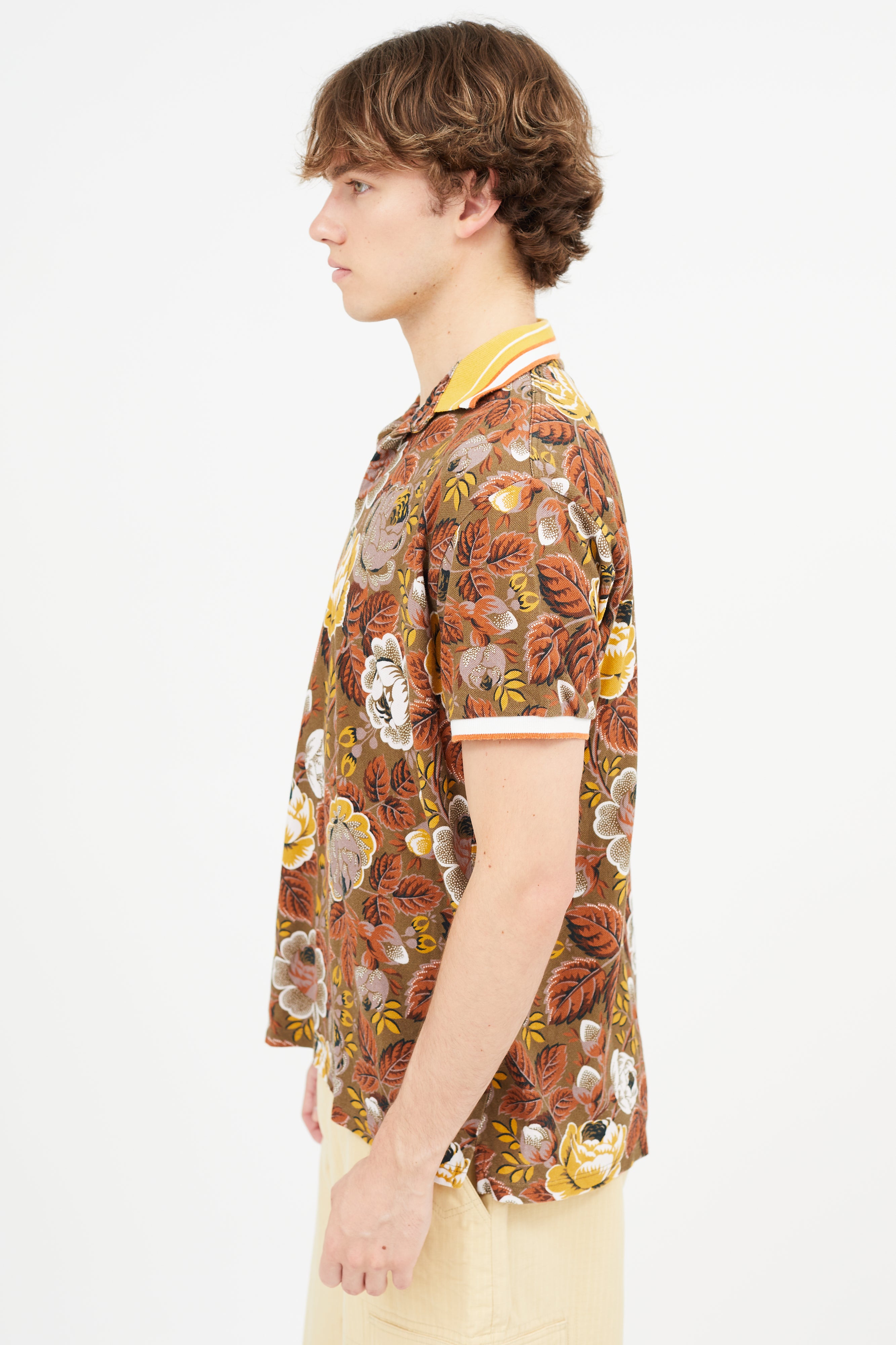 Pre-owned Etro brown polo shirt featuring yellow and orange collar, quarter button up front, floral print, and ribbed cuffs.