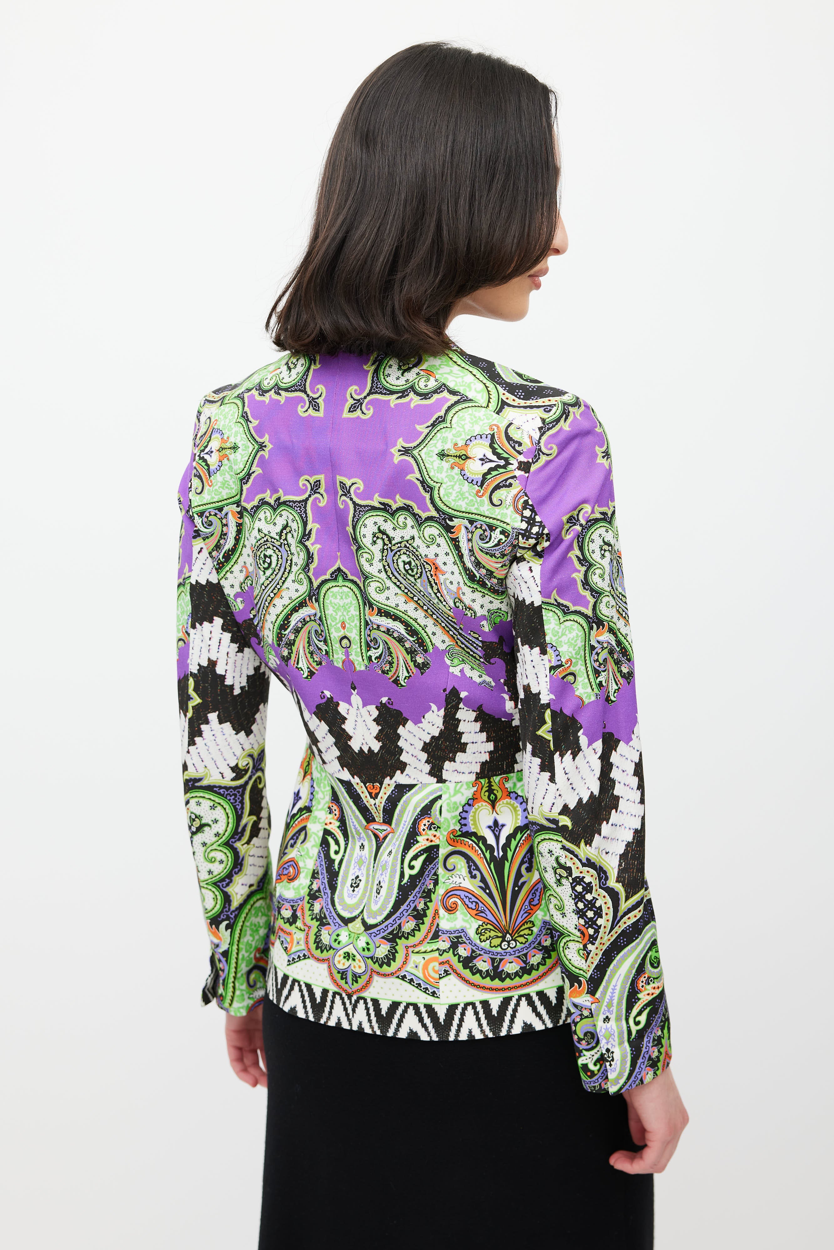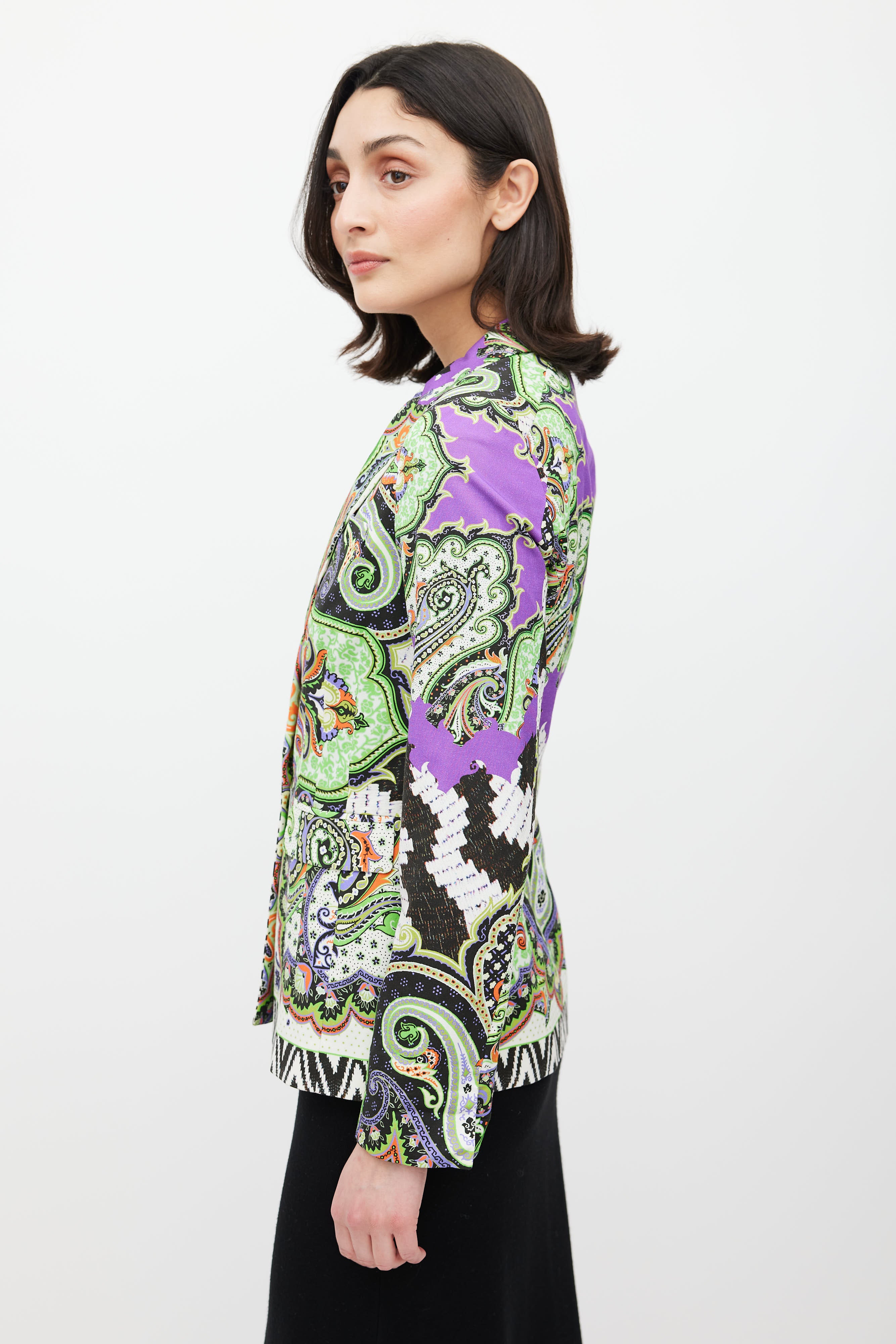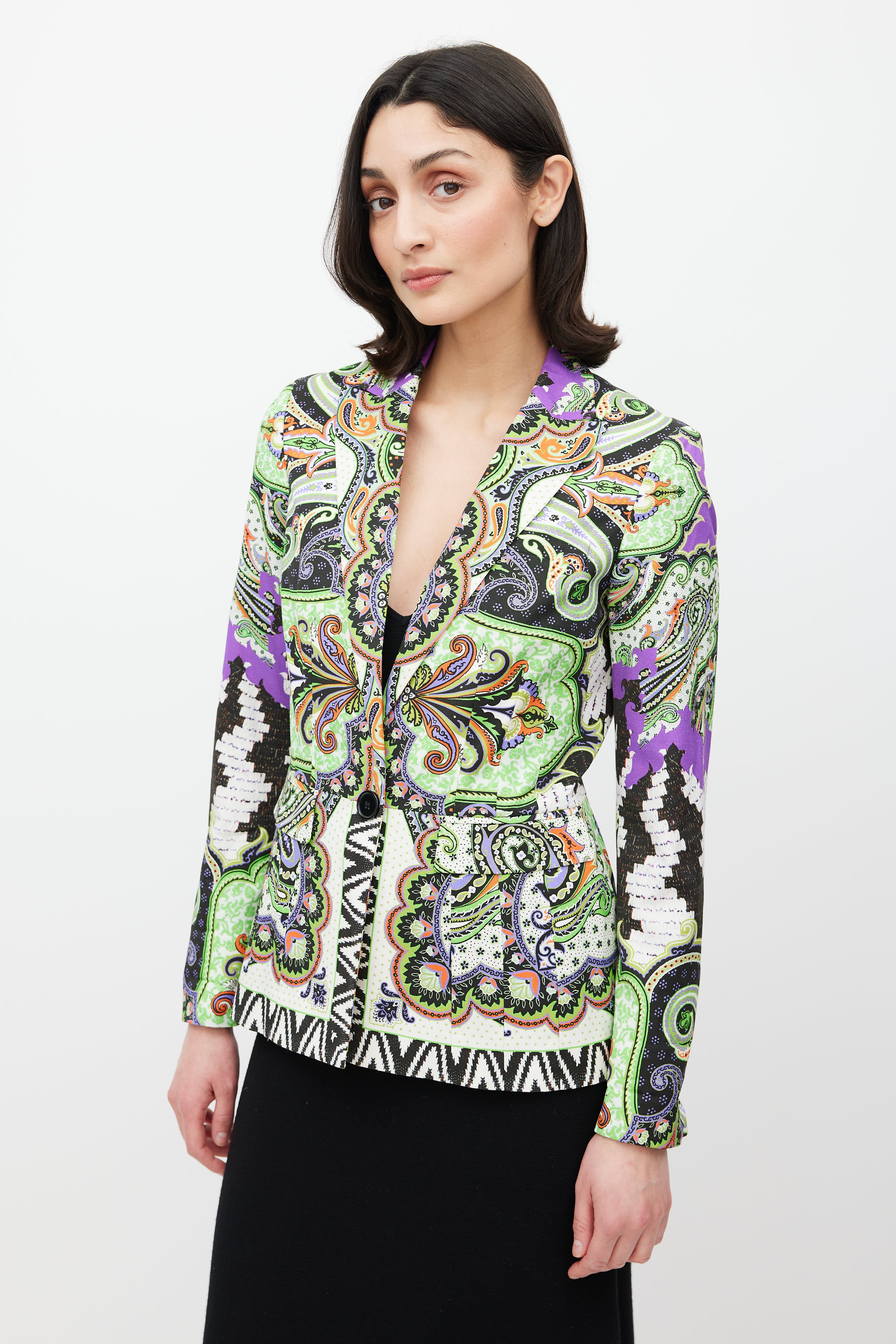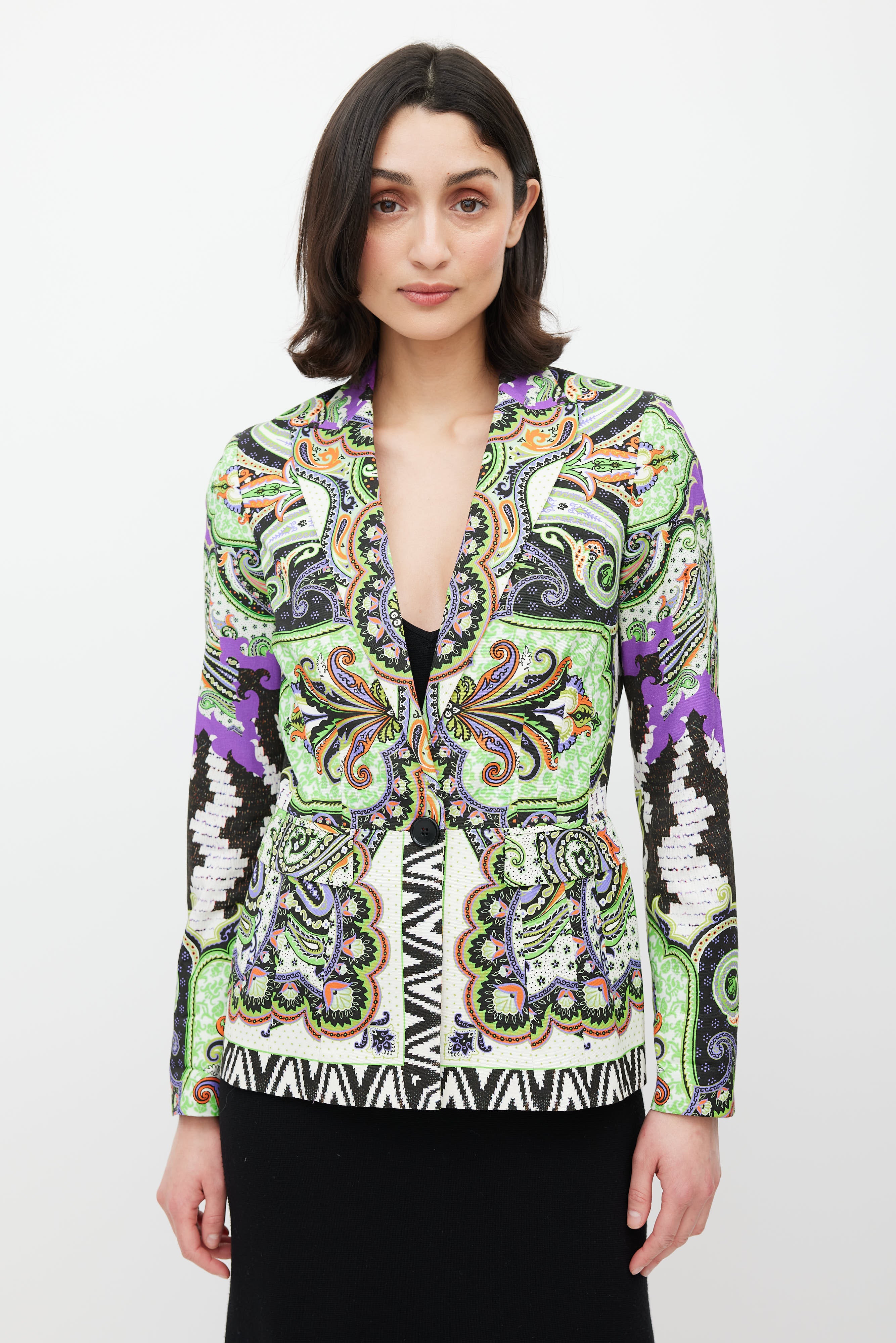 Pre-owned Etro green blazer featuring a multicolour paisley pattern throughout, peak lapel, long sleeves, one welt pocket at chest, two flap pockets at hip, and button closure. Lined.