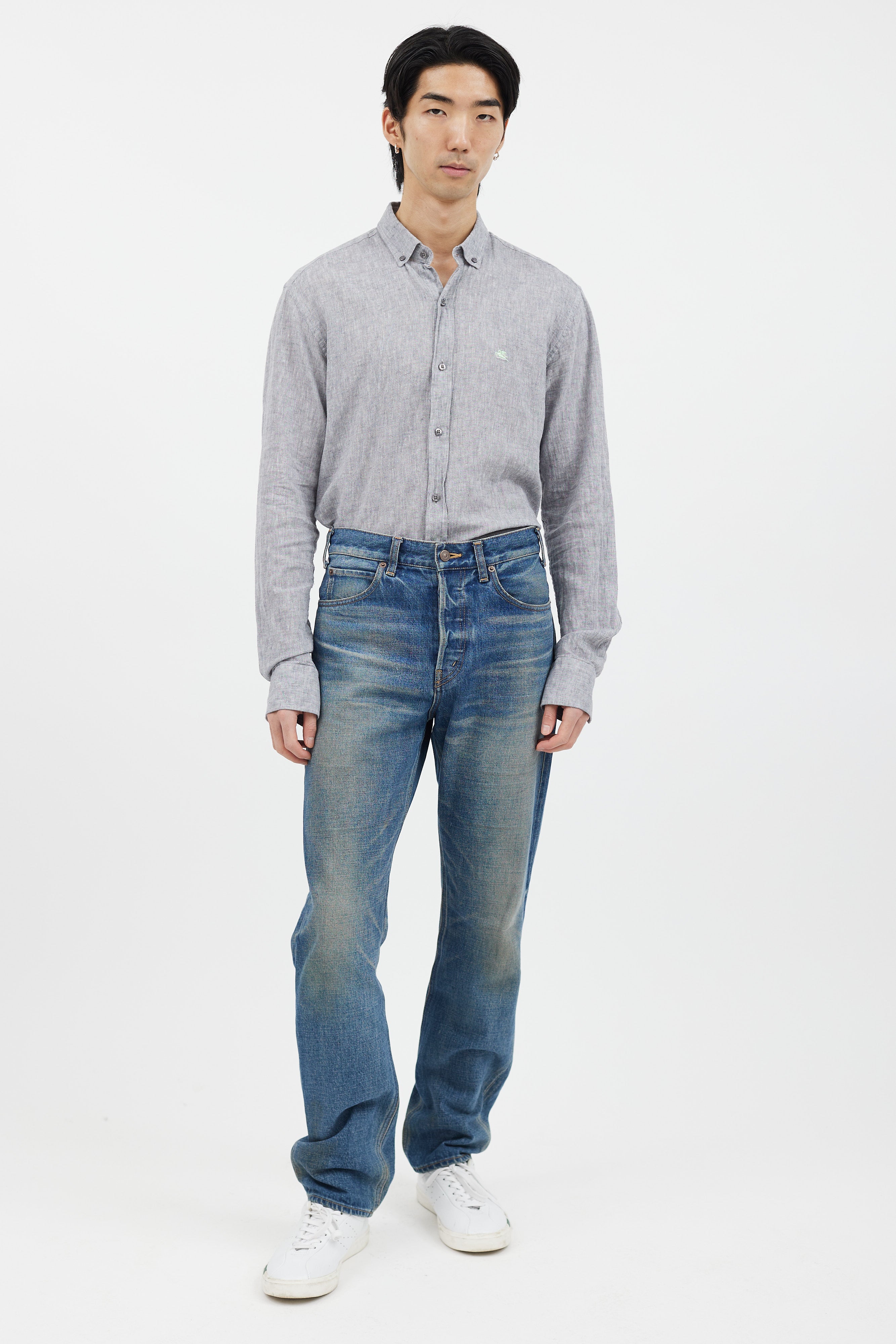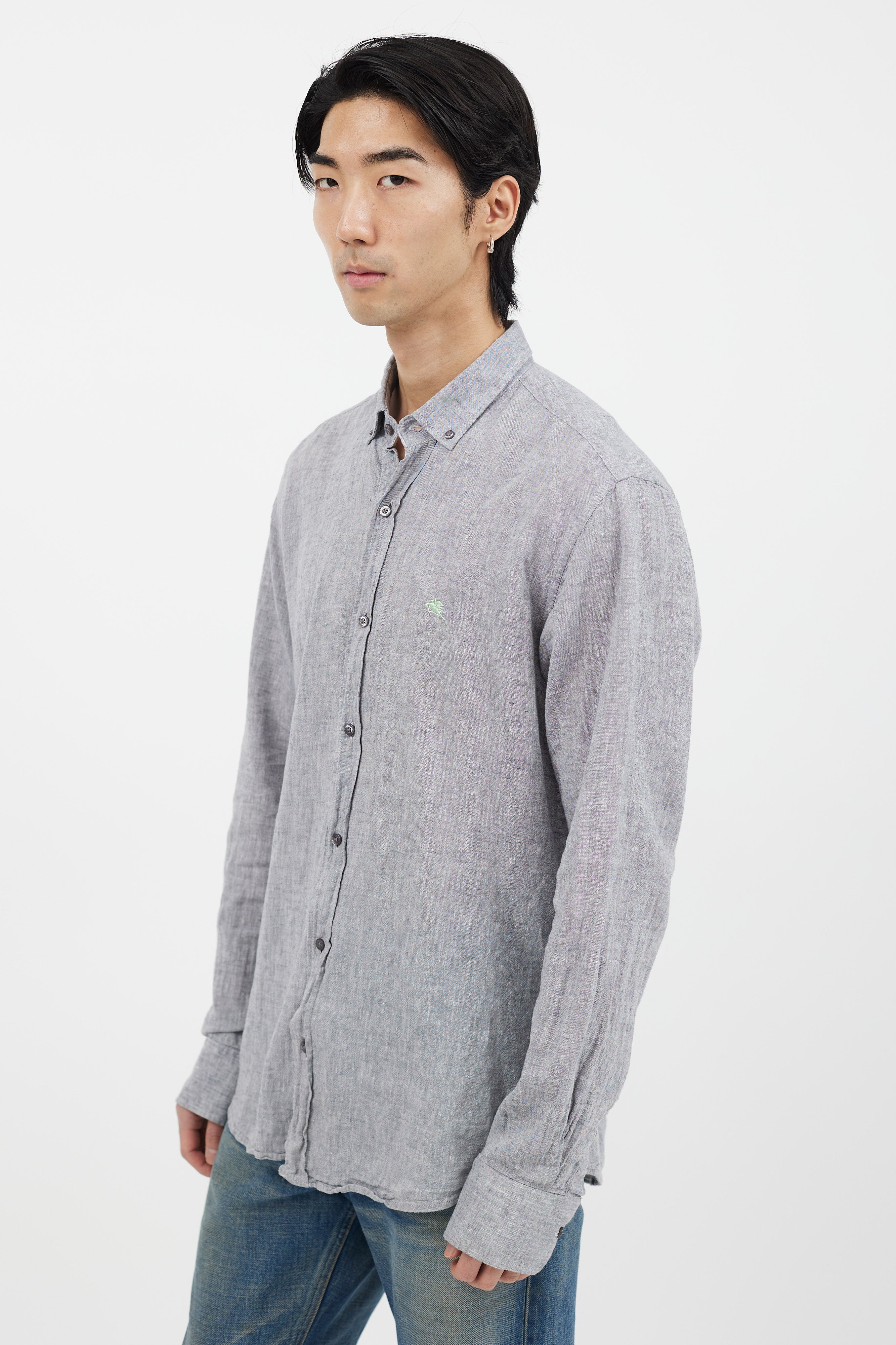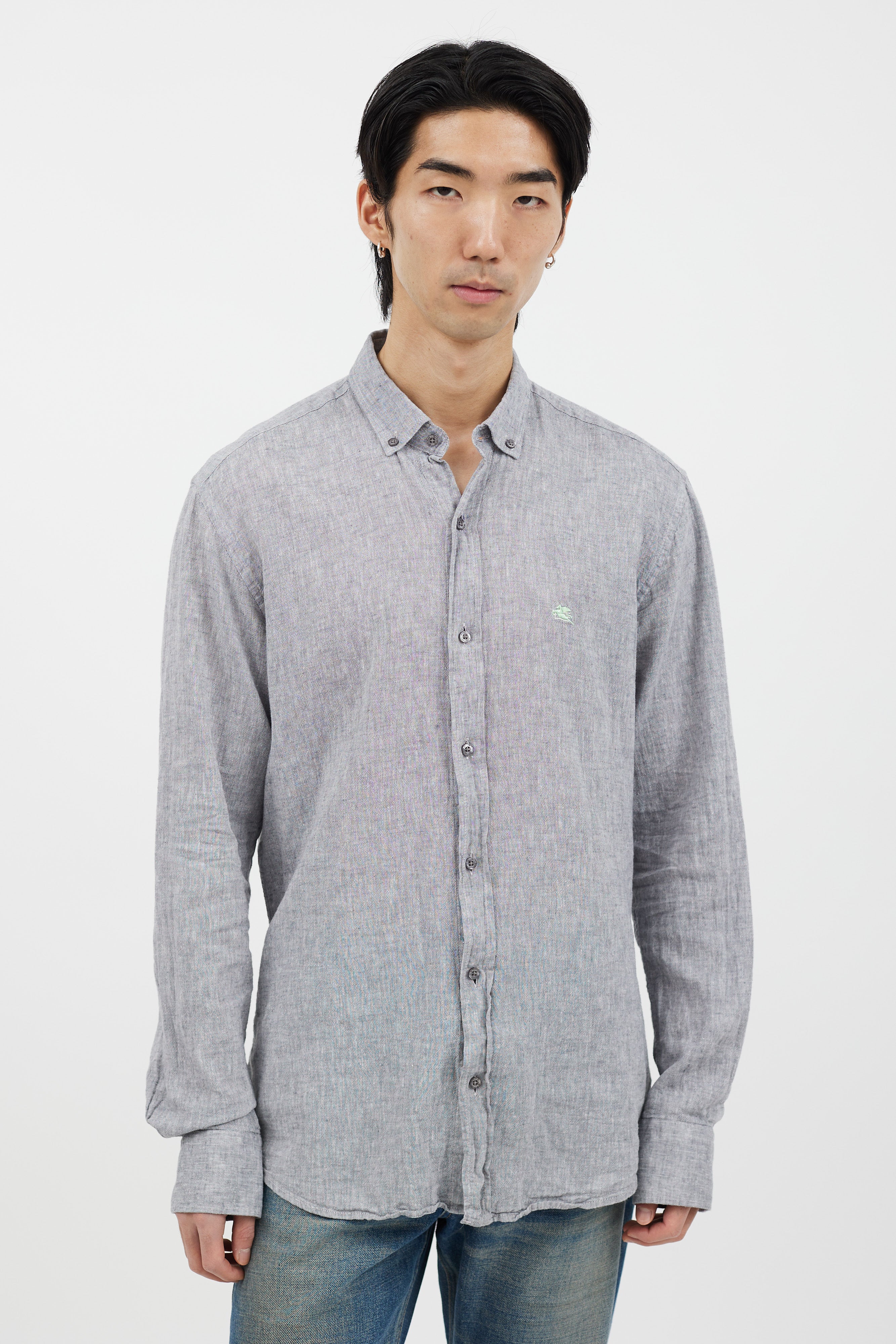 Pre-owned Etro grey chambray long sleeve shirt featuring embroidered green logo at chest, button up front, and point collar.