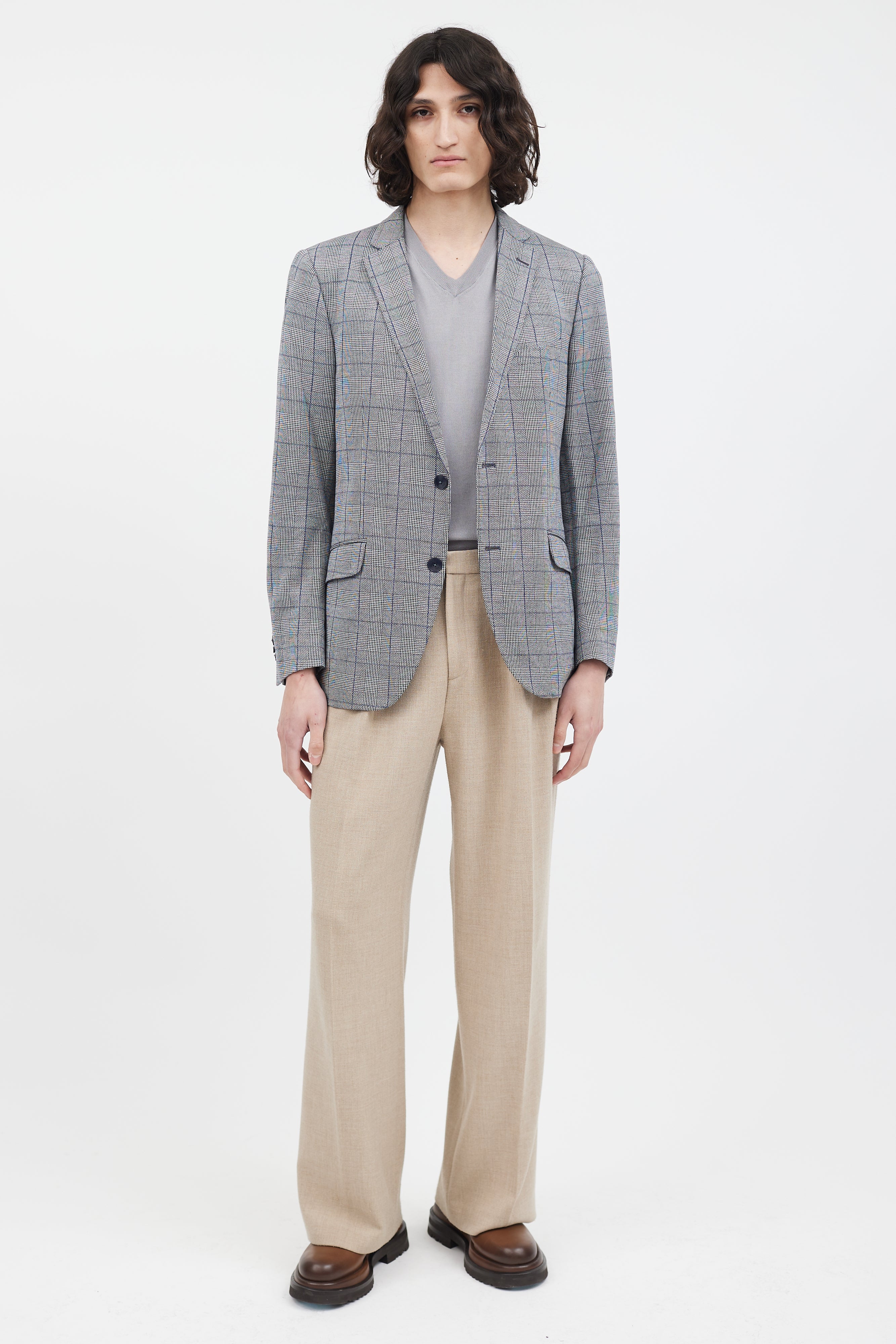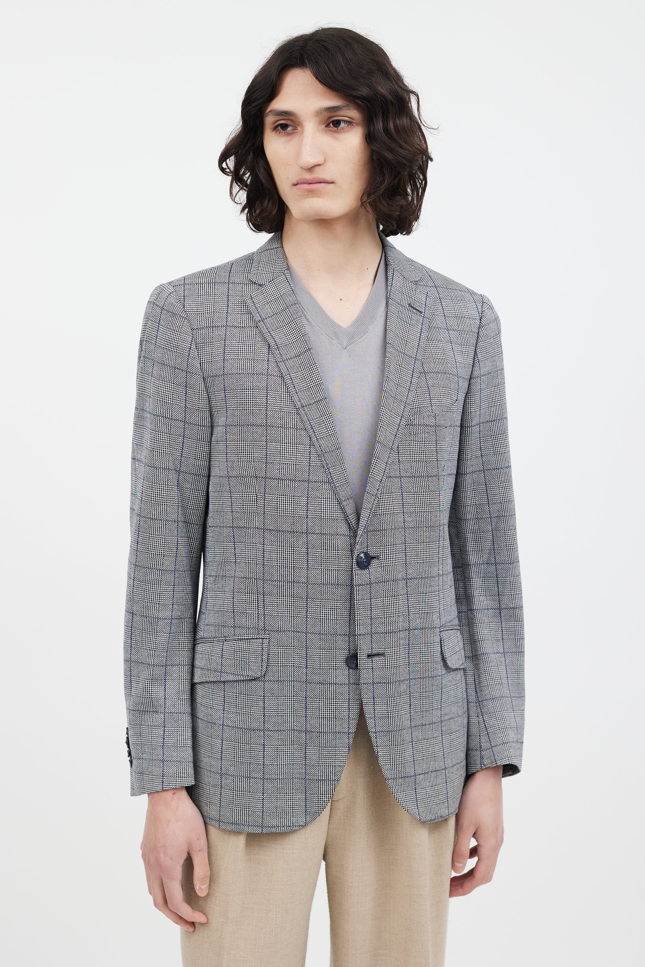 Pre-owned Etro grey and navy blazer featuring button up front, checked print, printed lining at collar and interior, one welt pocket at chest, two flap pockets at hips, buttoned cuffs, and back vents. Lined.