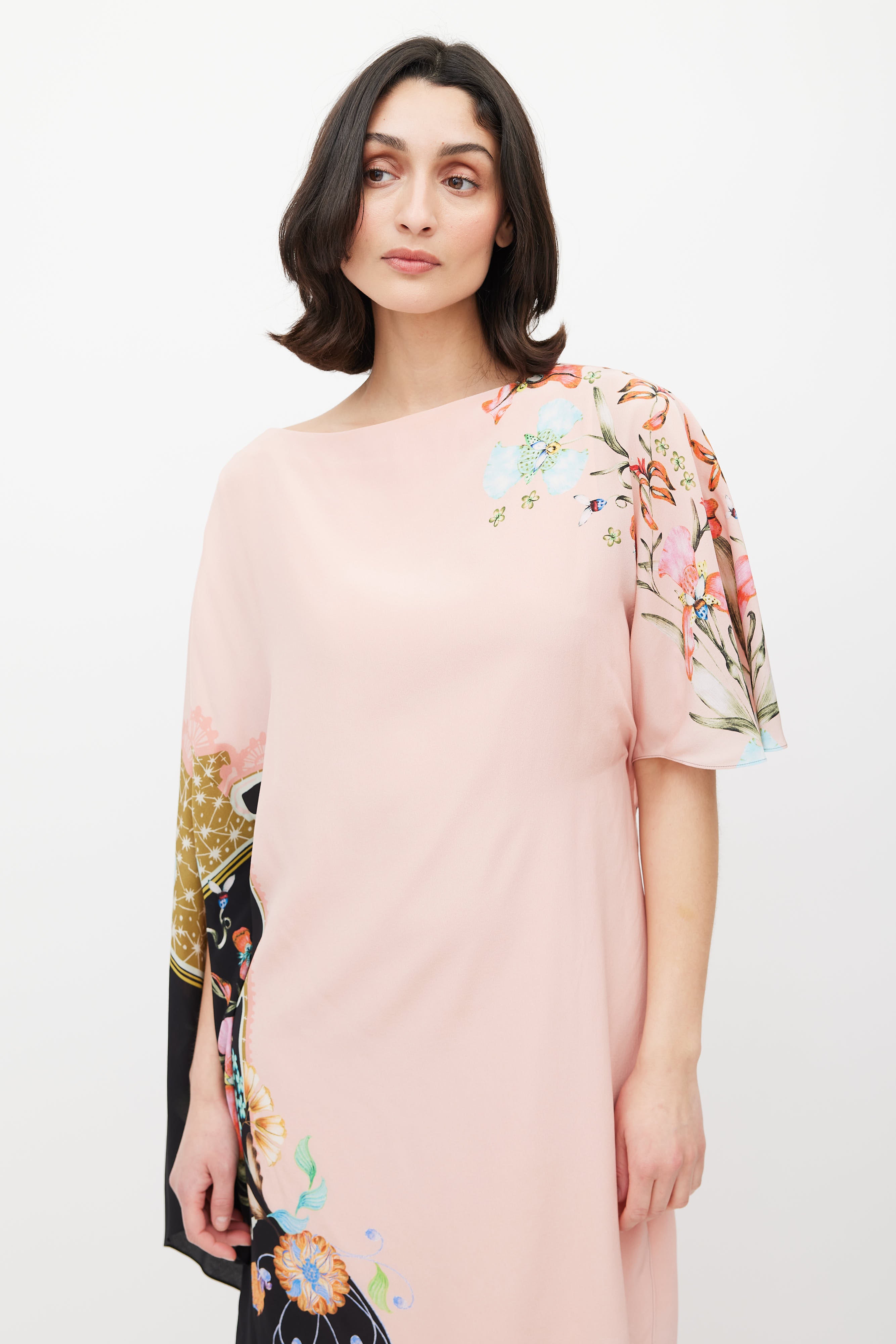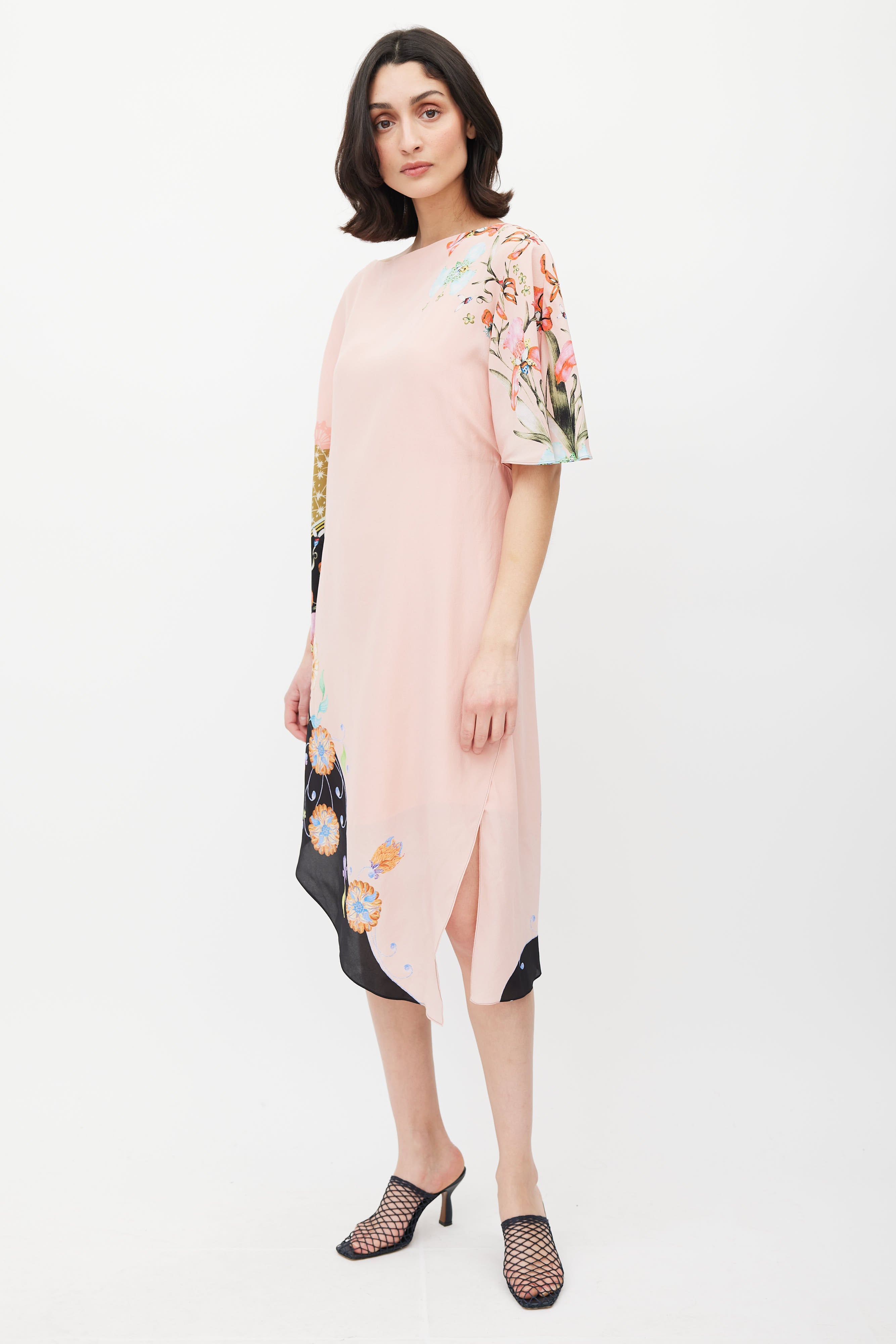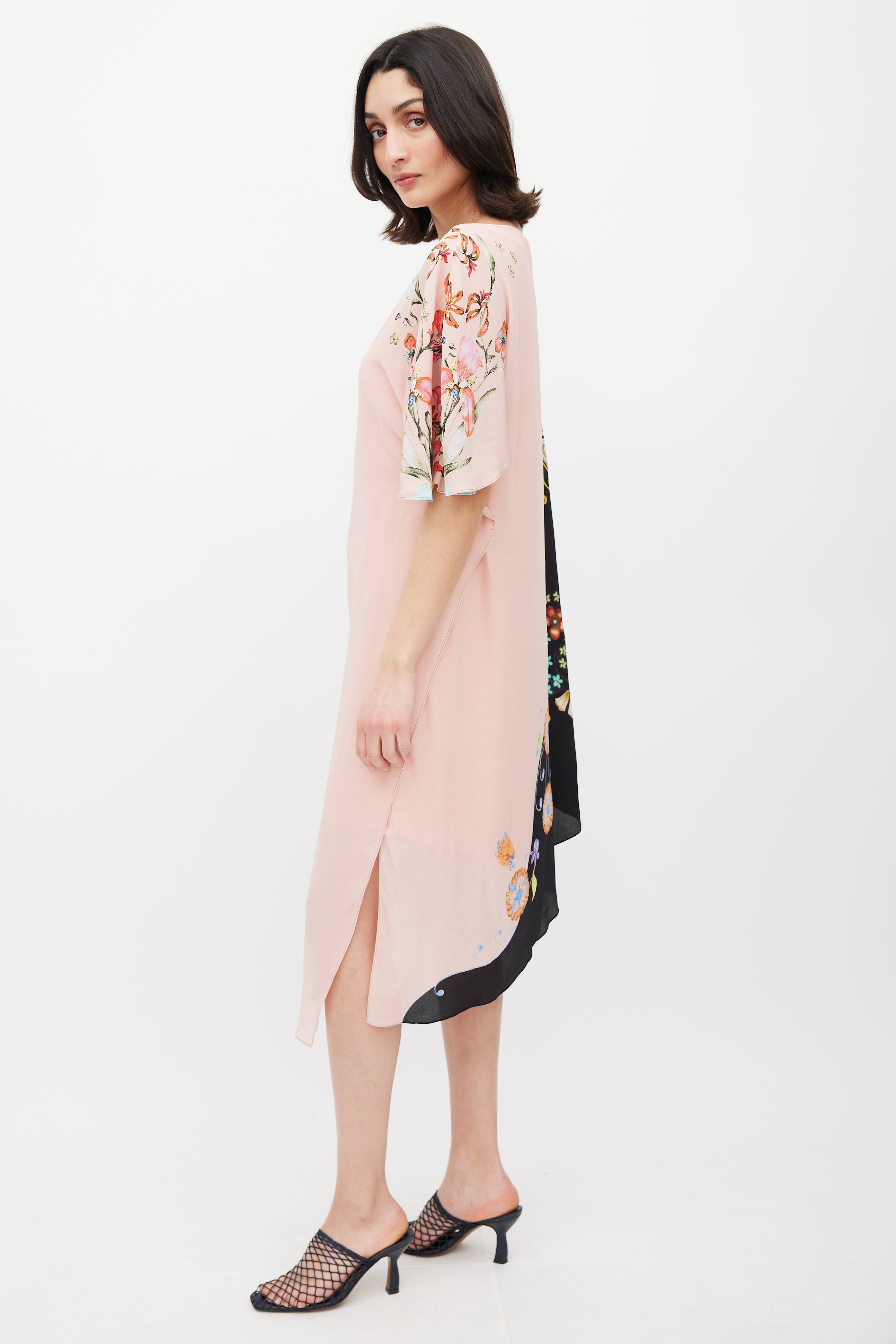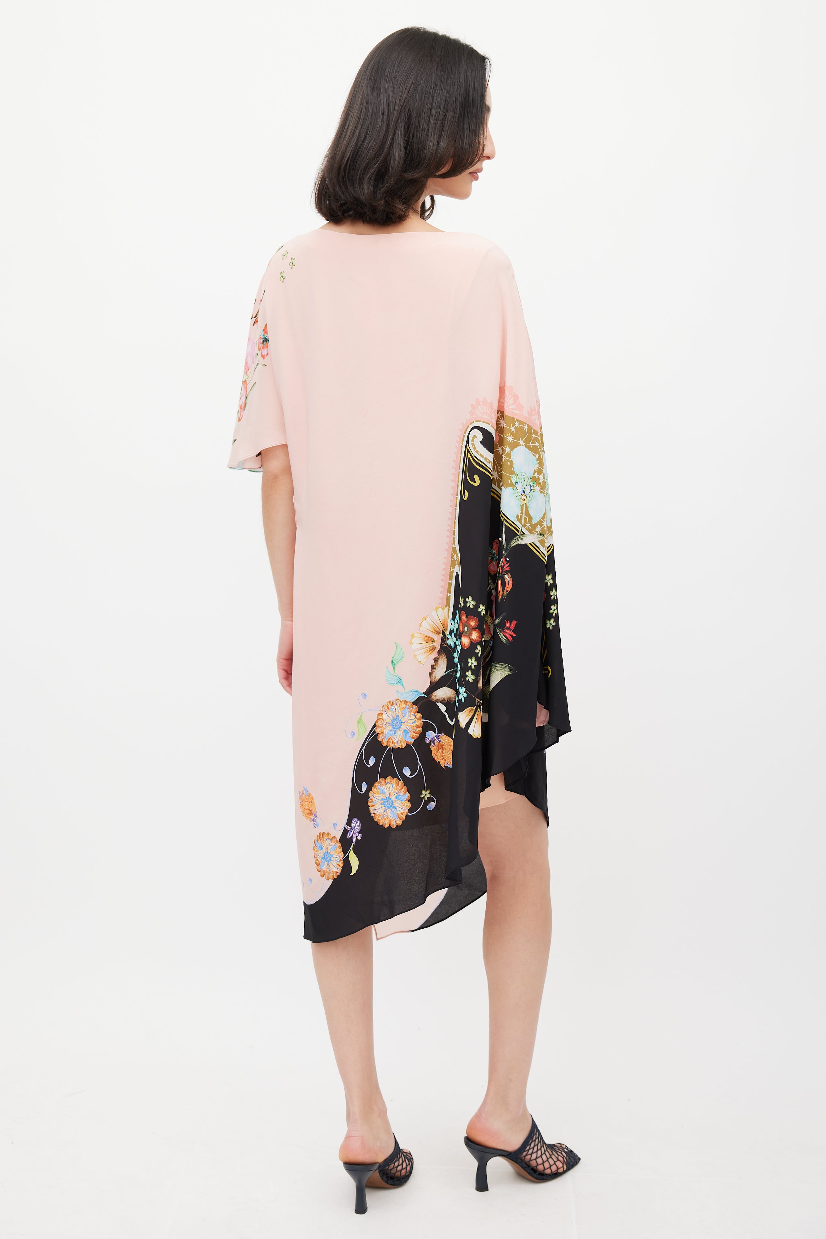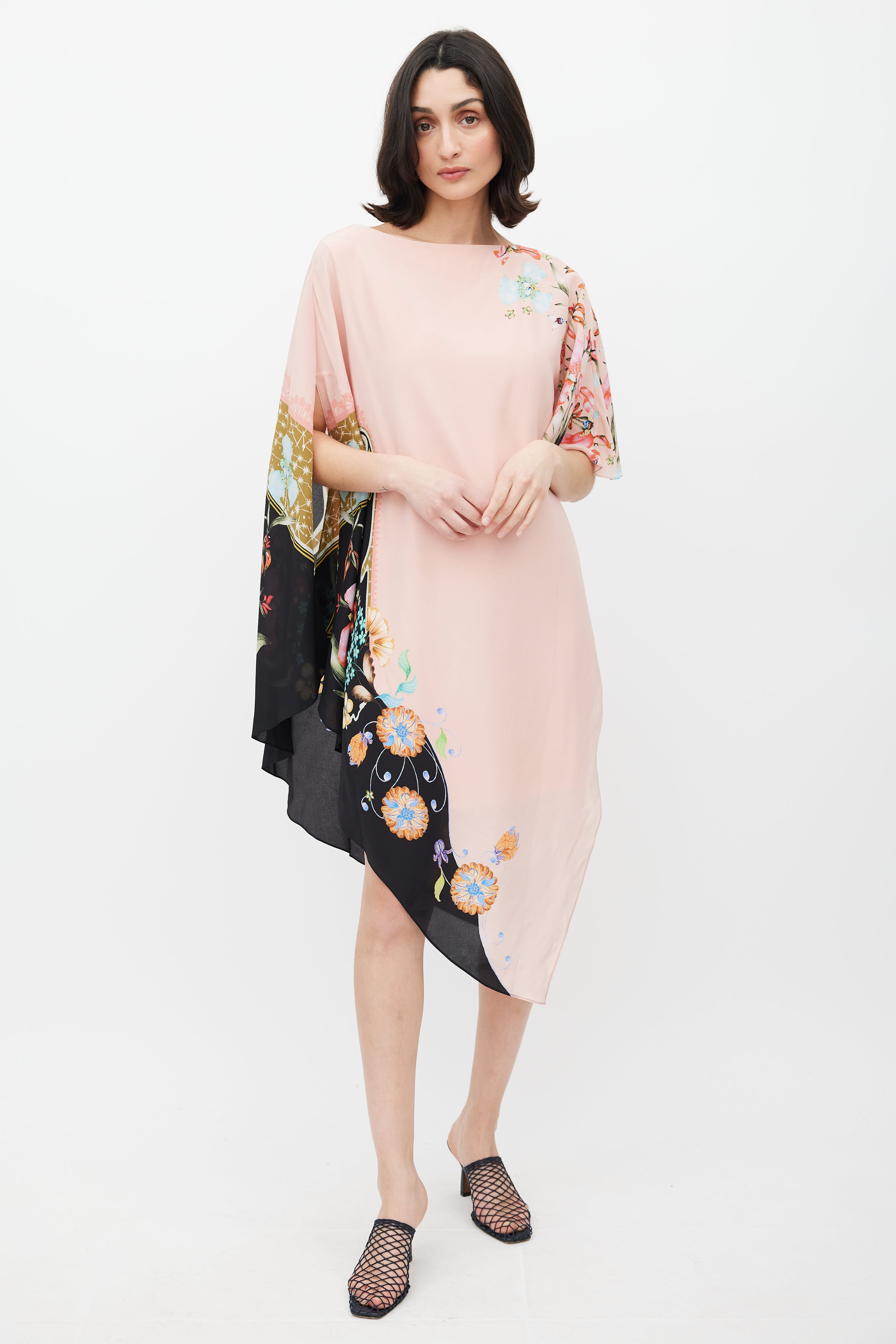 Pre-owned Etro pink asymmetrical dress featuring a multicolour floral pattern throughout, bateau neckline, one short sleeve, slit at side, and ruffled hem.