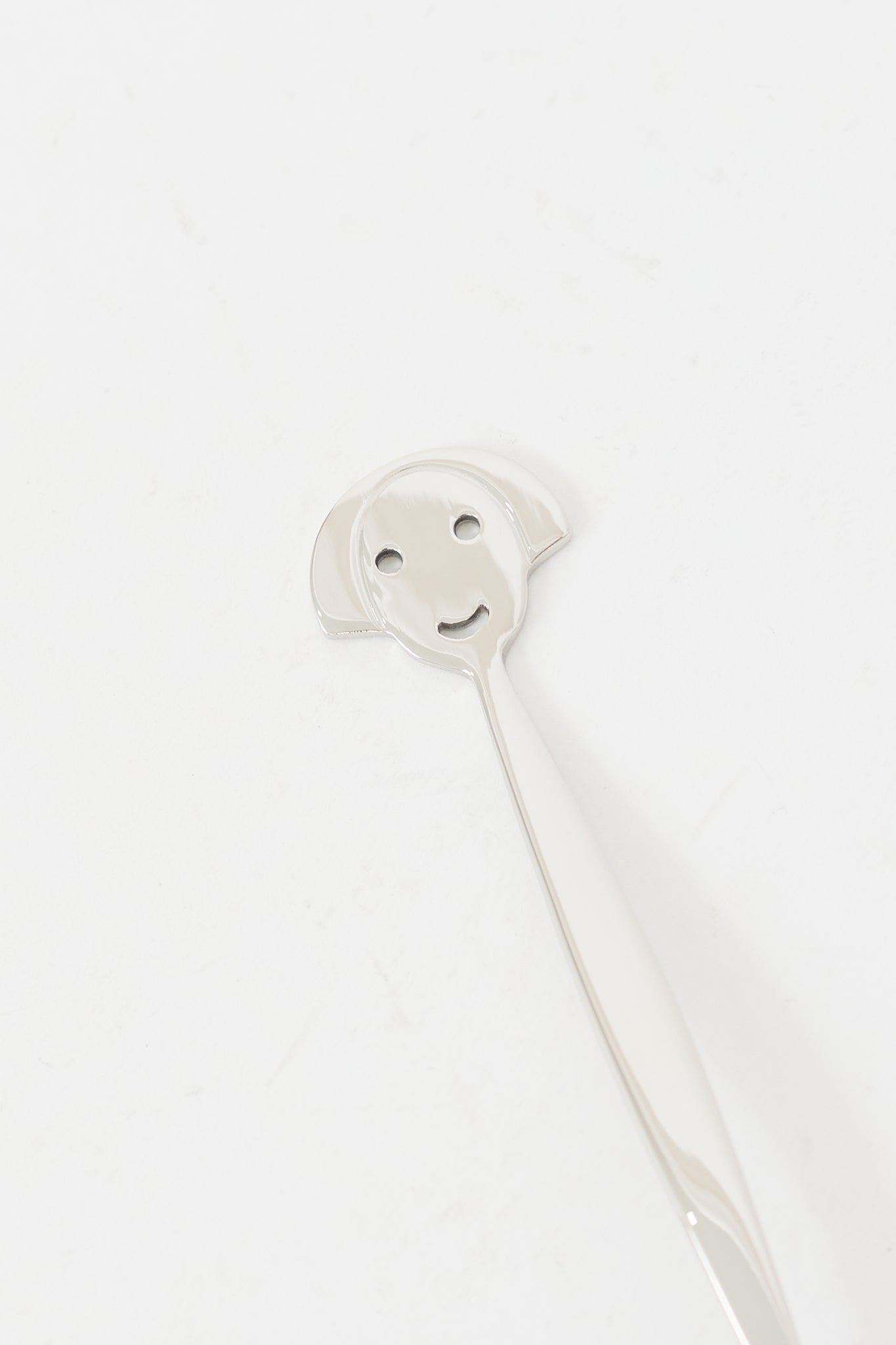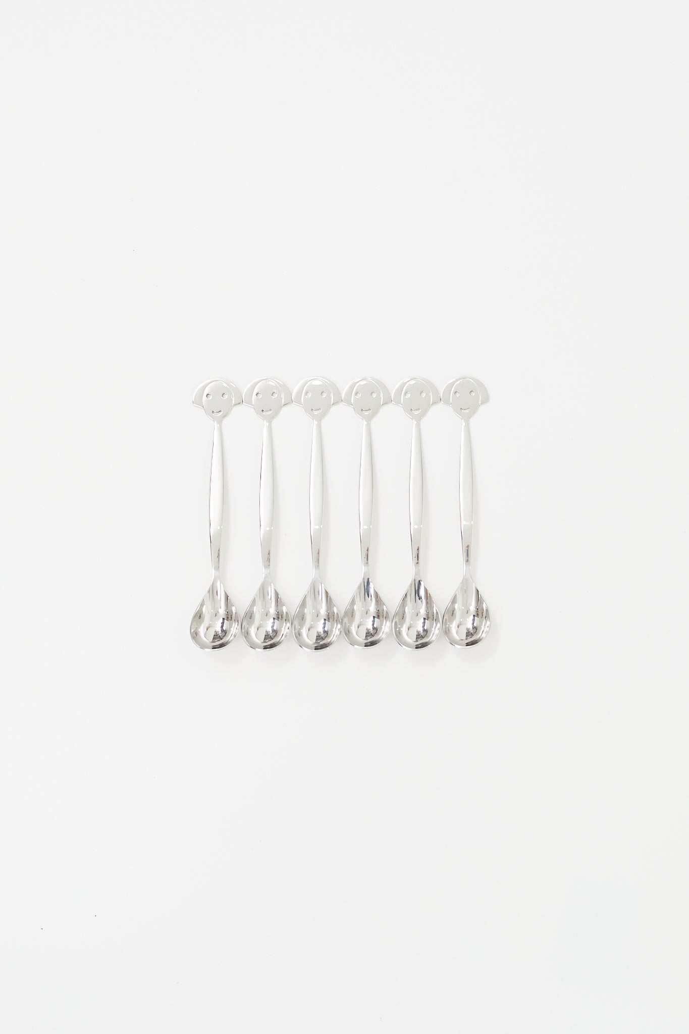 Pre-owned Alessi set of six 5.25" stainless steel Anna tea spoons featuring deep bowl and face motif handle. Designed by Alessandro Mendini. Comes with original box.