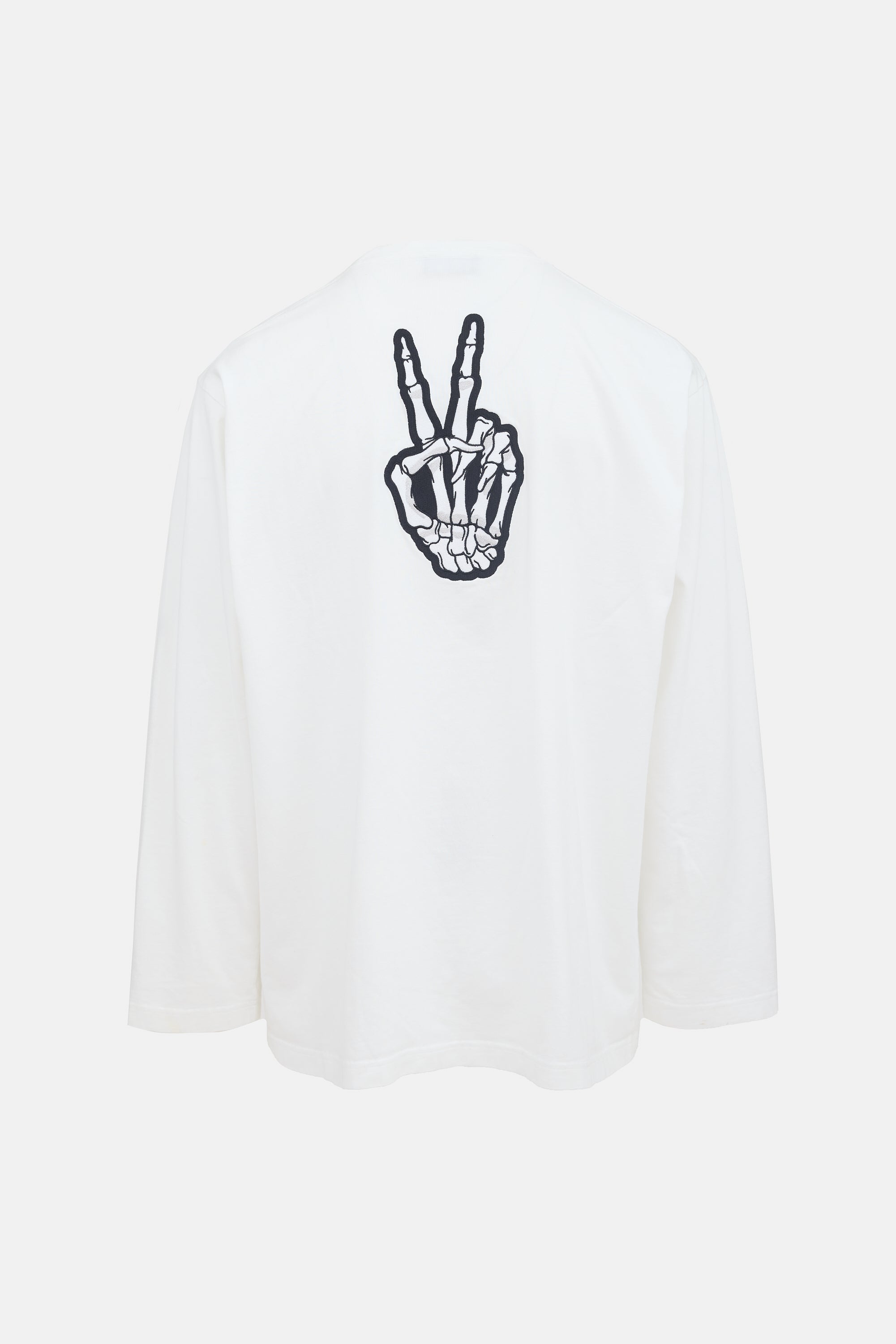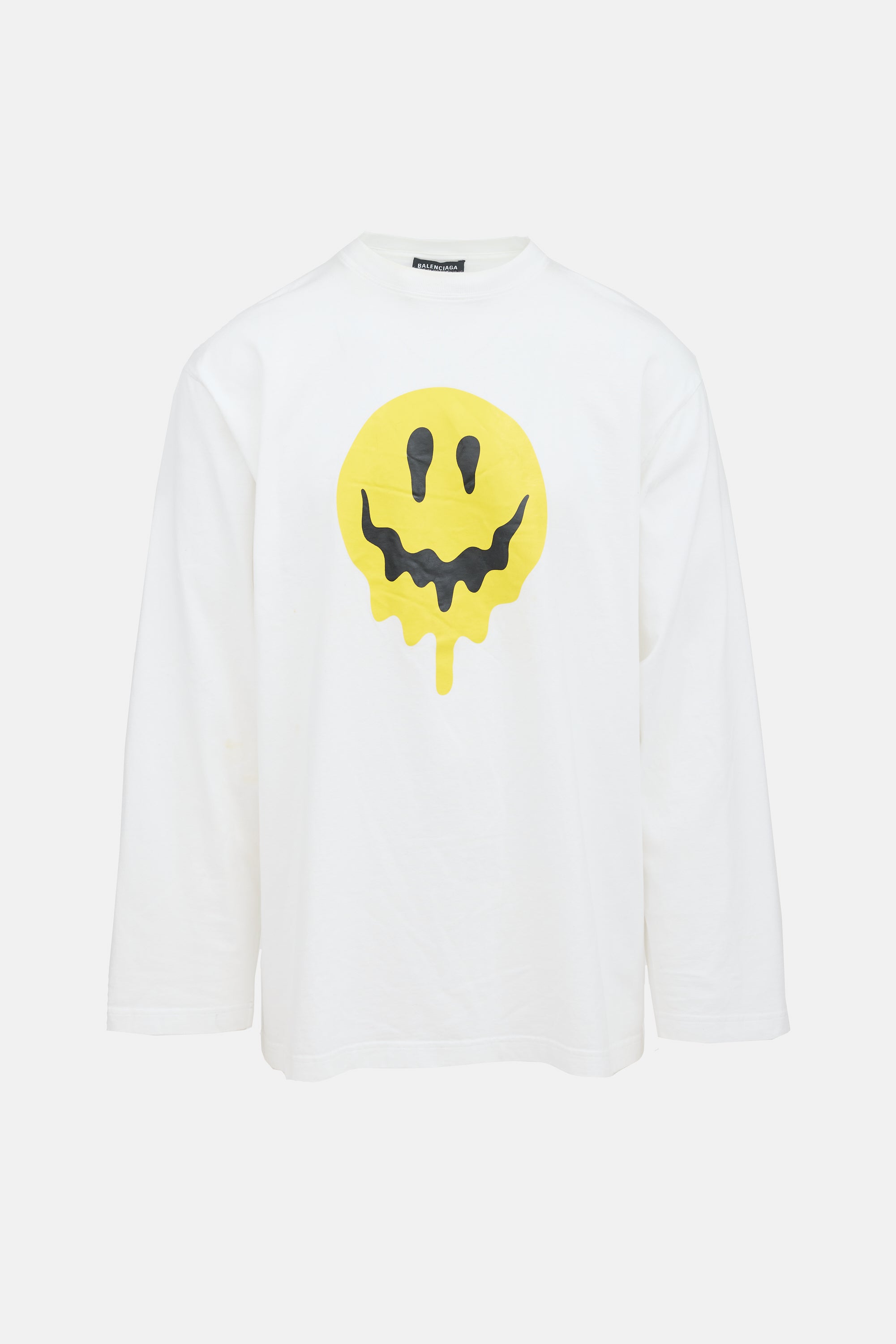 Pre-owned Balenciaga 2020 white top featuring a yellow and black smiley face graphic front, embroidered skeleton hand patch at back, crew neckline, and long sleeves.