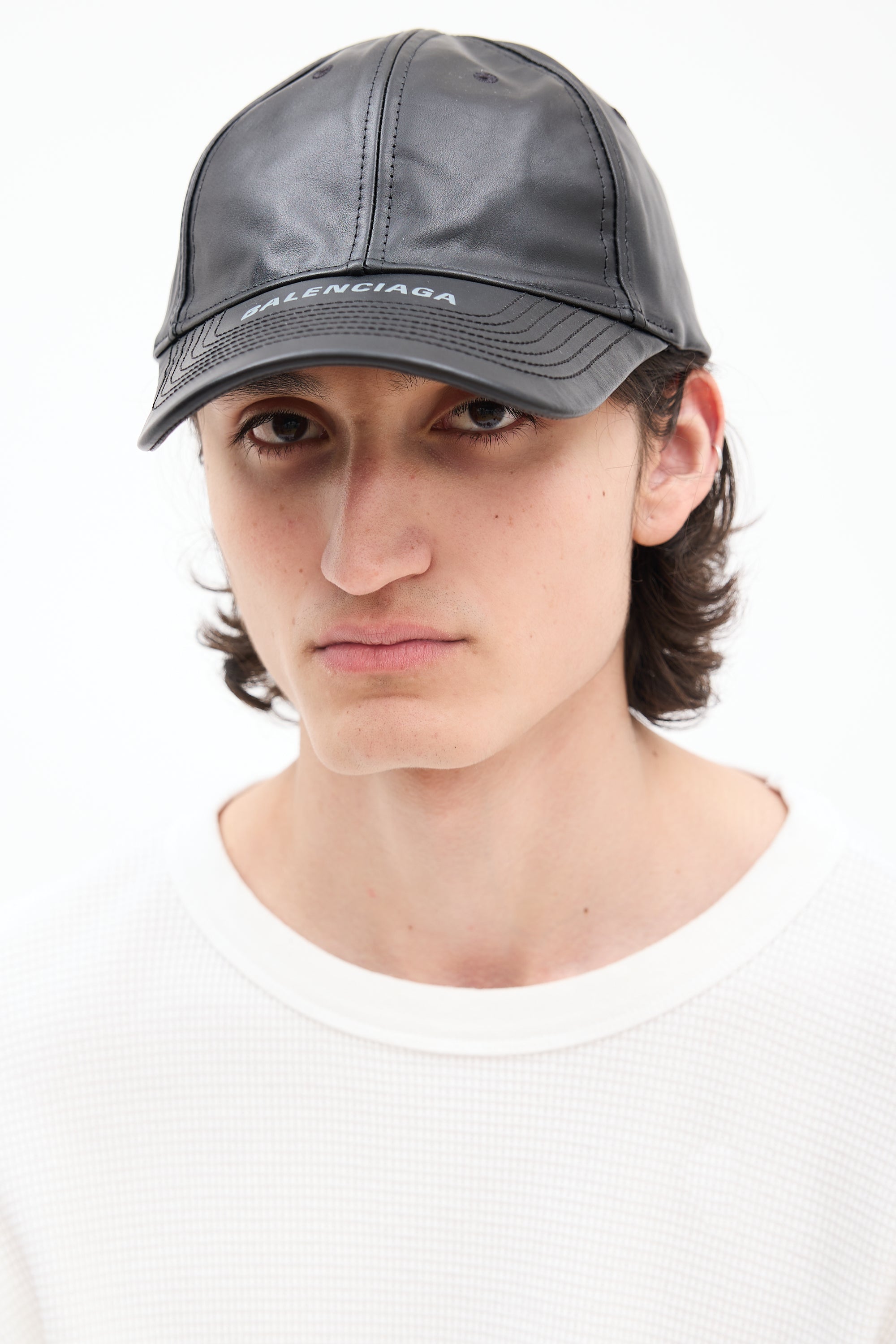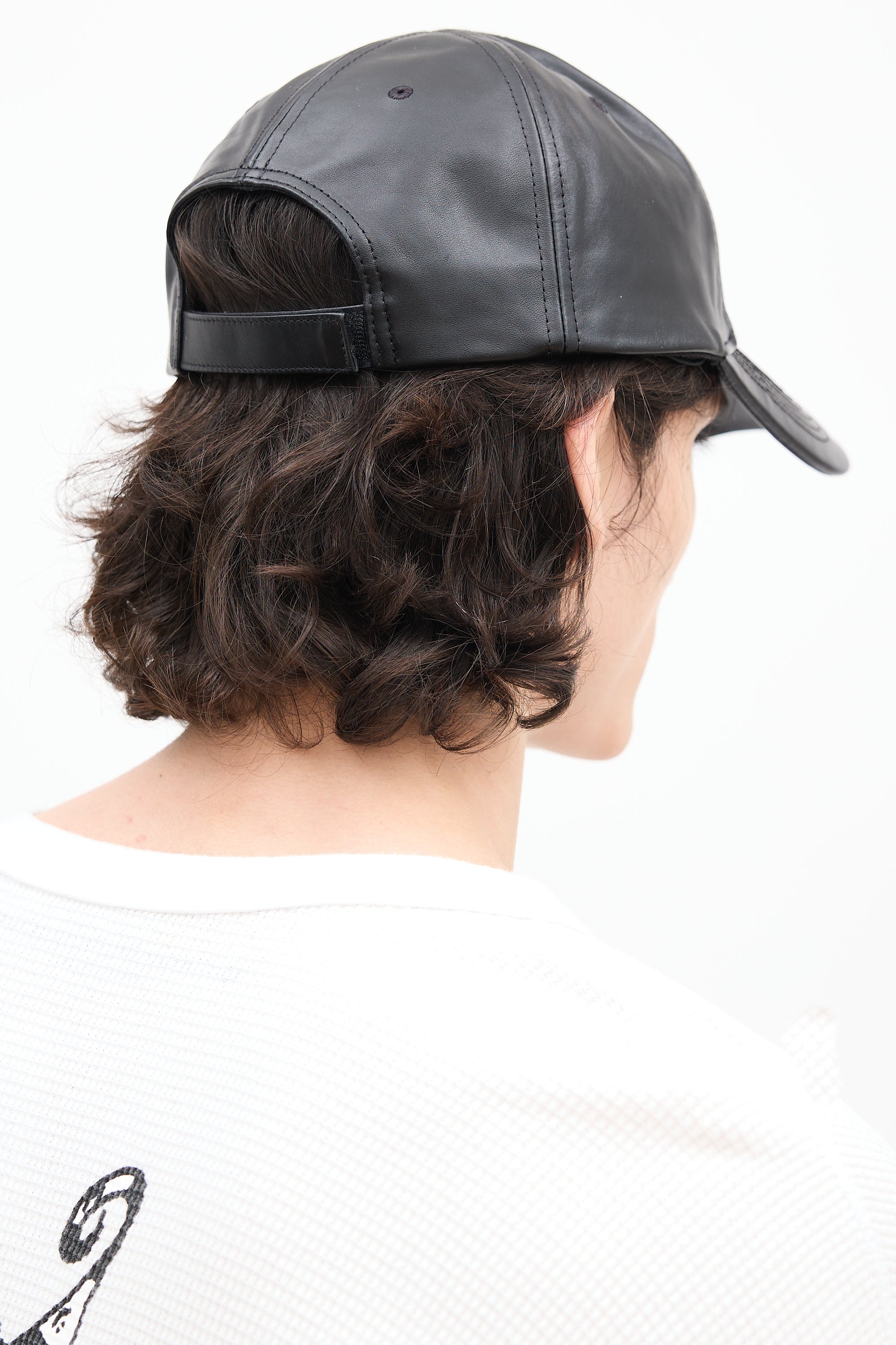 Pre-owned Balenciaga black leather baseball cap featuring logo embossed brim and adjustable velcro back strap.