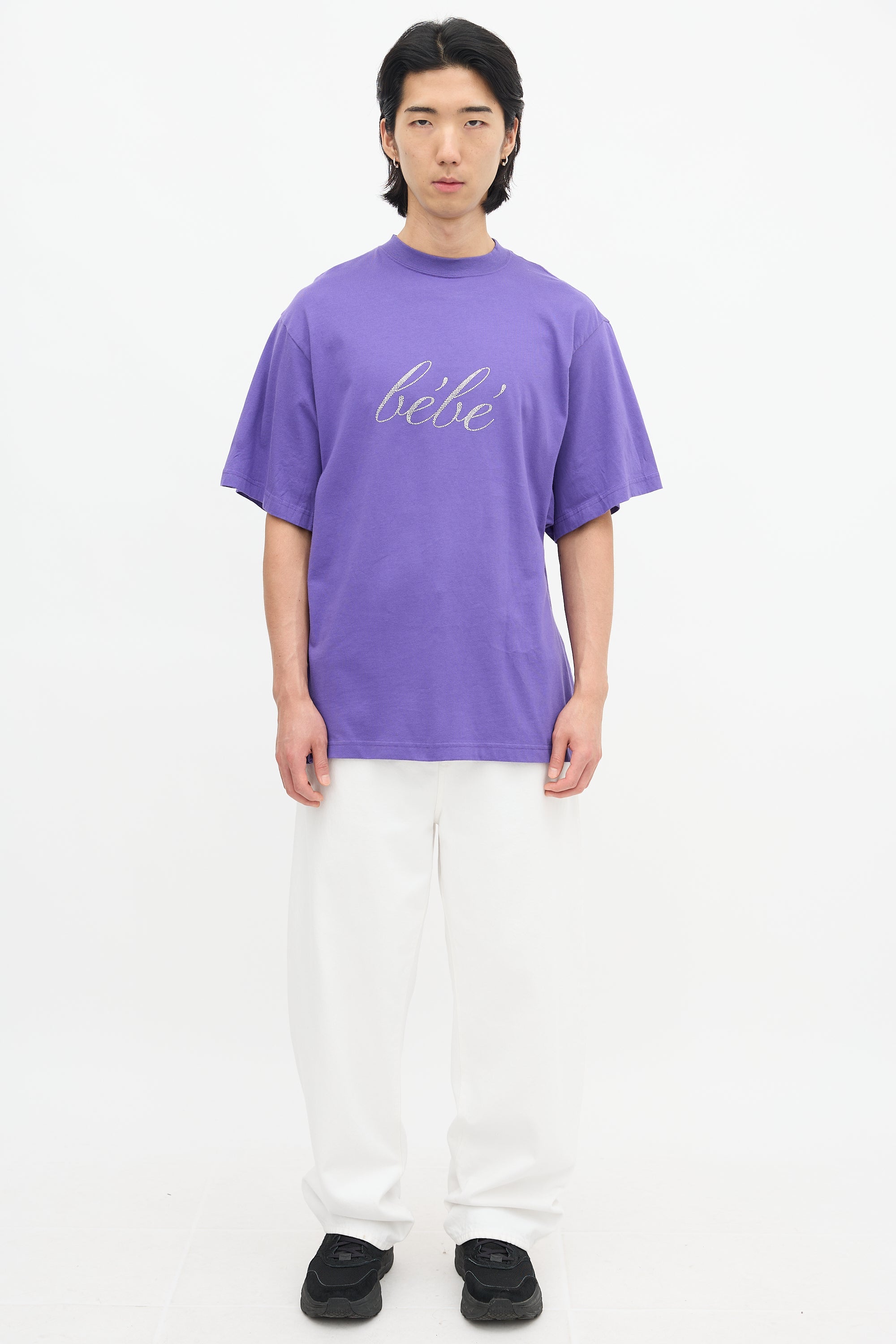 Pre-owned Balenciaga Spring 2022 purple T-shirt featuring crew neckline, rhinestone 'bebe' script embellished front, and ruched sides.