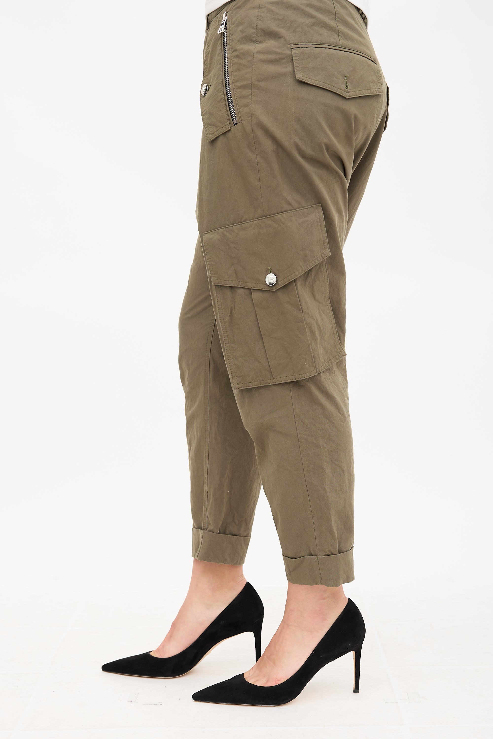 Pre-owned Balmain green trousers featuring dropped seat, tapered leg, folded hem, six pocket styling, two large cargo pockets at outseam, and button fly.
