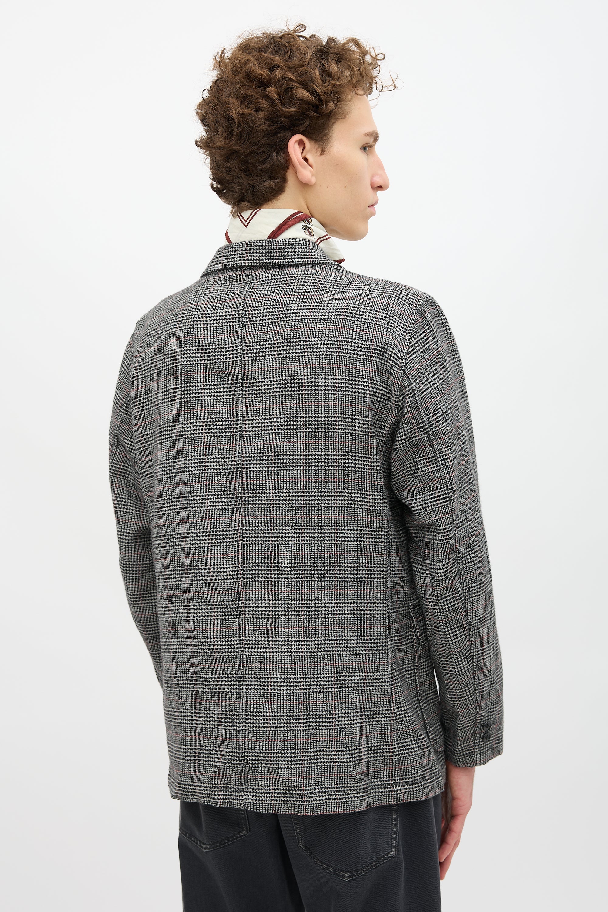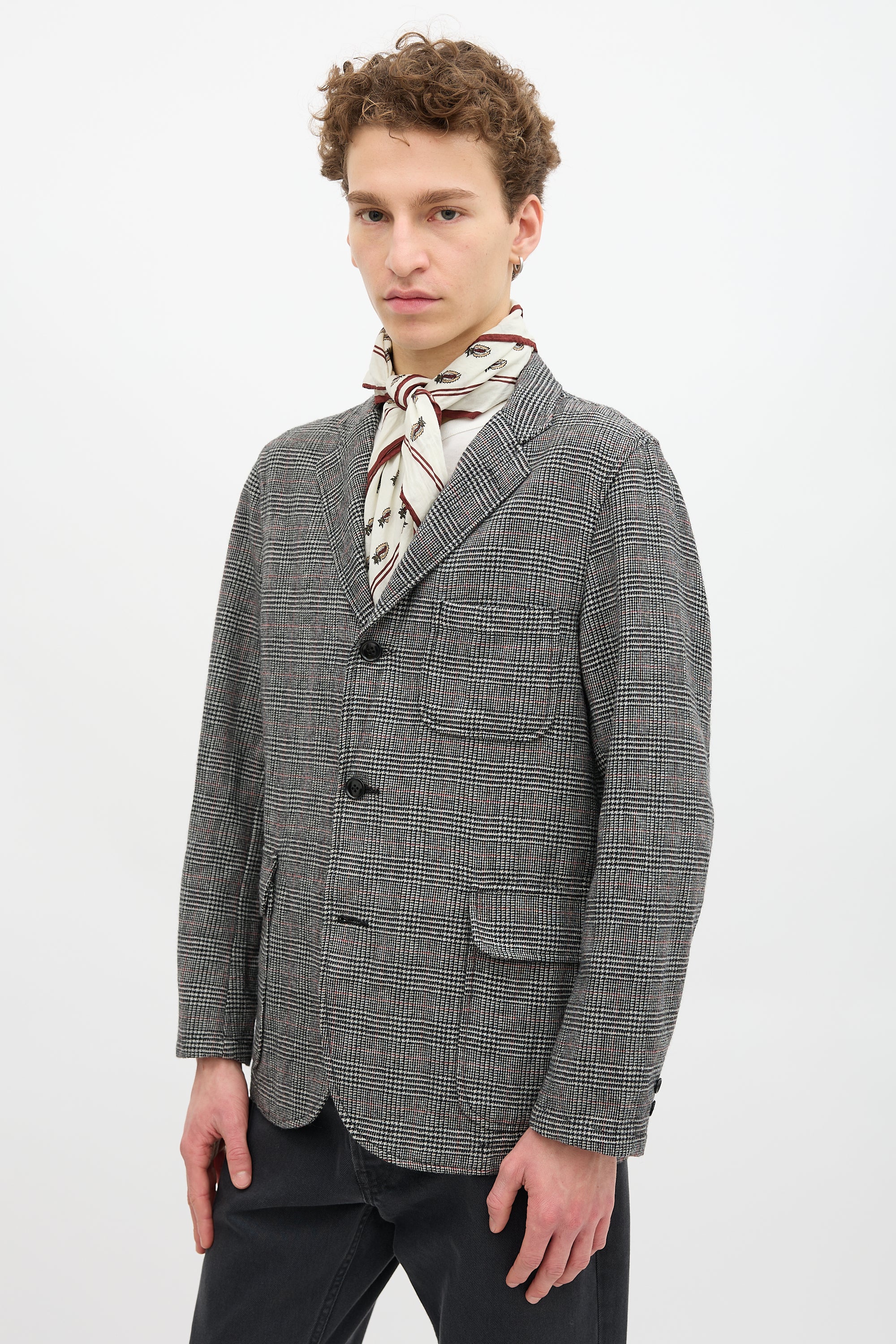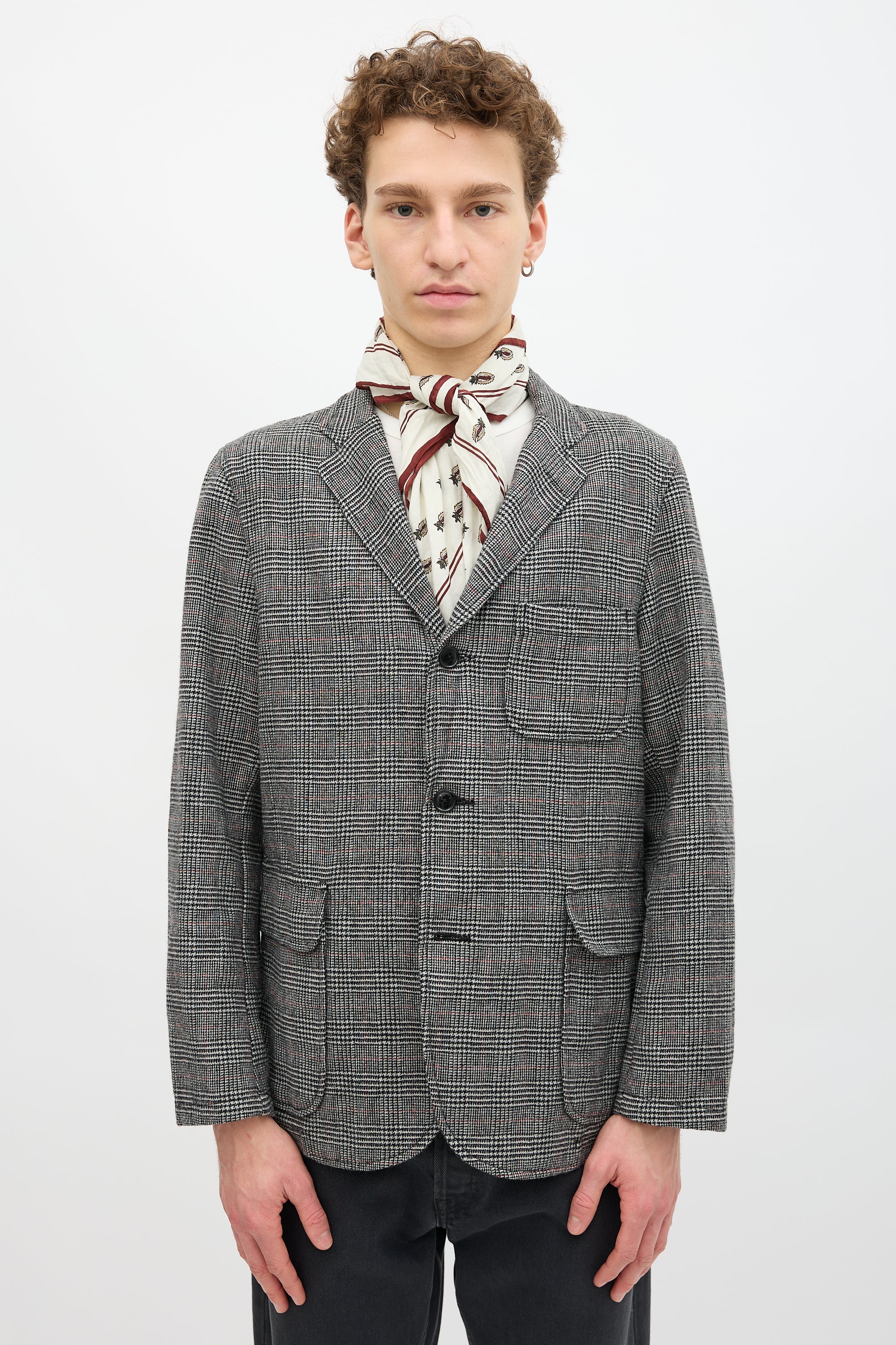 Pre-owned Beams black, white, and red wool blend blazer featuring Glen plaid pattern, notched lapel, button up front, three front pockets, and buttoned cuffs. Unlined.