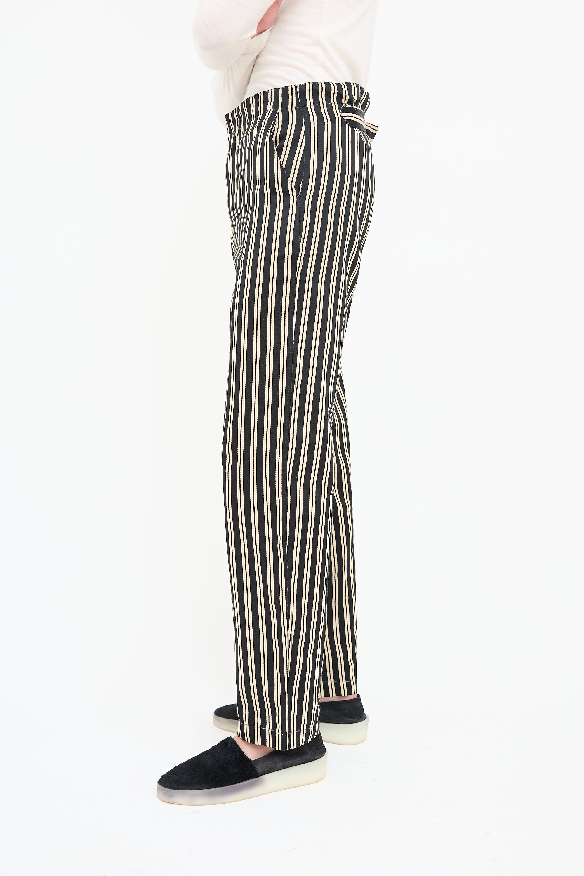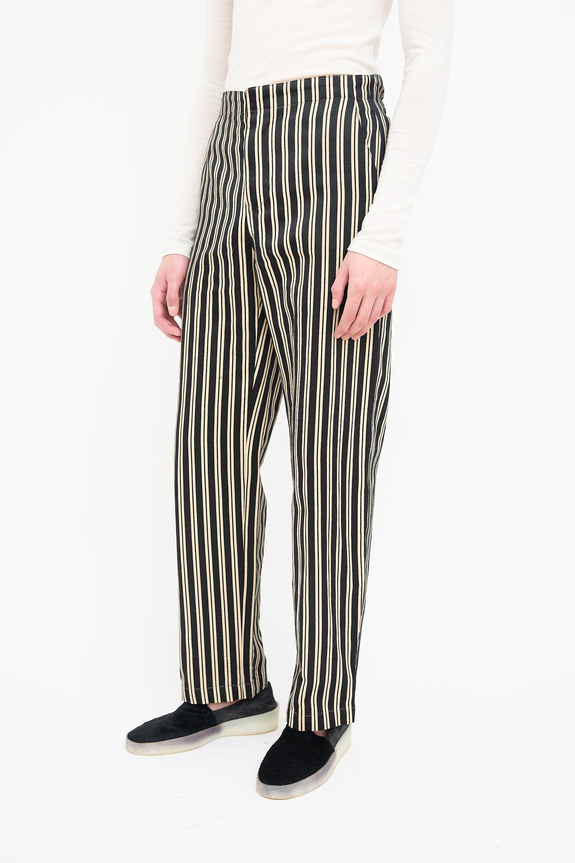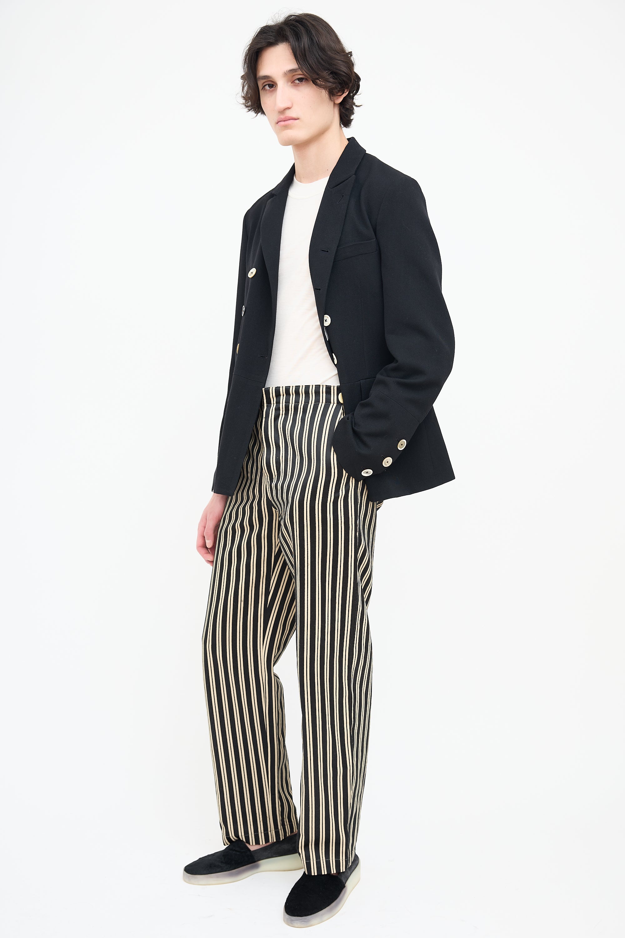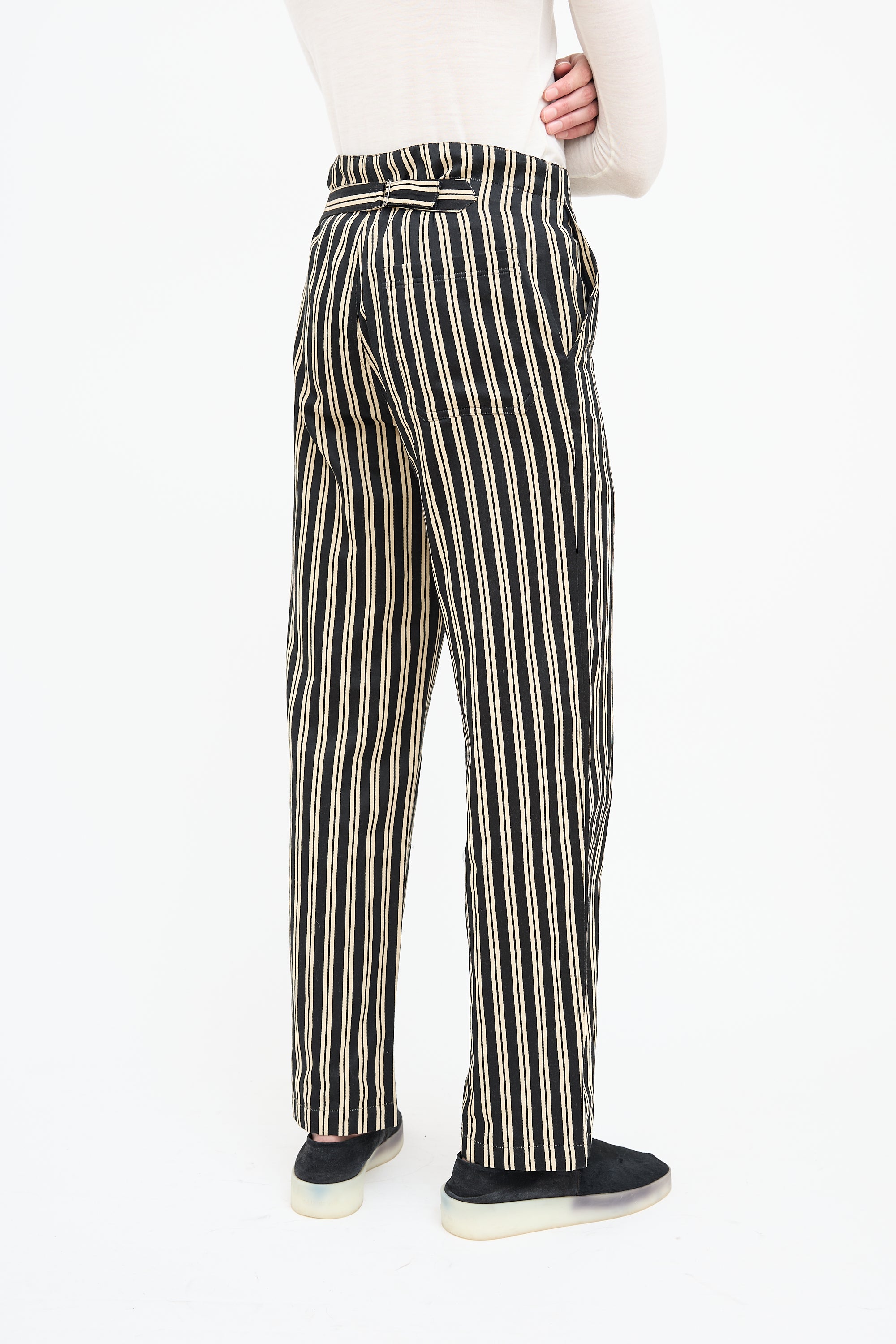 Pre-owned Bode cream and black striped trousers featuring an adjustable waist, straight leg, three pocket styling, and button fly.