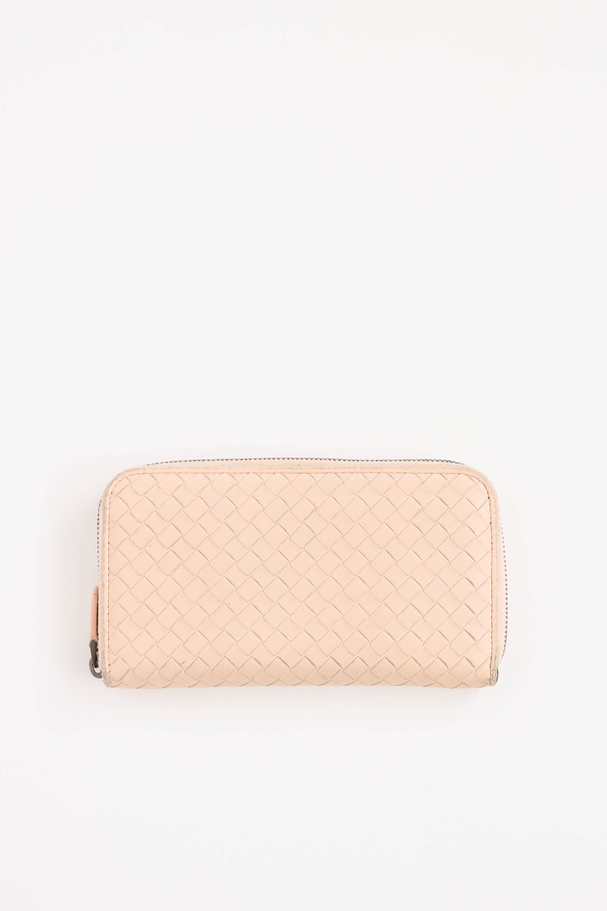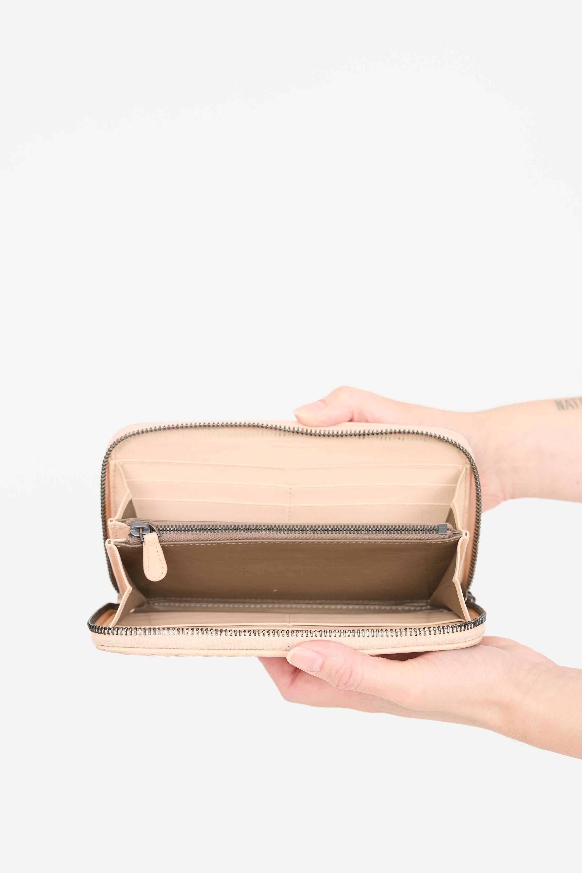 Pre-owned Bottega Veneta beige long leather wallet featuring signature Intrecciato exterior, dark silver-tone zip closure, eight card slots, two open compartments and one zipped pocket at centre.