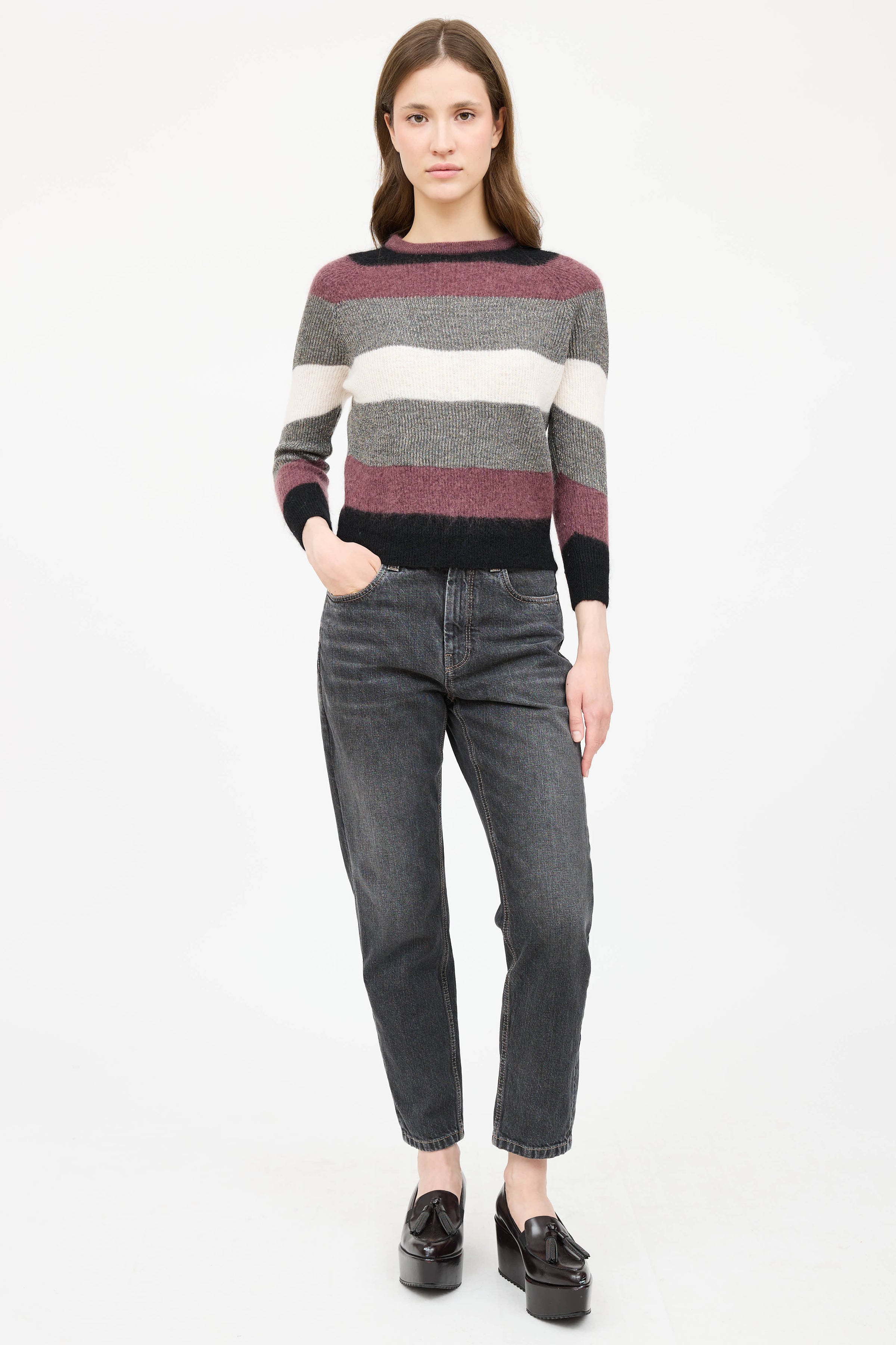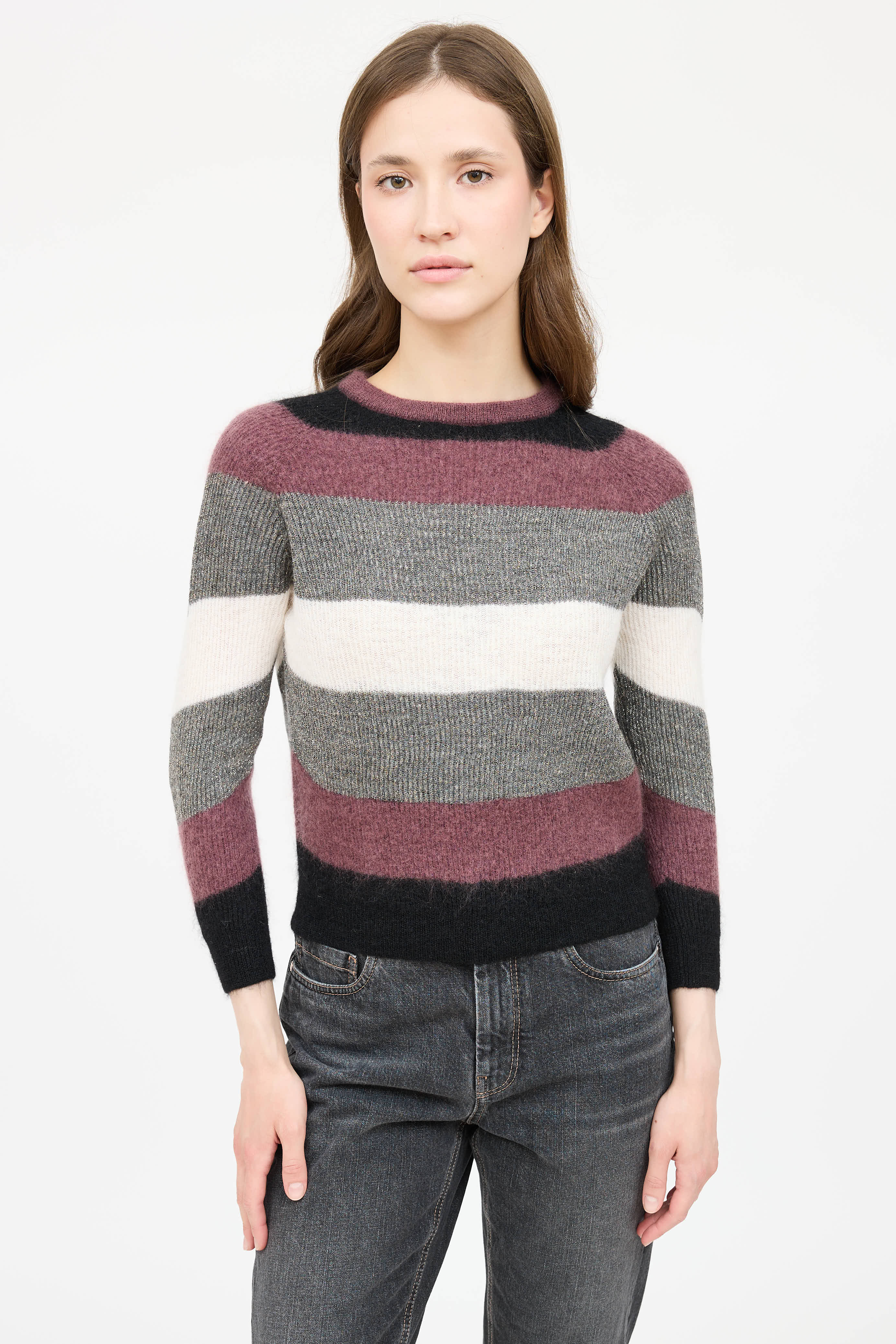 Pre-owned Brunello Cucinelli multicolour knit long sleeve sweater featuring round neckline, ribbed collar, and metallic stripe detail.