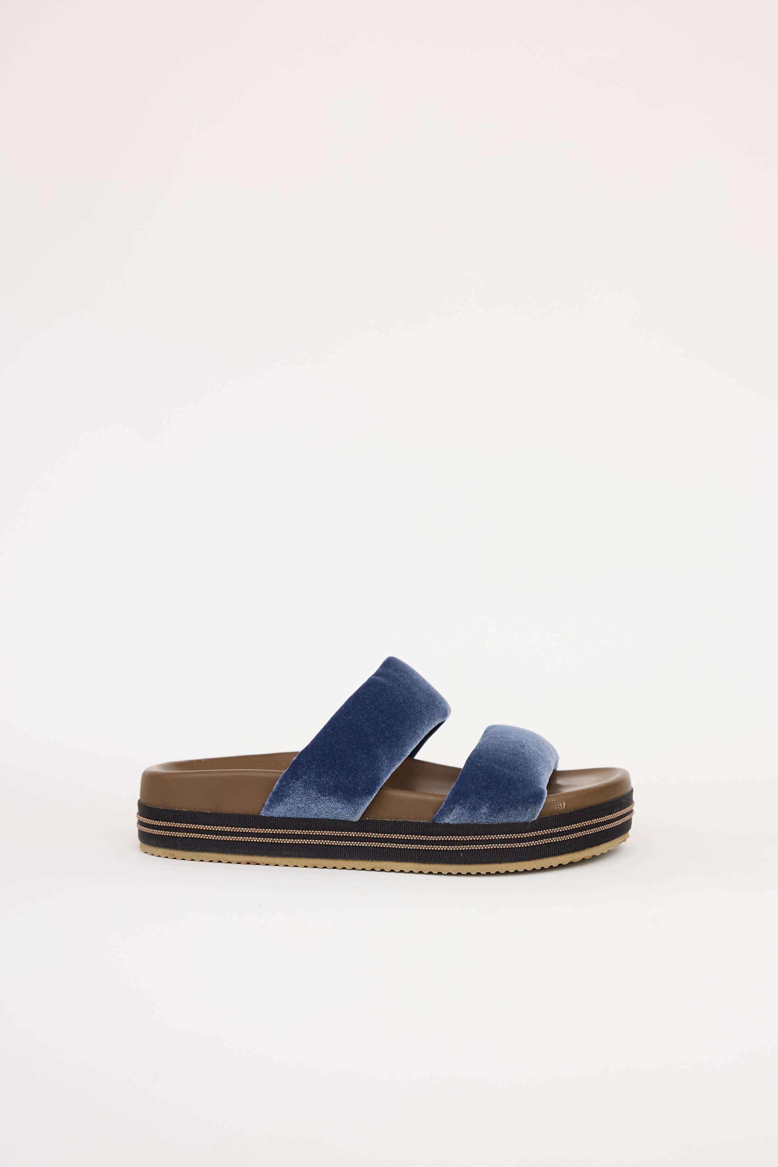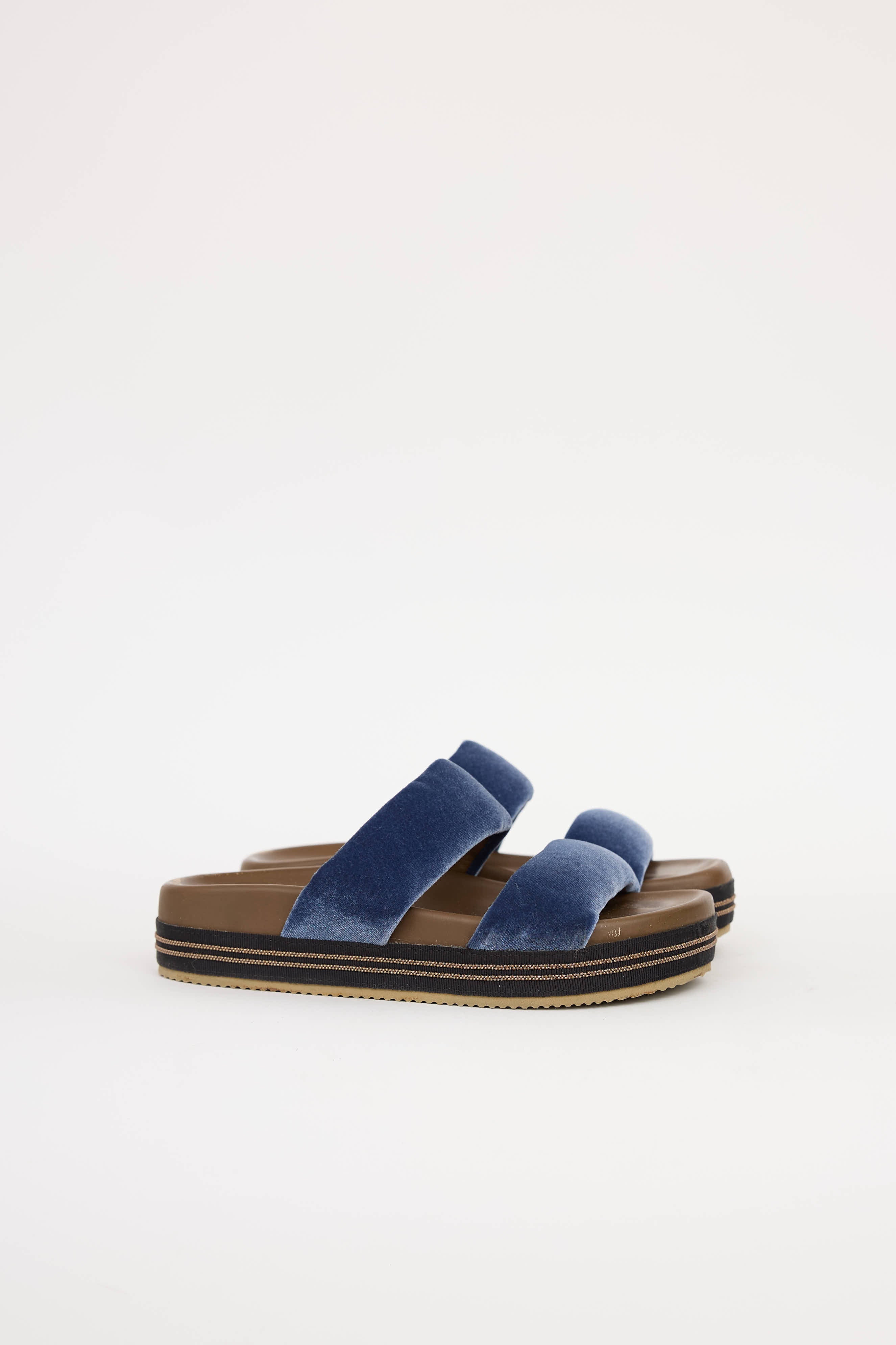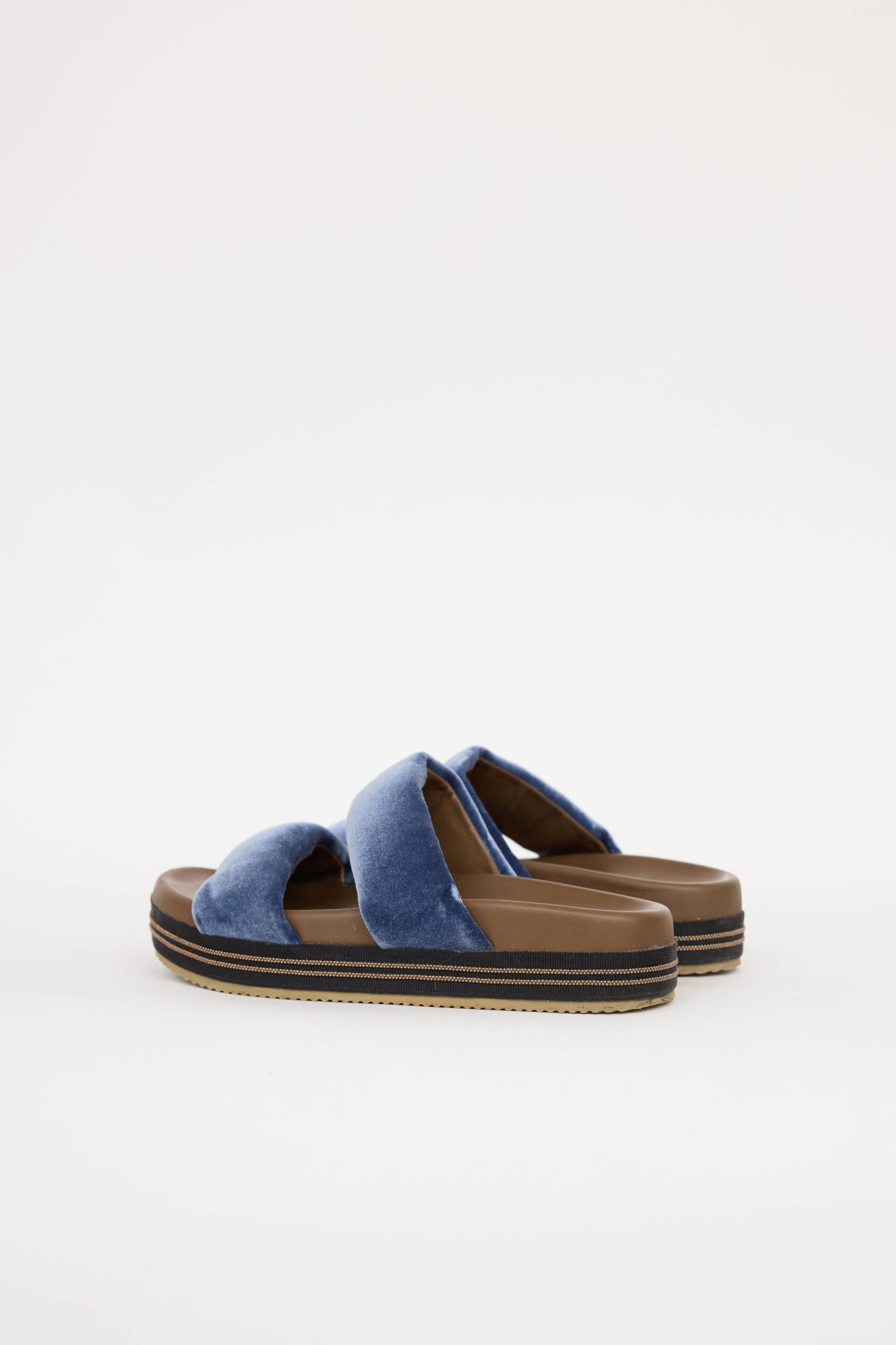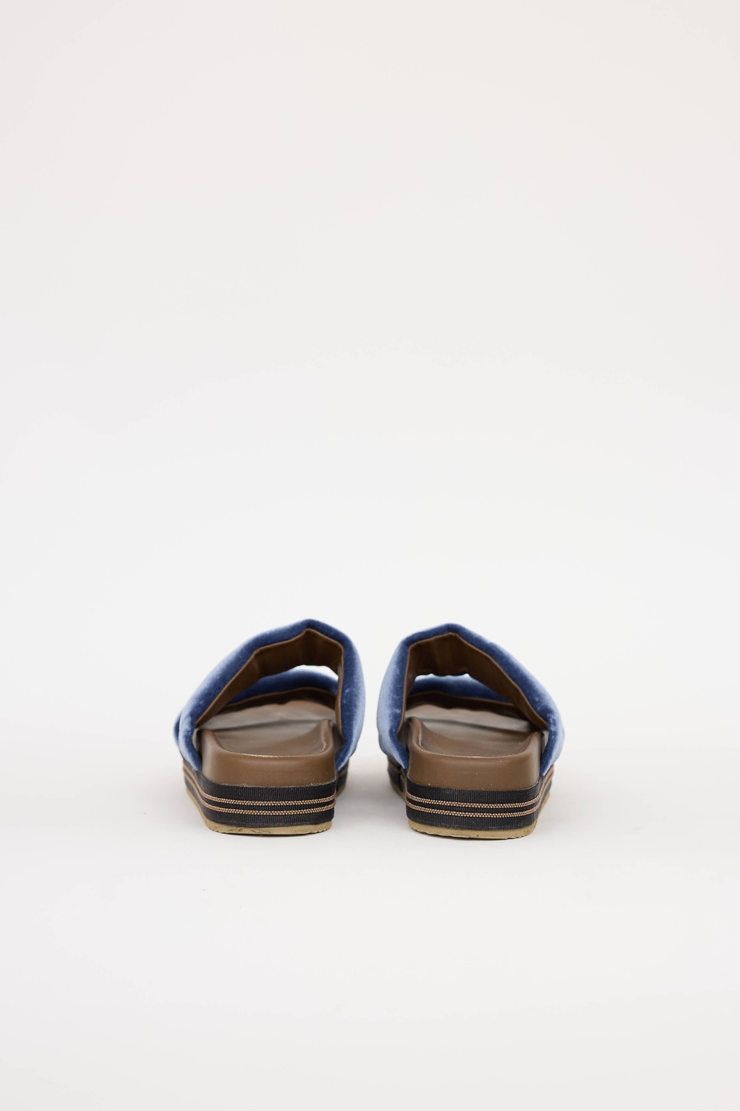 Pre-owned Brunello Cucinelli blue velvet sandal featuring round toe, velvet straps at vamp, and monili detail at midsole.