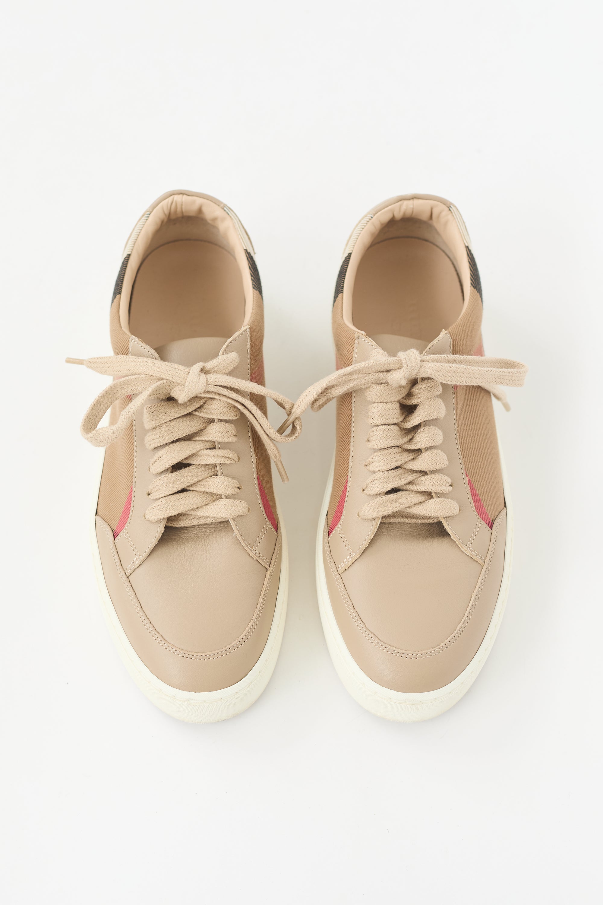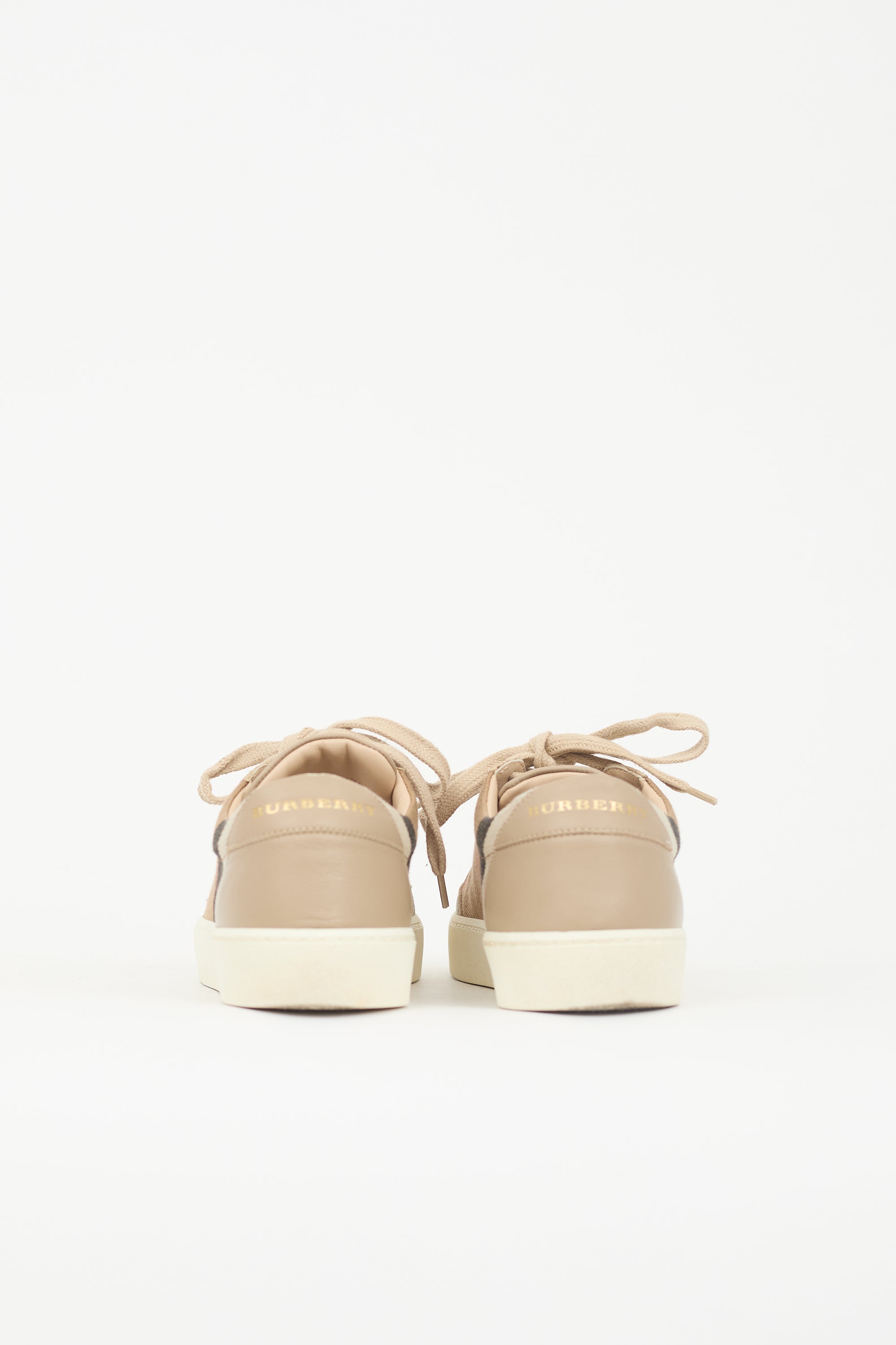 Pre-owned Burberry brown sneakers featuring rounded toe, leather and check canvas upper, lace up instep, printed logo at counter panel, and rubber sole. Comes with original dust bag.