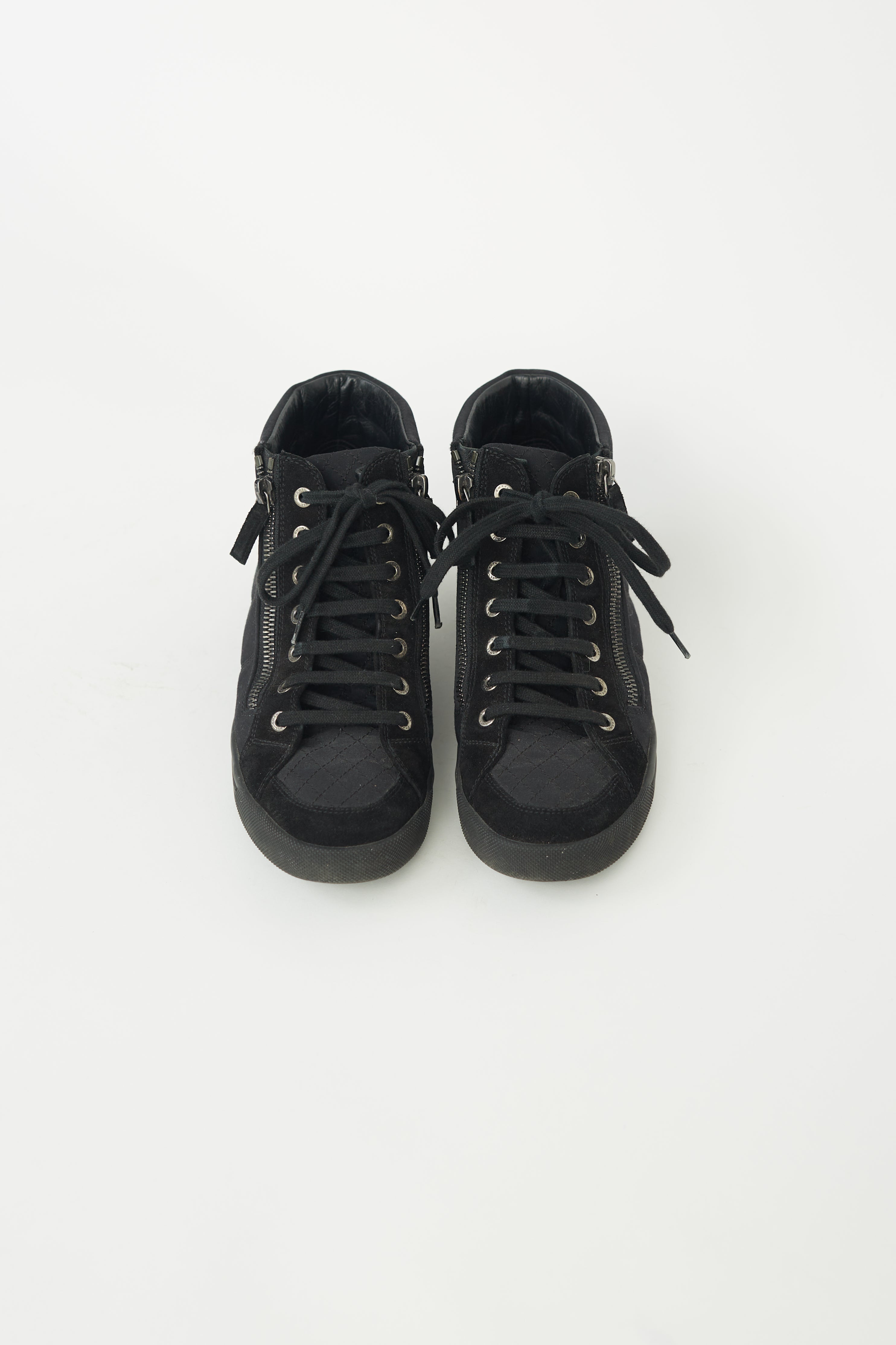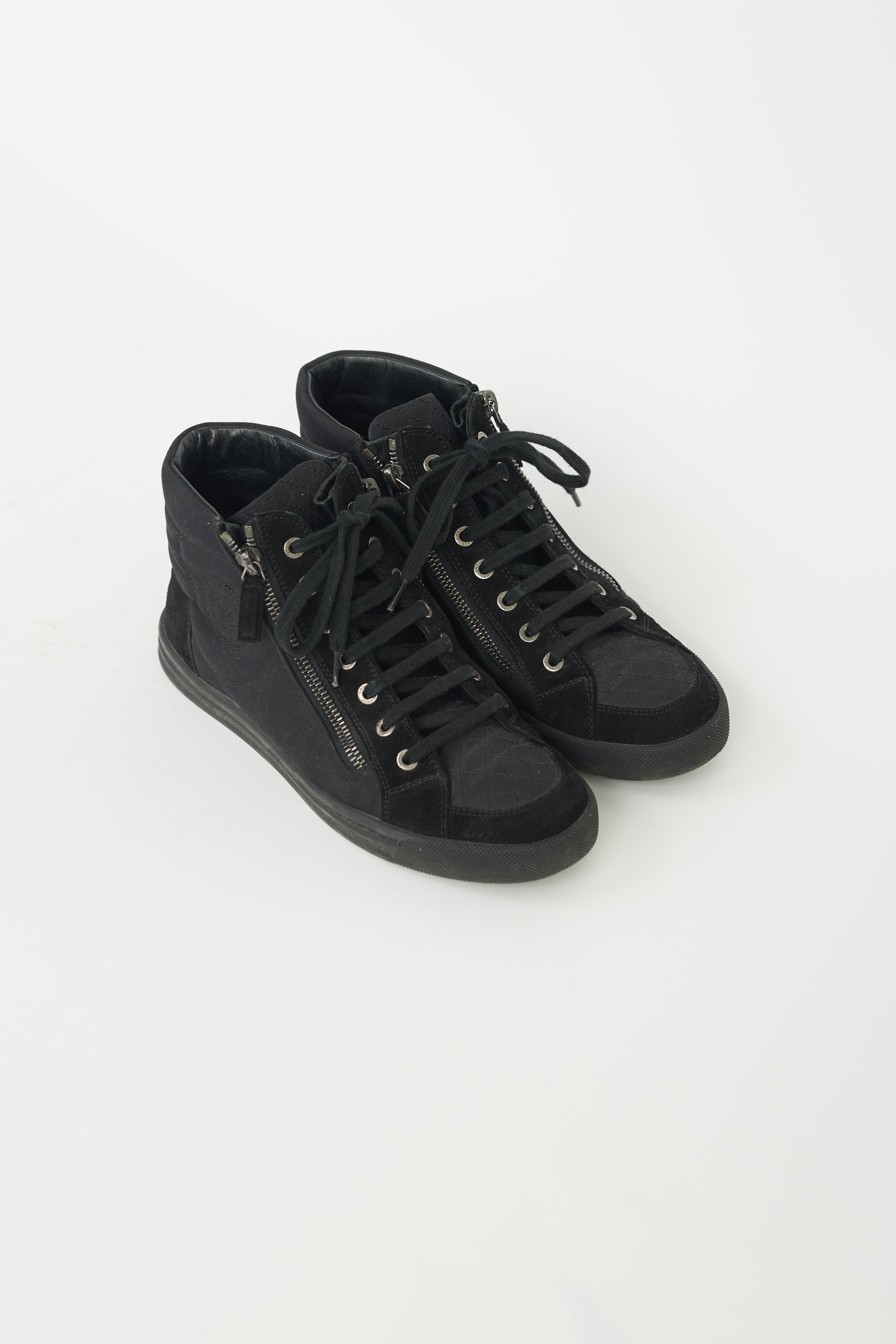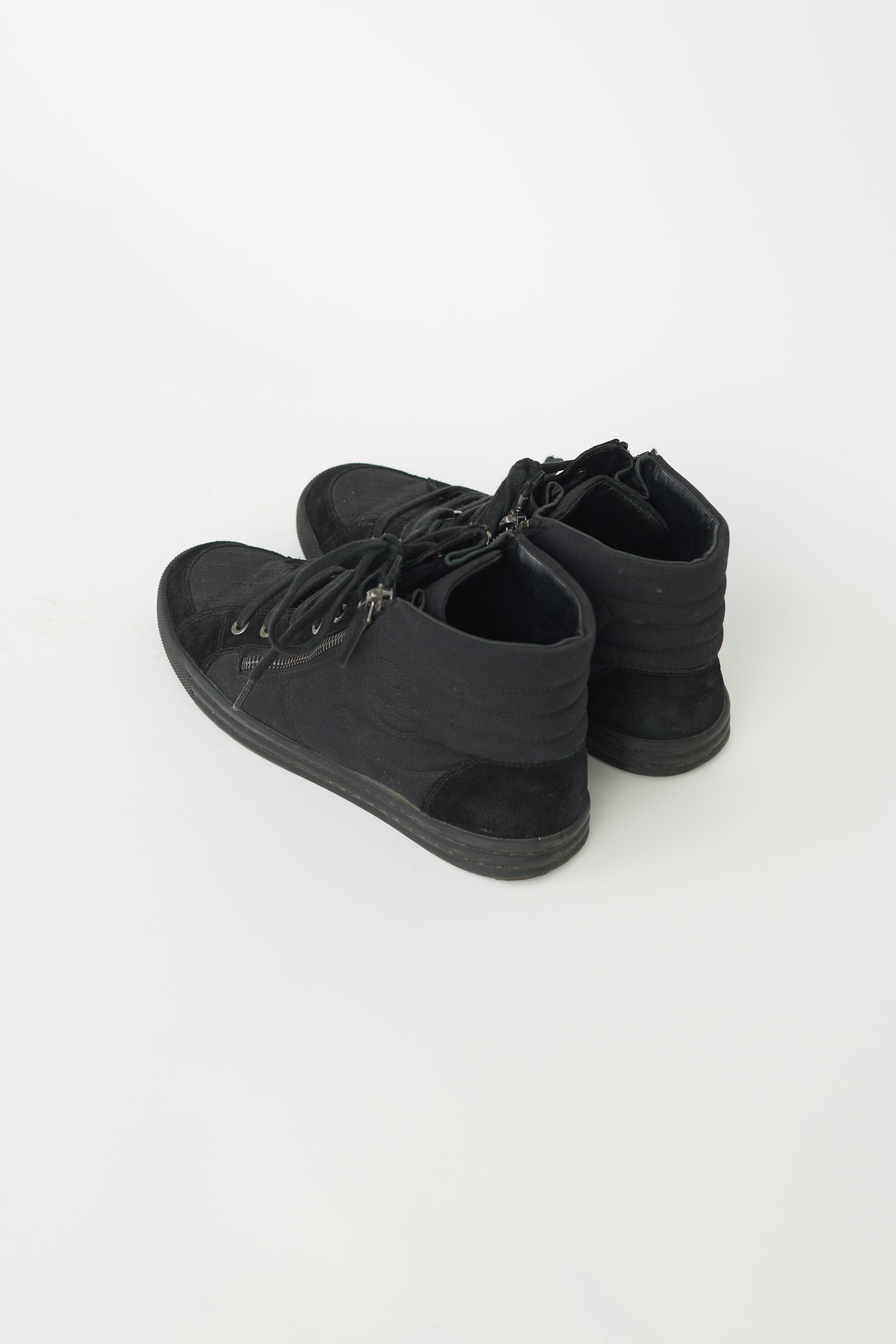 Pre-loved Chanel hi-top sneakers in black canvas featuring black suede trims, black cotton laces, two zippers at side of vamp, embroidered interlock CC logo at sides, stitched rubber sole and quilted padded counter.