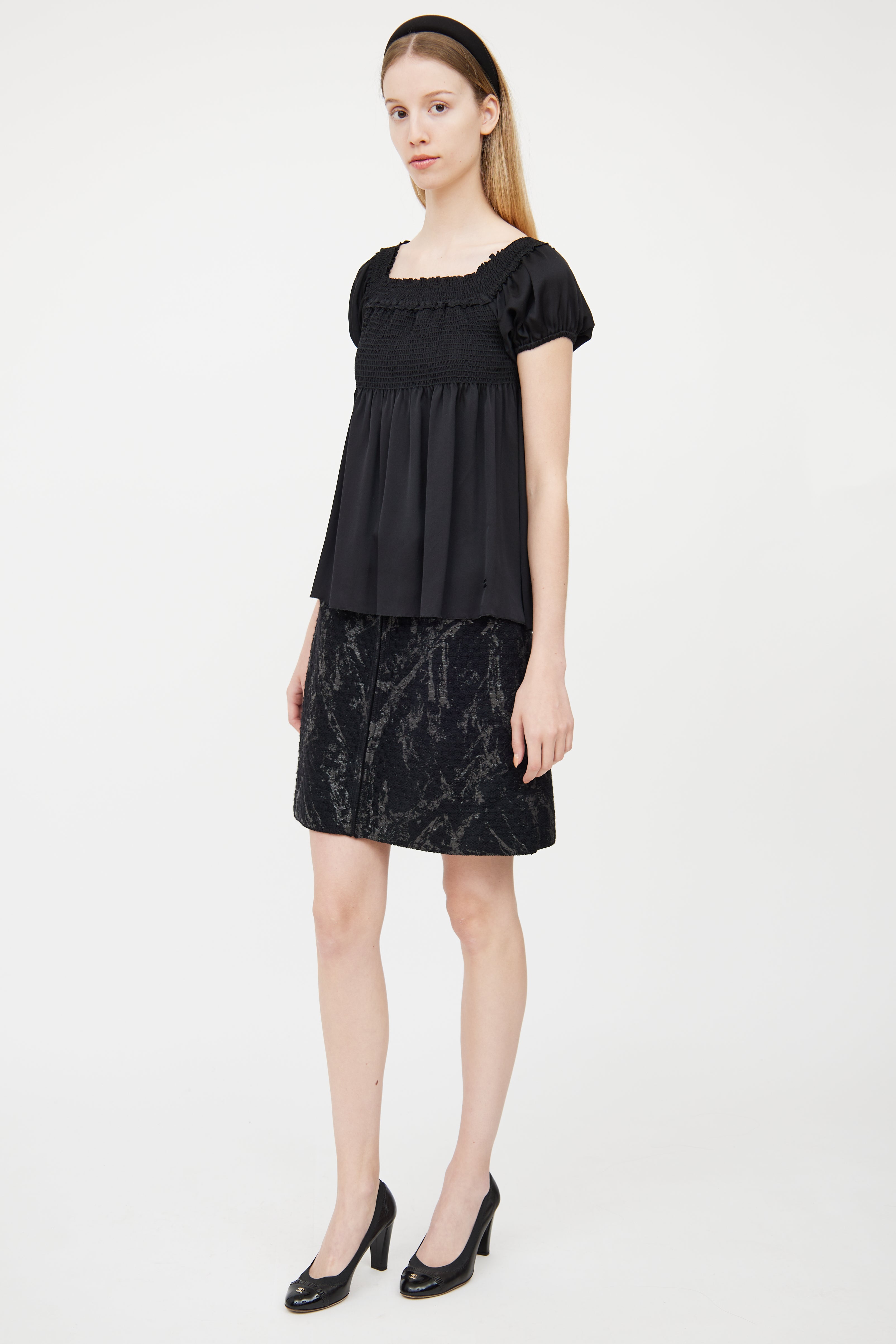 Pre-owned Chanel black wool knit skirt featuring elastic rib knit waistband, button and zip closure and tonal marbled pattern throughout.