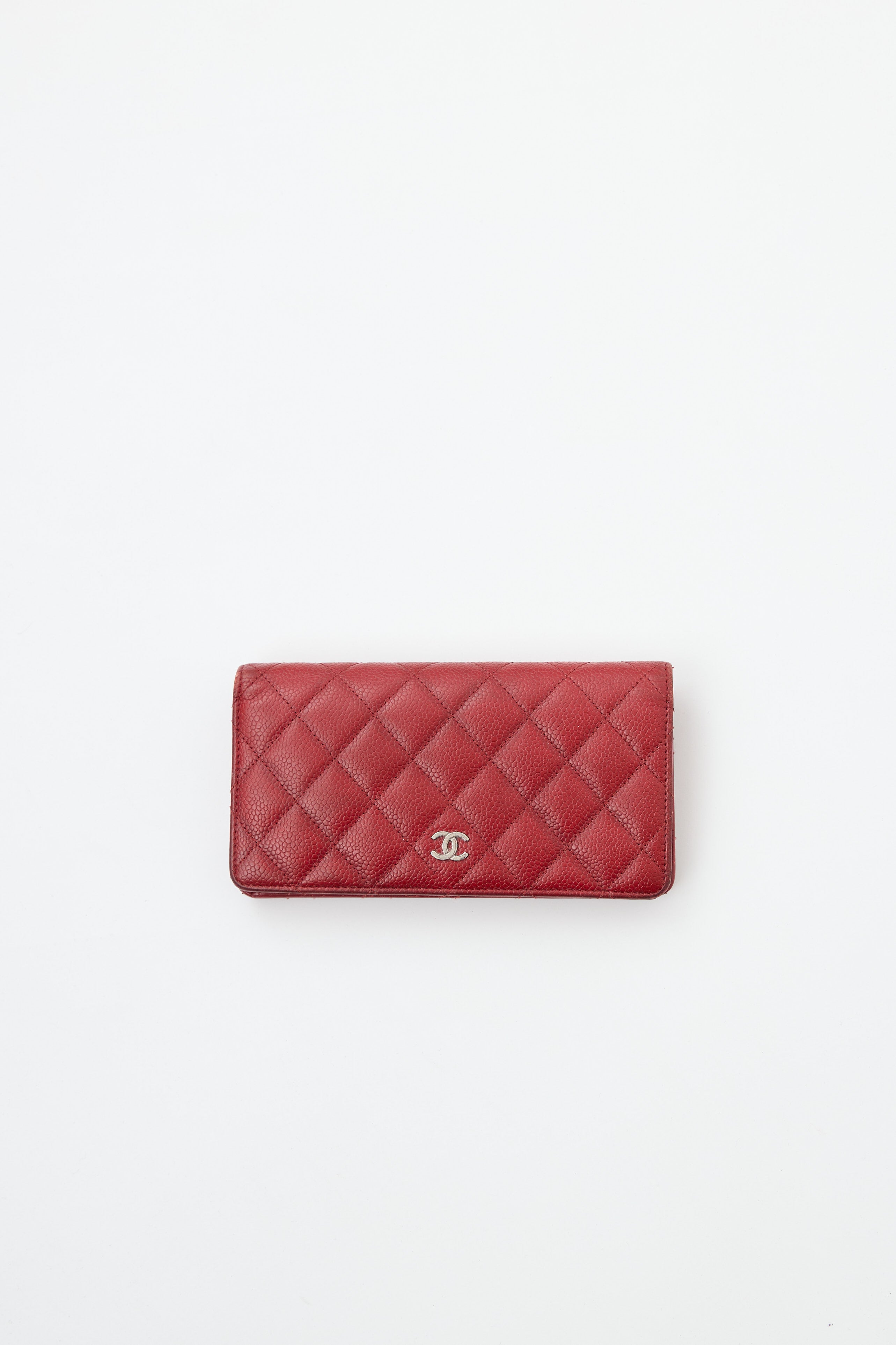 Pre-owned Chanel red Caviar bi-fold wallet featuring quilted leather, slip pocket at back, silver tone CC hardware at front, top flap, one bill compartment, one zip pocket, five slip pockets, 8 card slots, and silver stamped logo at corner.