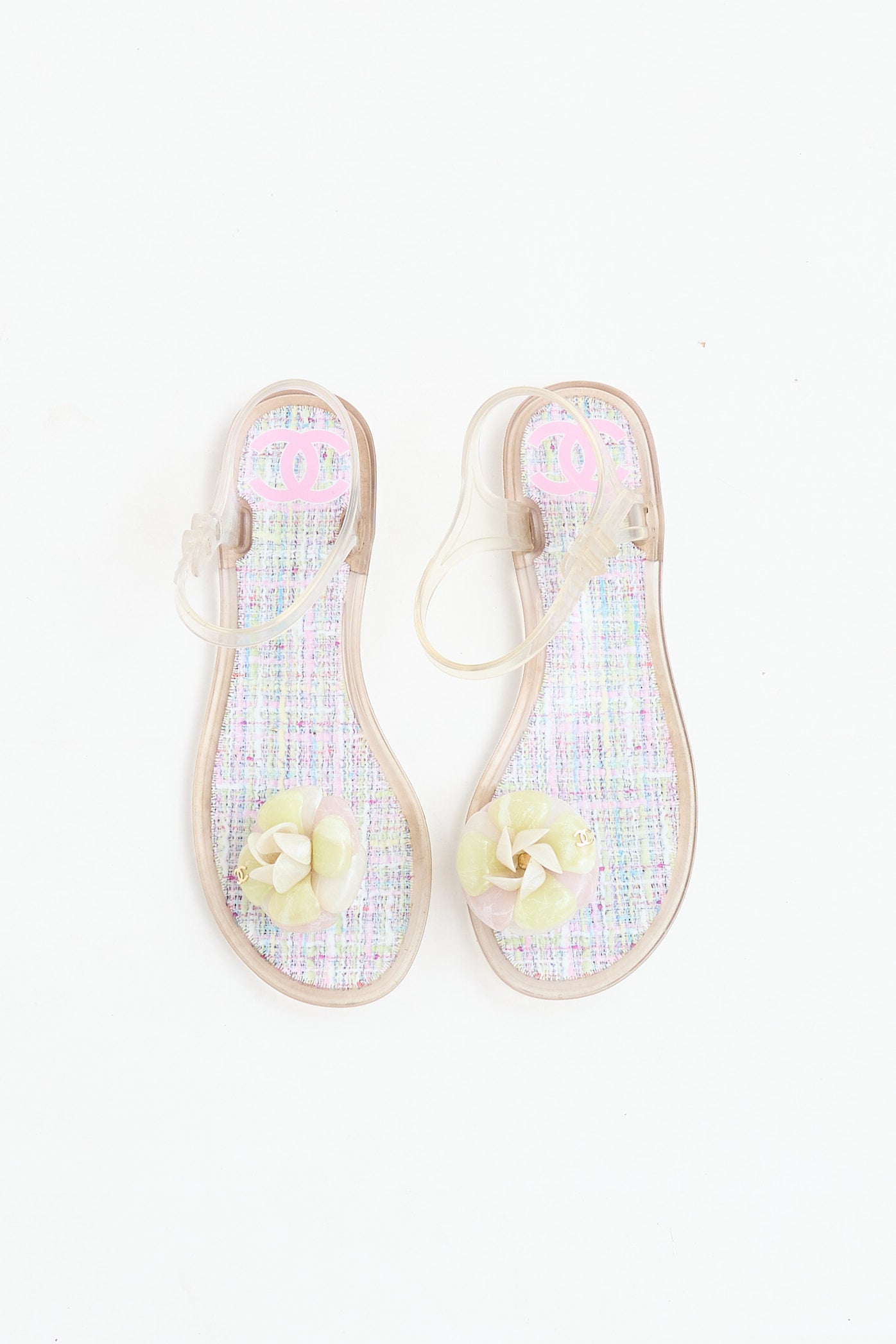 Pre-owned Chanel clear and multicolor Camellia jelly sandal featuring round toe, Camellia adornment on toe box with gold tone CC hardware, adjustable ankle strap, clear jelly midsole and tweed pattern insole.