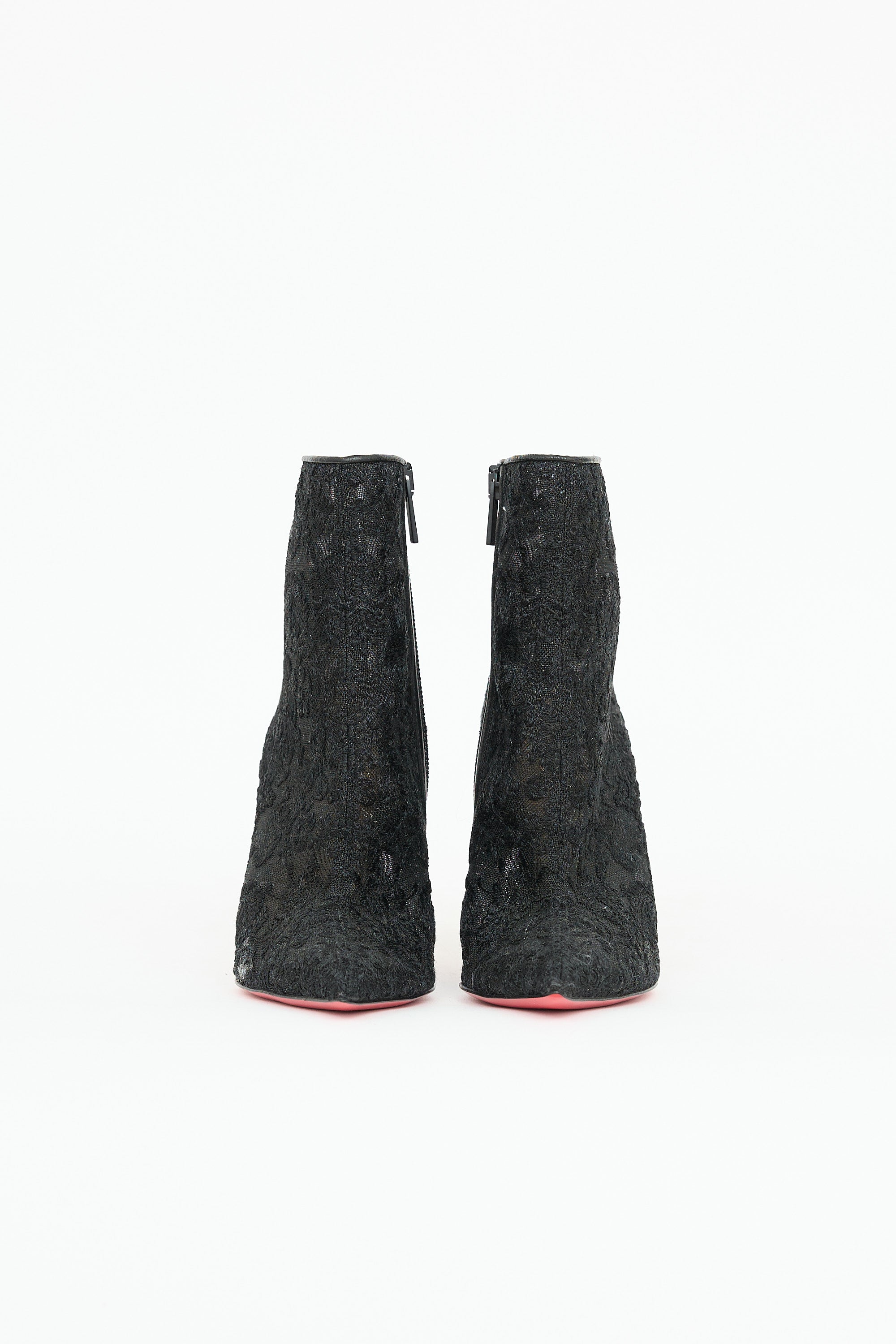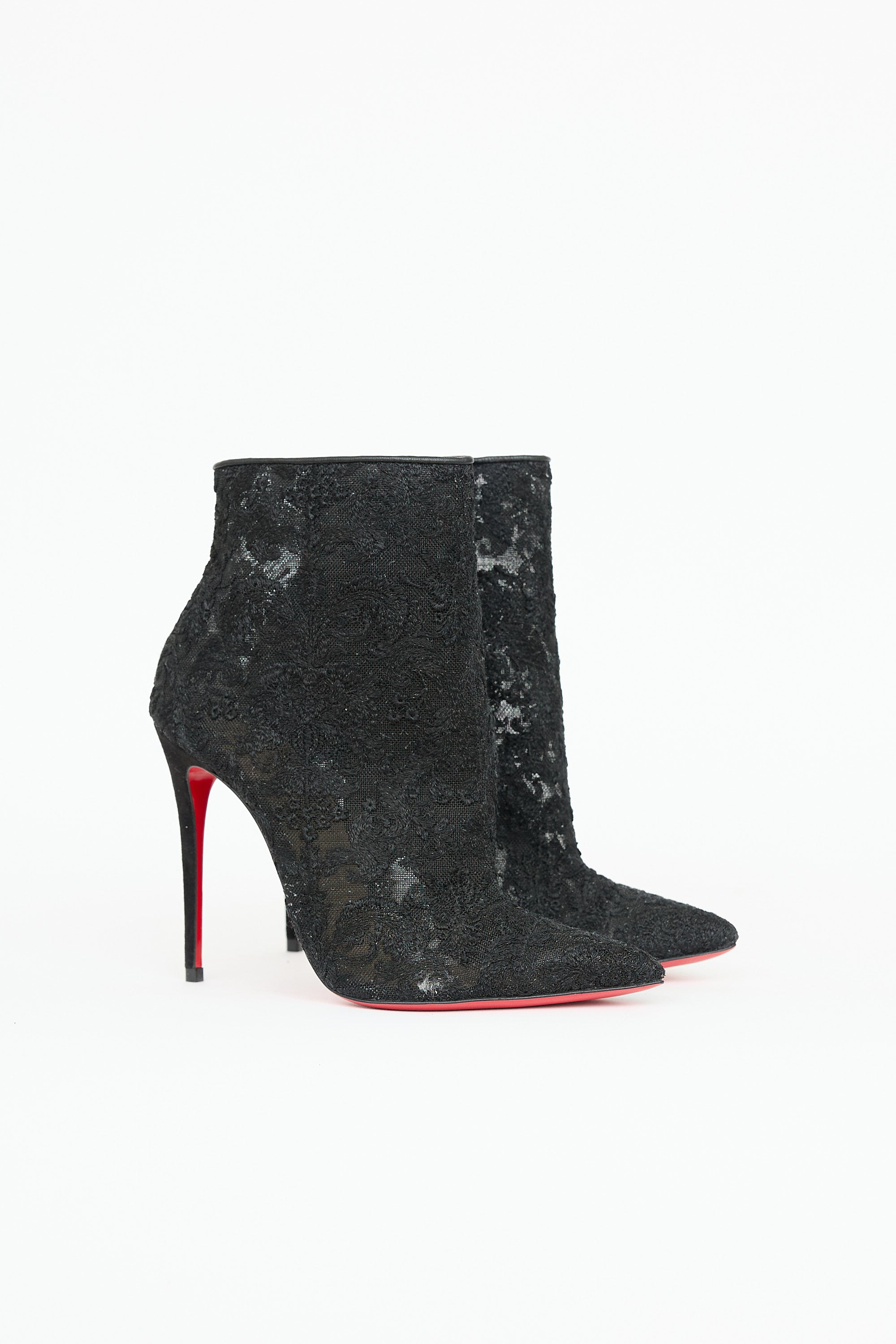 Pre-owned Christian Louboutin black lace bootie featuring pointed toe, zip closure at side, suede covered heel, and signature red lacquered heel.
