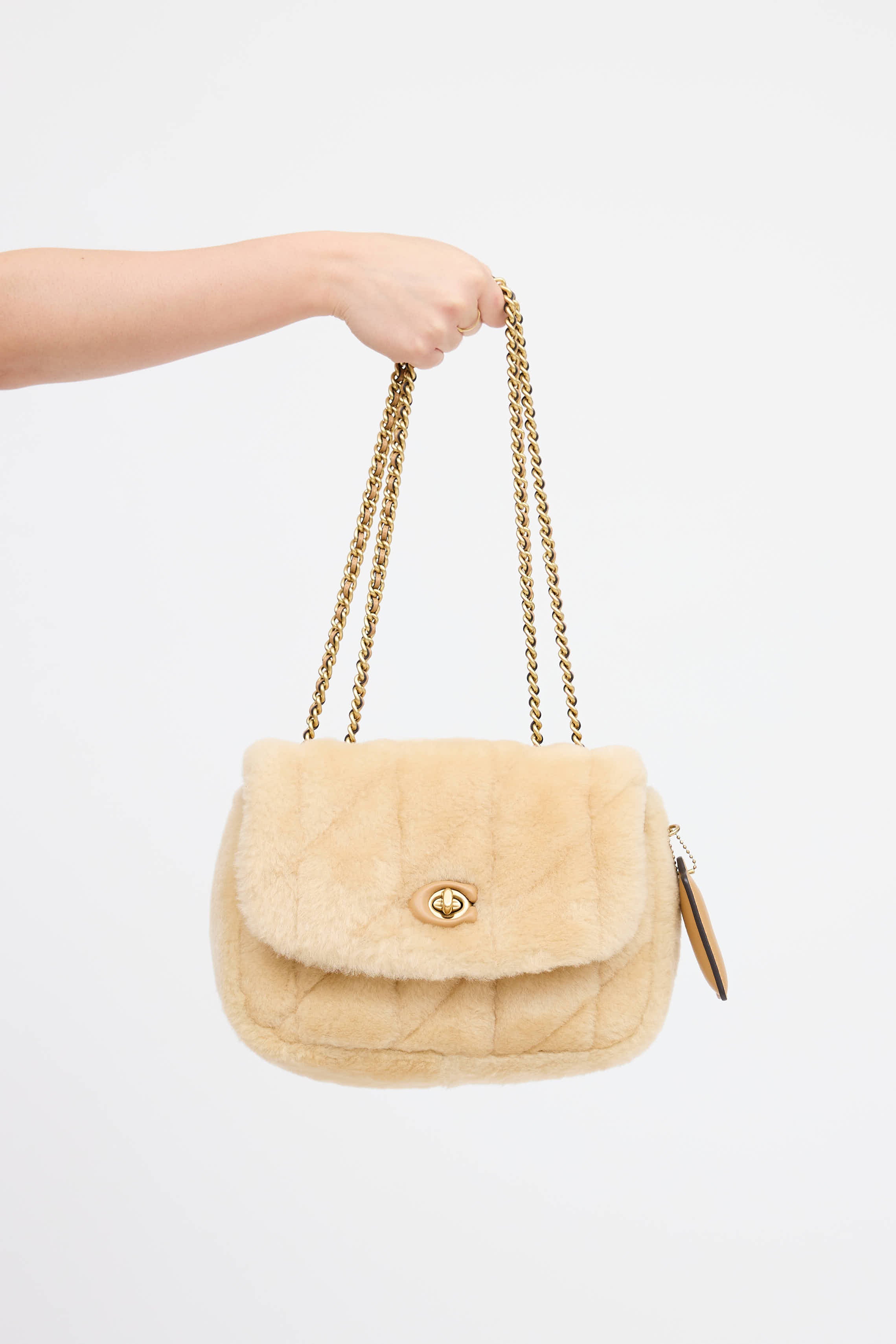 Pre-owned Coach beige Pillow Madison shearling crossbody bag featuring leather trim logo turn lock flap closure, adjustable chain link strap, and large slip pocket at back. Leather interior, one main compartment, one zip pocket, and one magnetic flap closure pocket.