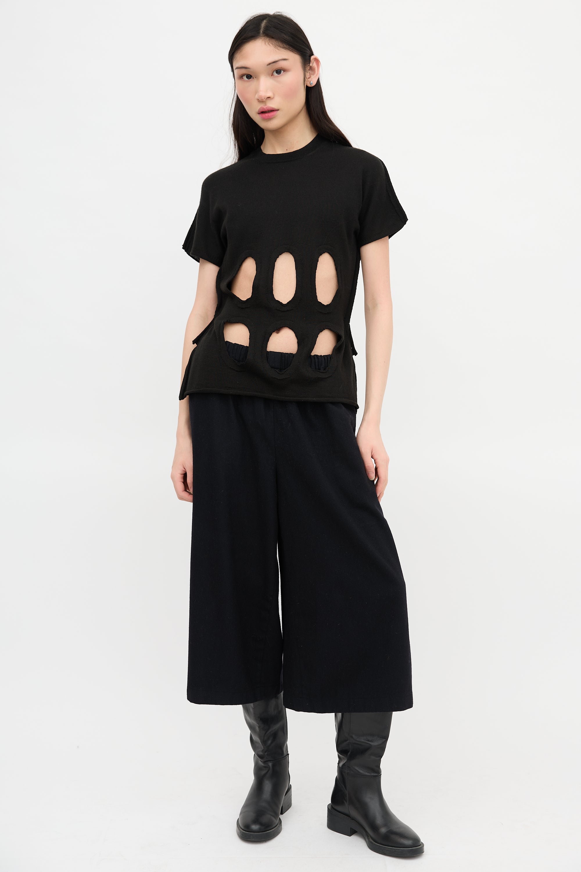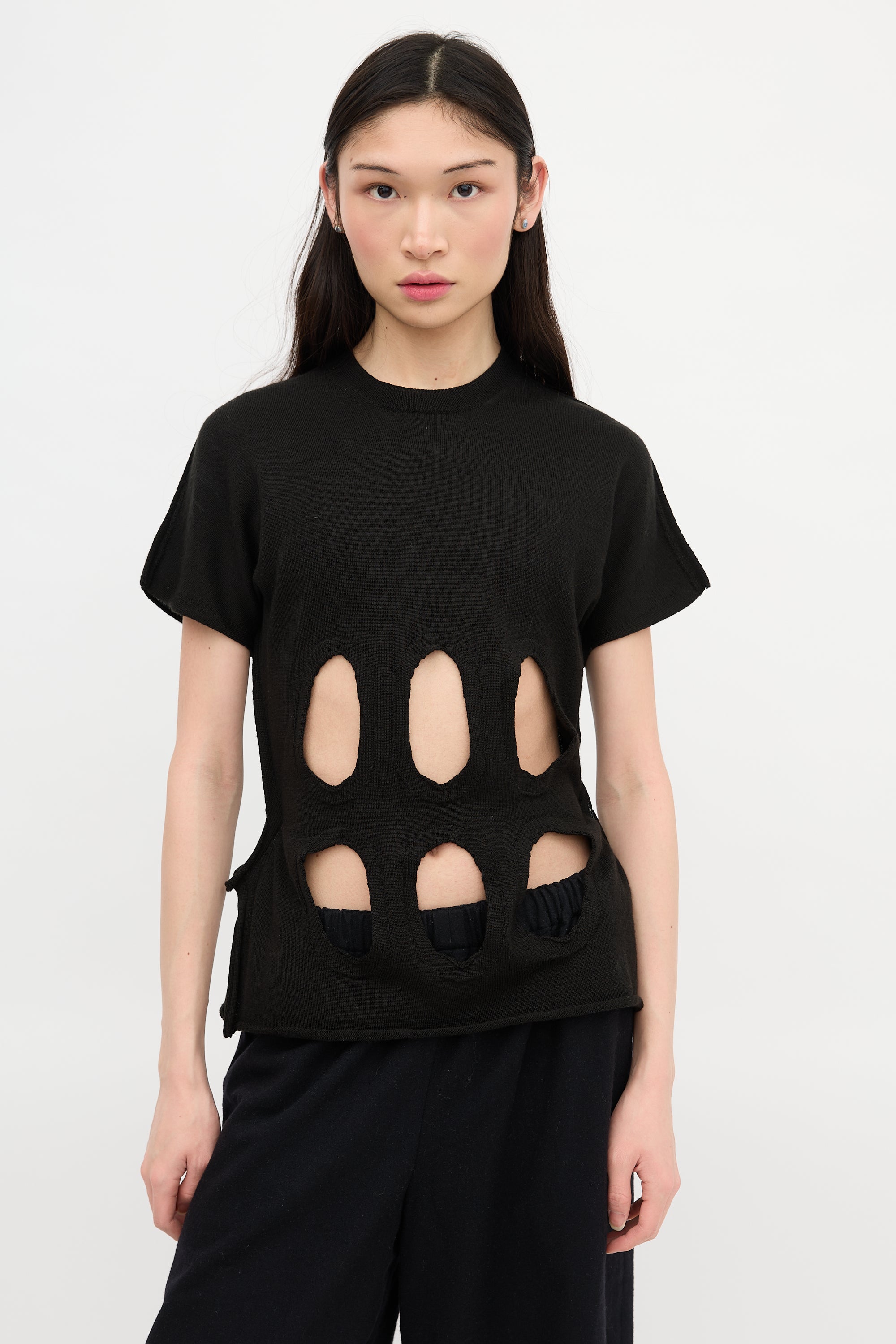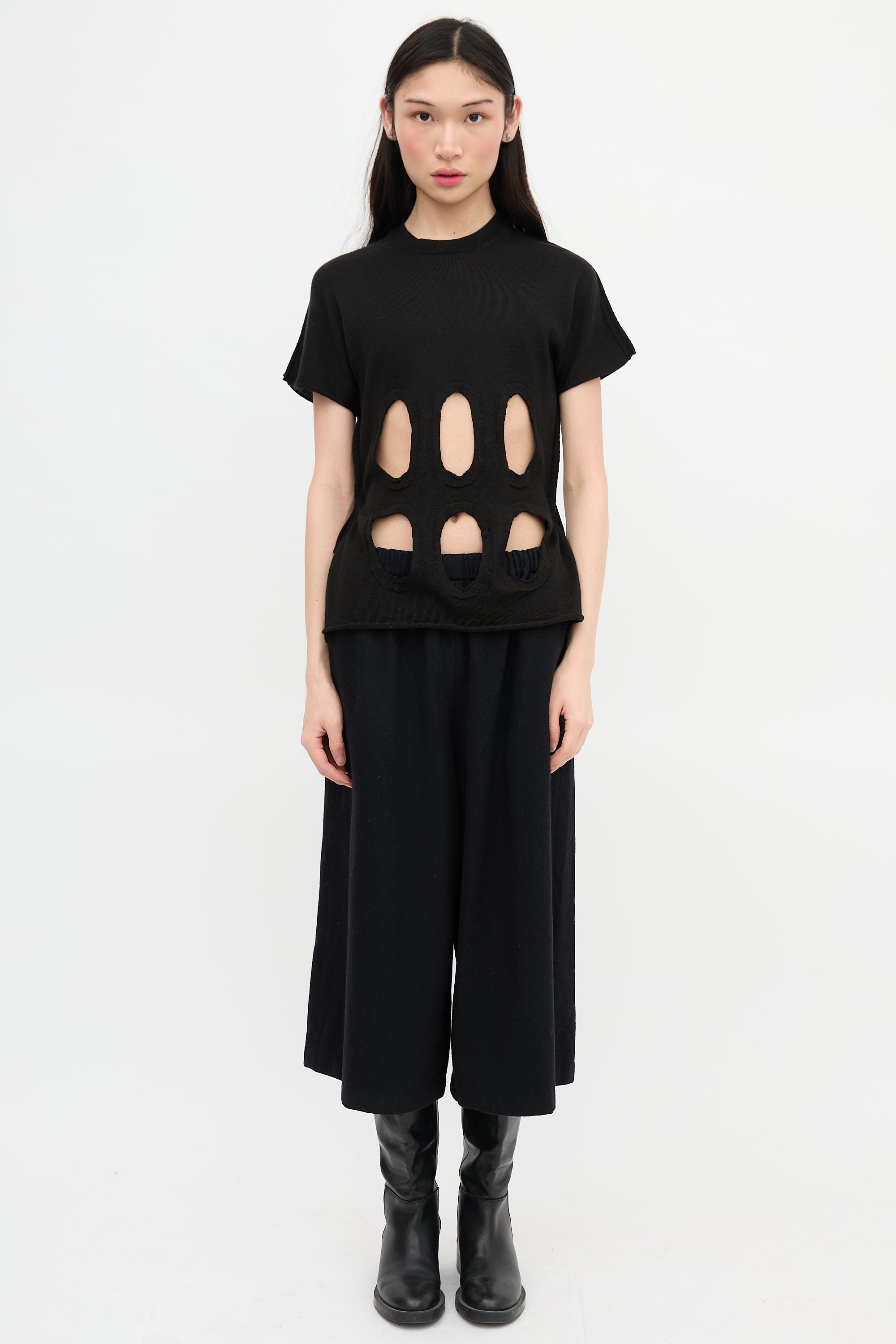Pre-owned Comme des Garçons black wool blend T-shirt featuring a crew neckline, cutouts at front, inverted seams, and rolled trim.