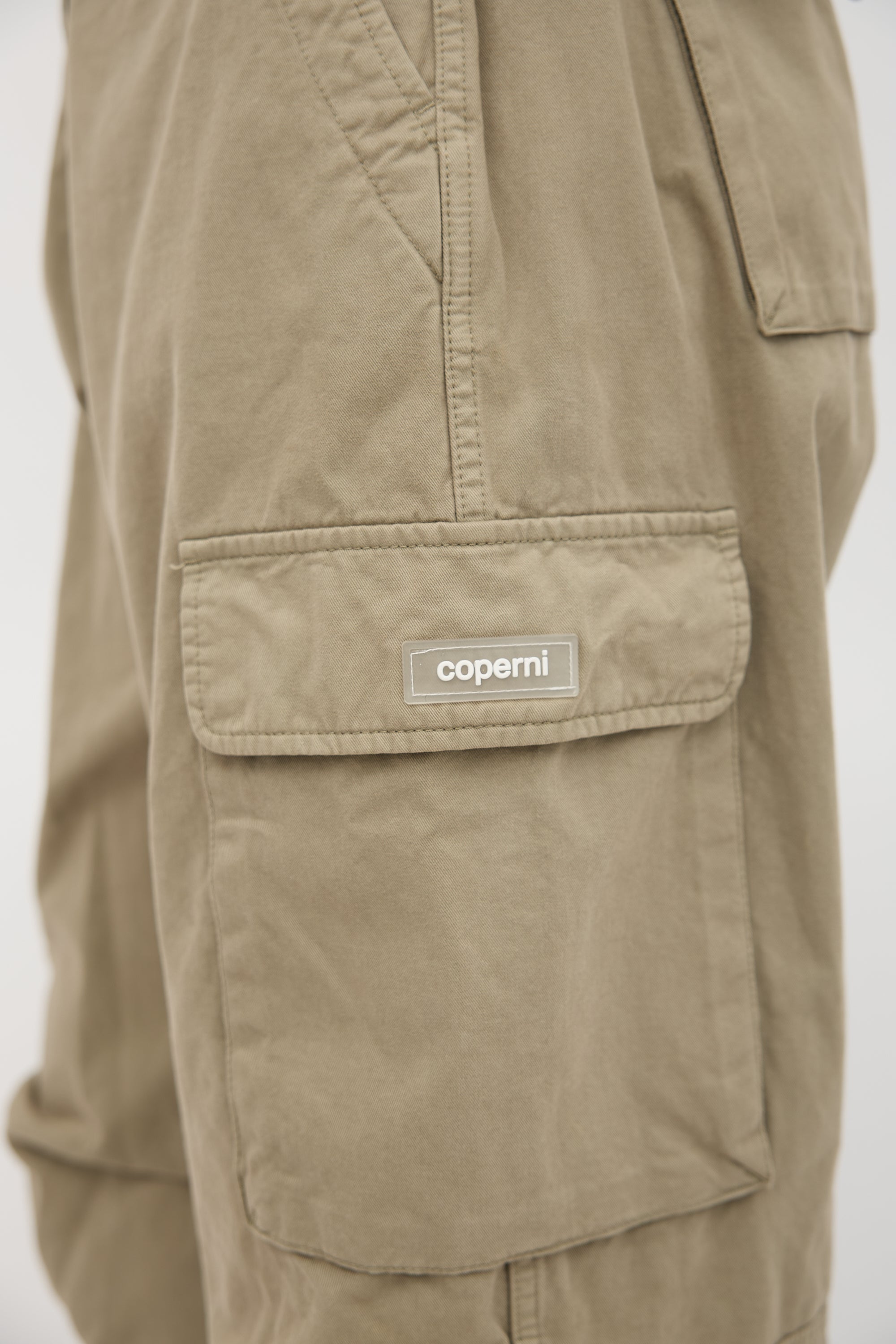 Pre-owned Coperni khaki brown cargo pants featuring wide leg, adjustable waist, four pocket styling, two cargo pockets at outseam, rubber logo tab at left cargo pocket, tucks at knees, drawstring hem, white rubber Jacron, and zip fly with silver tone logo snap button top closure.