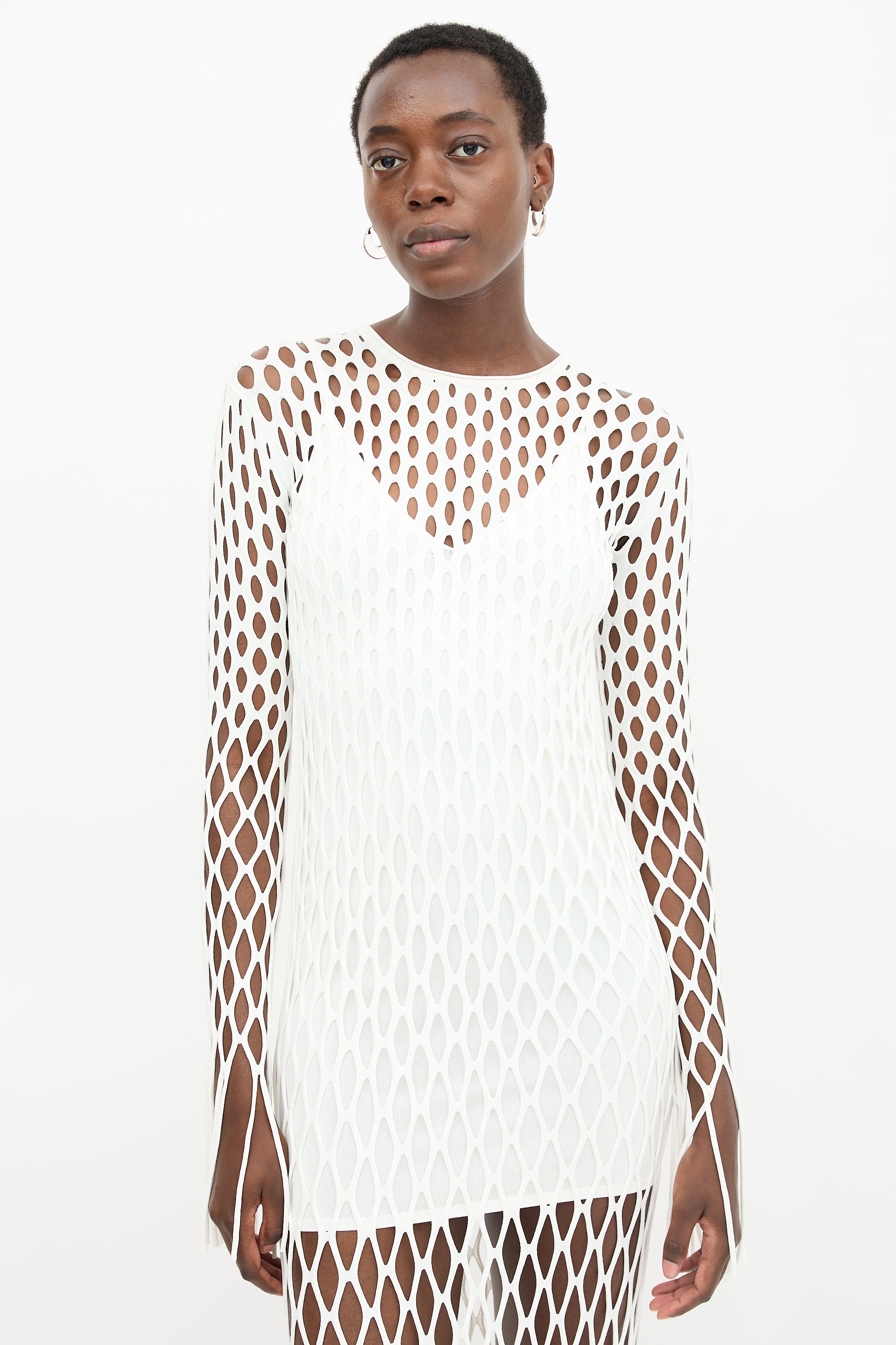 Pre-owned Dion Lee white knit mesh dress featuring round neckline and fringe trim. Comes with slip.