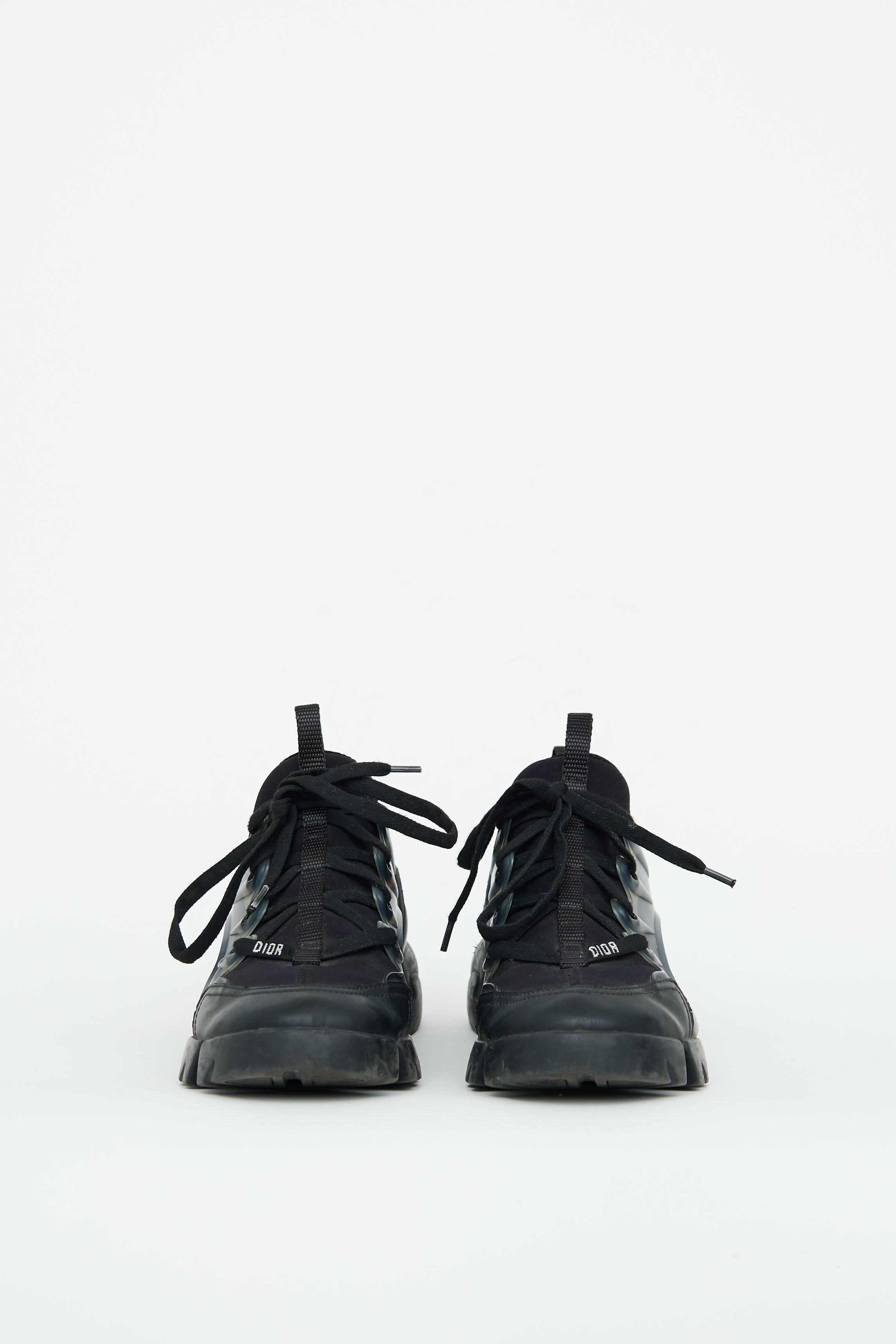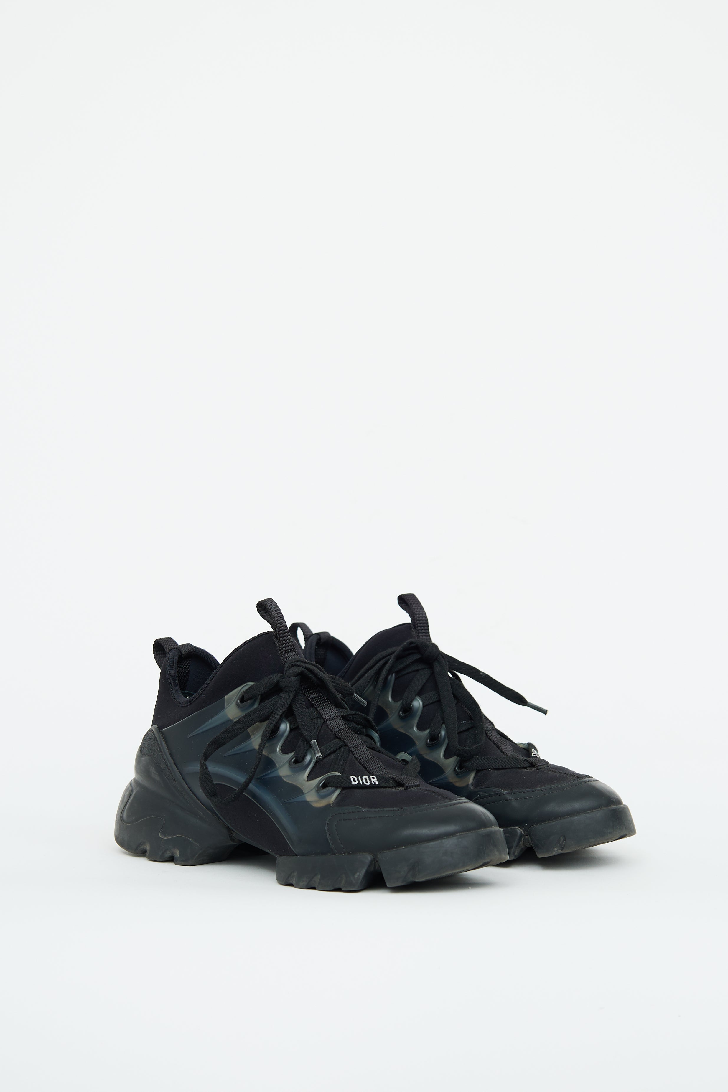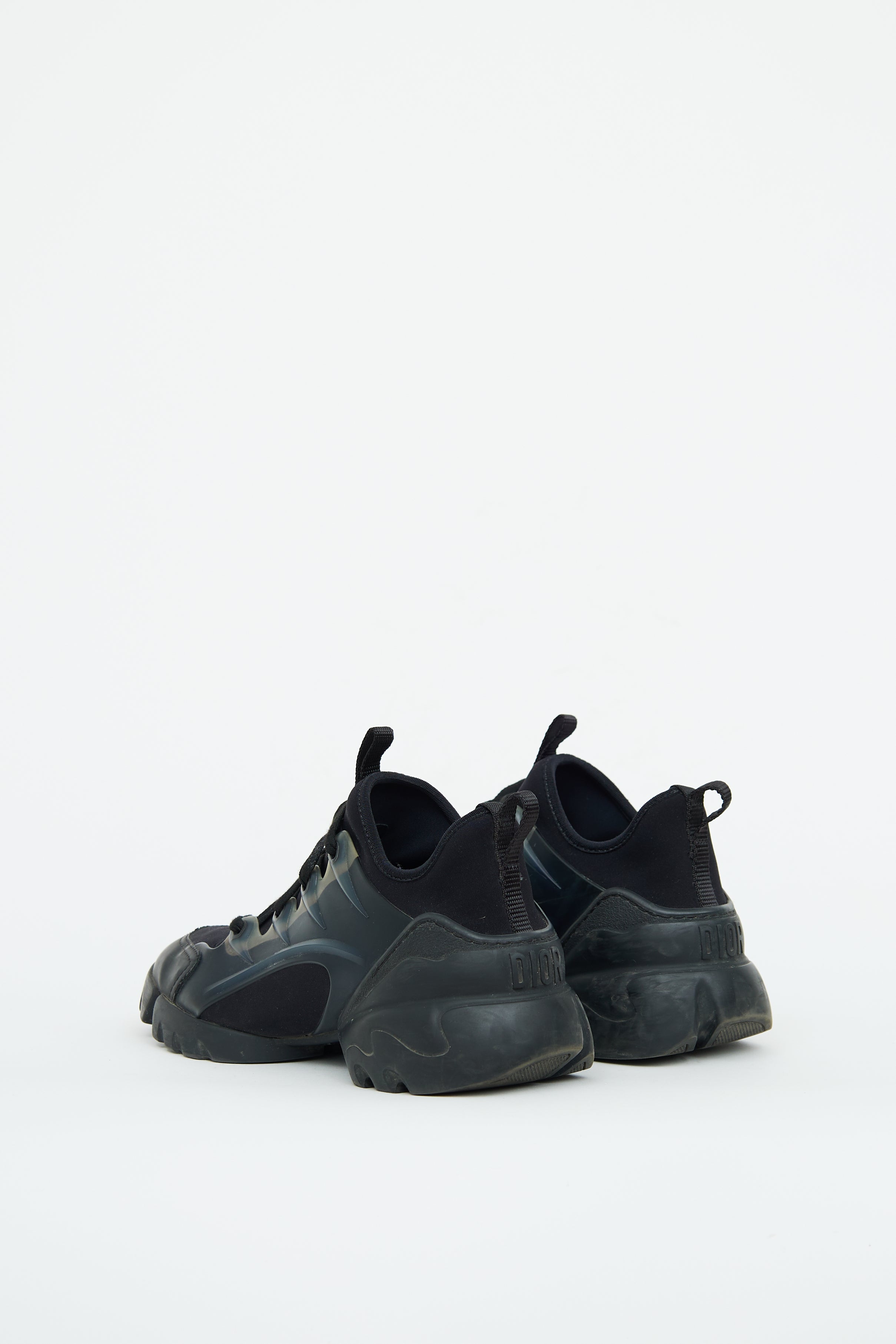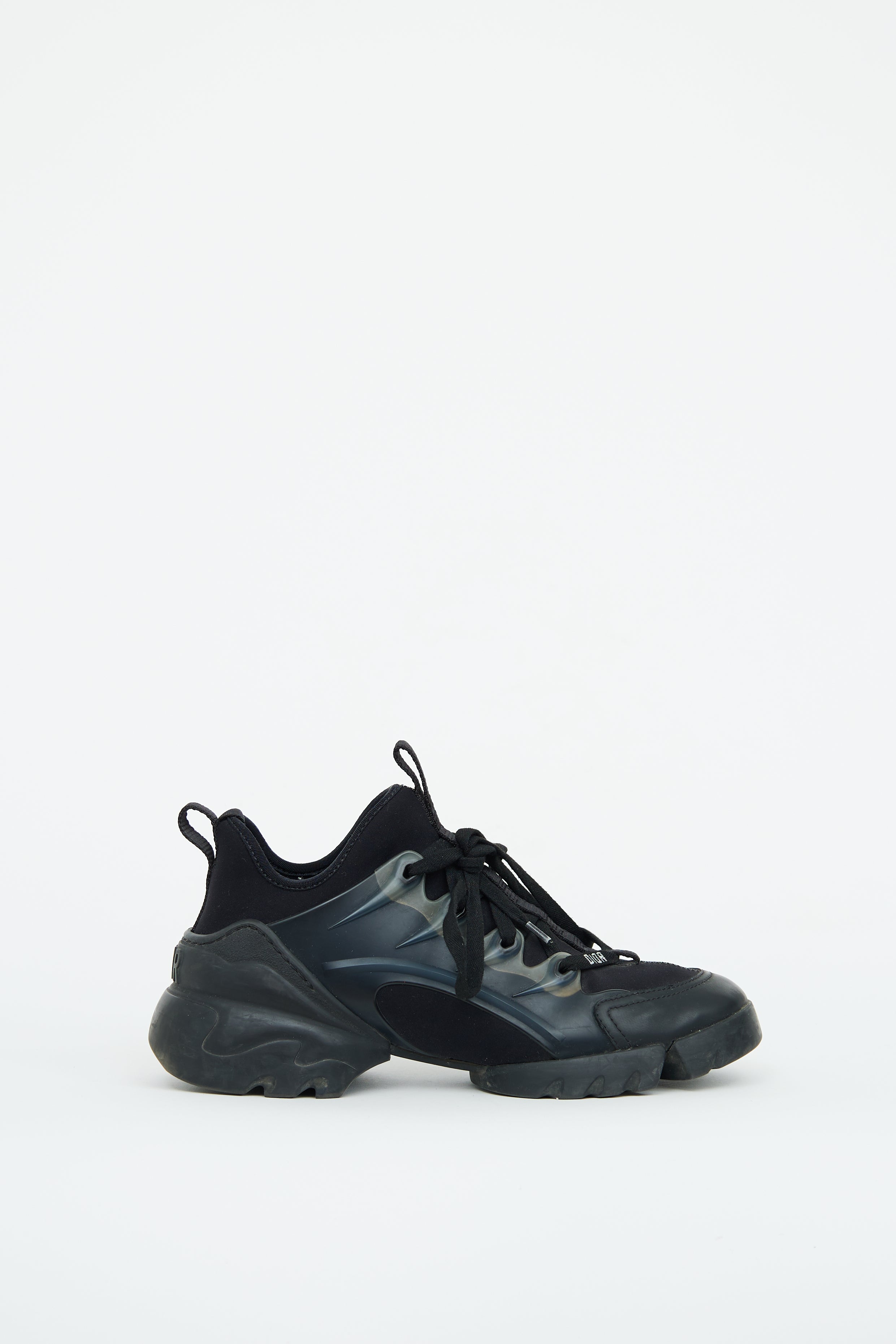 Pre-owned Dior black neoprene D-Connect sneakers featuring round toe, lace up upper, Dior logo text on laces and chunky midsole styling.