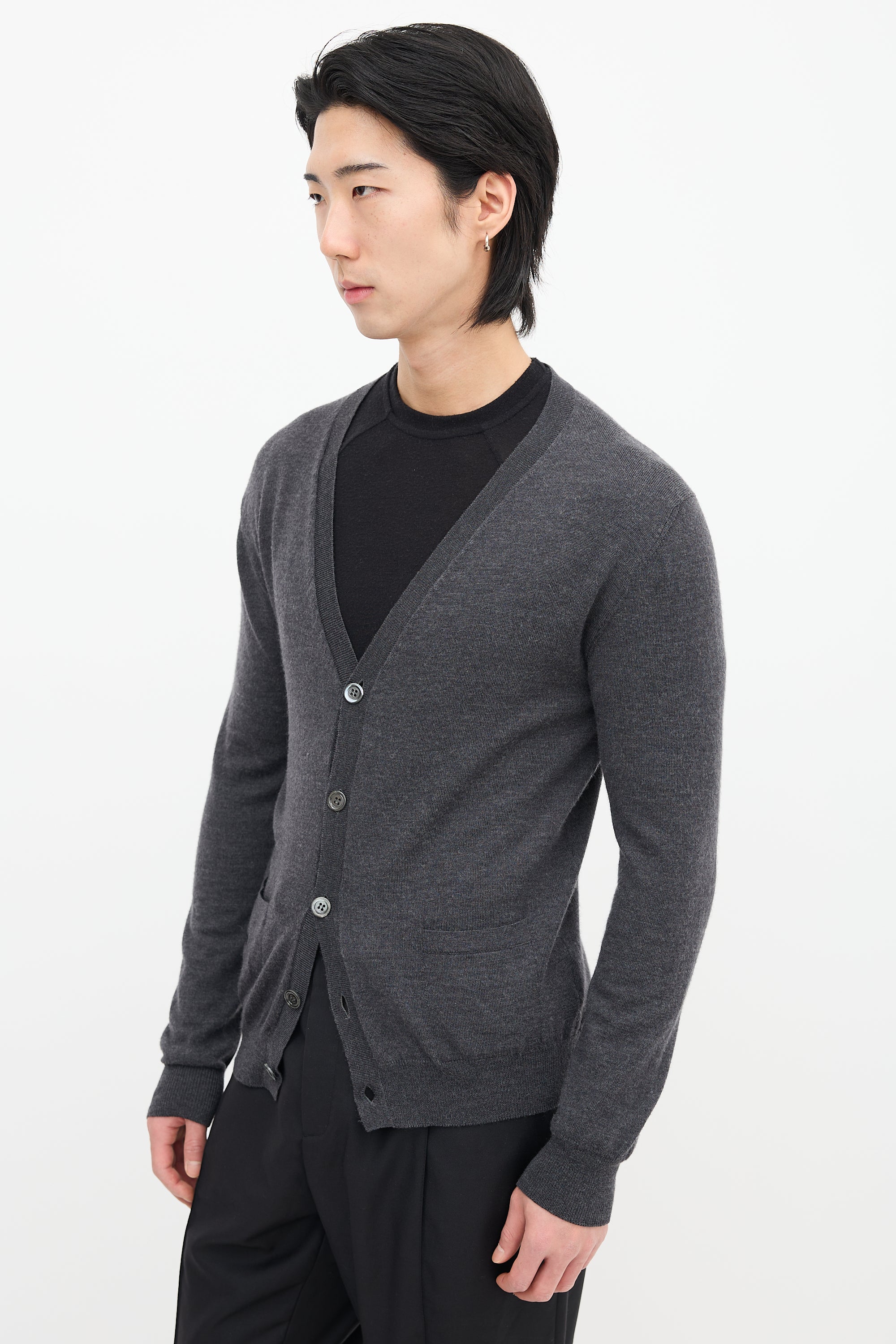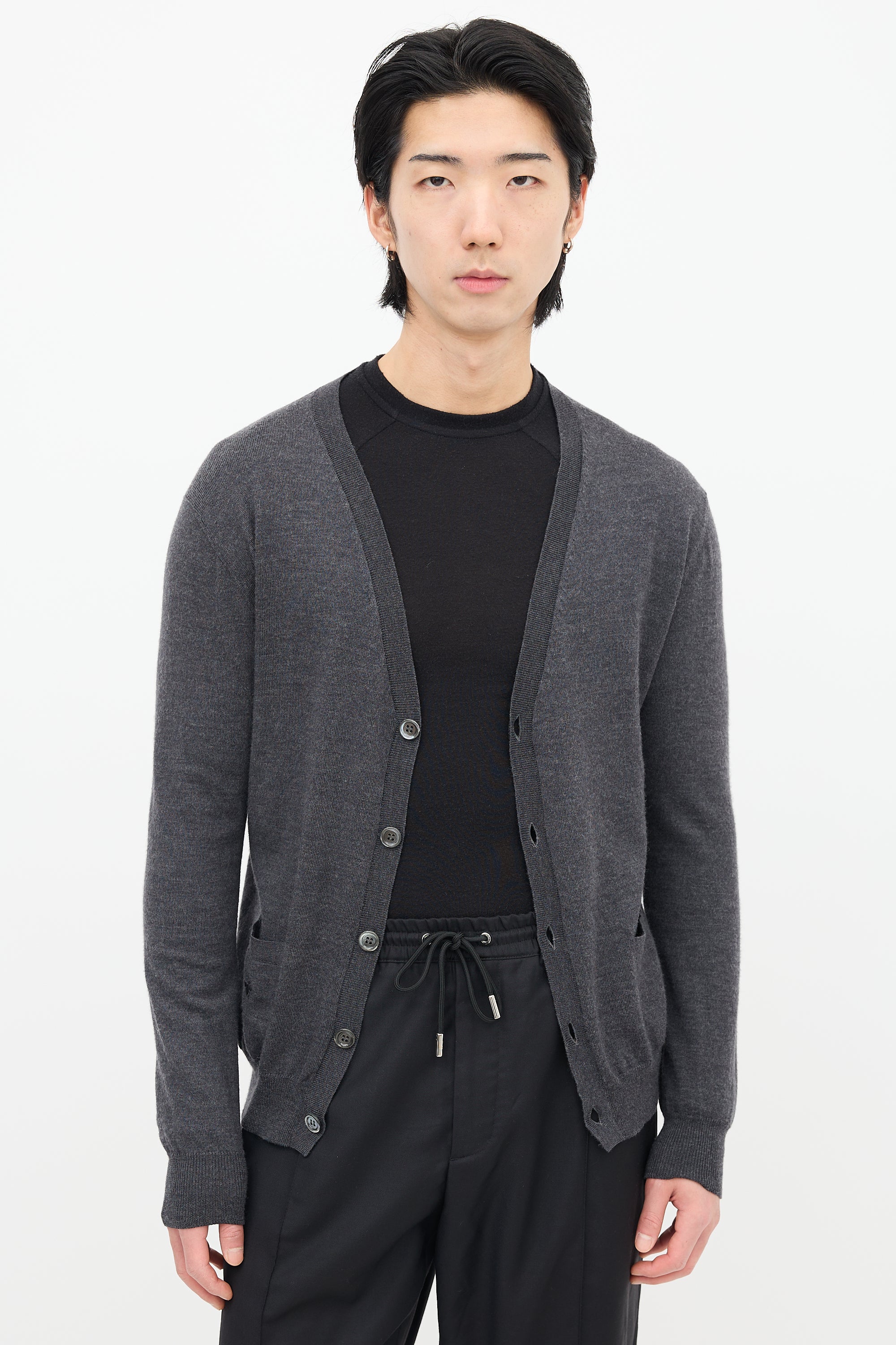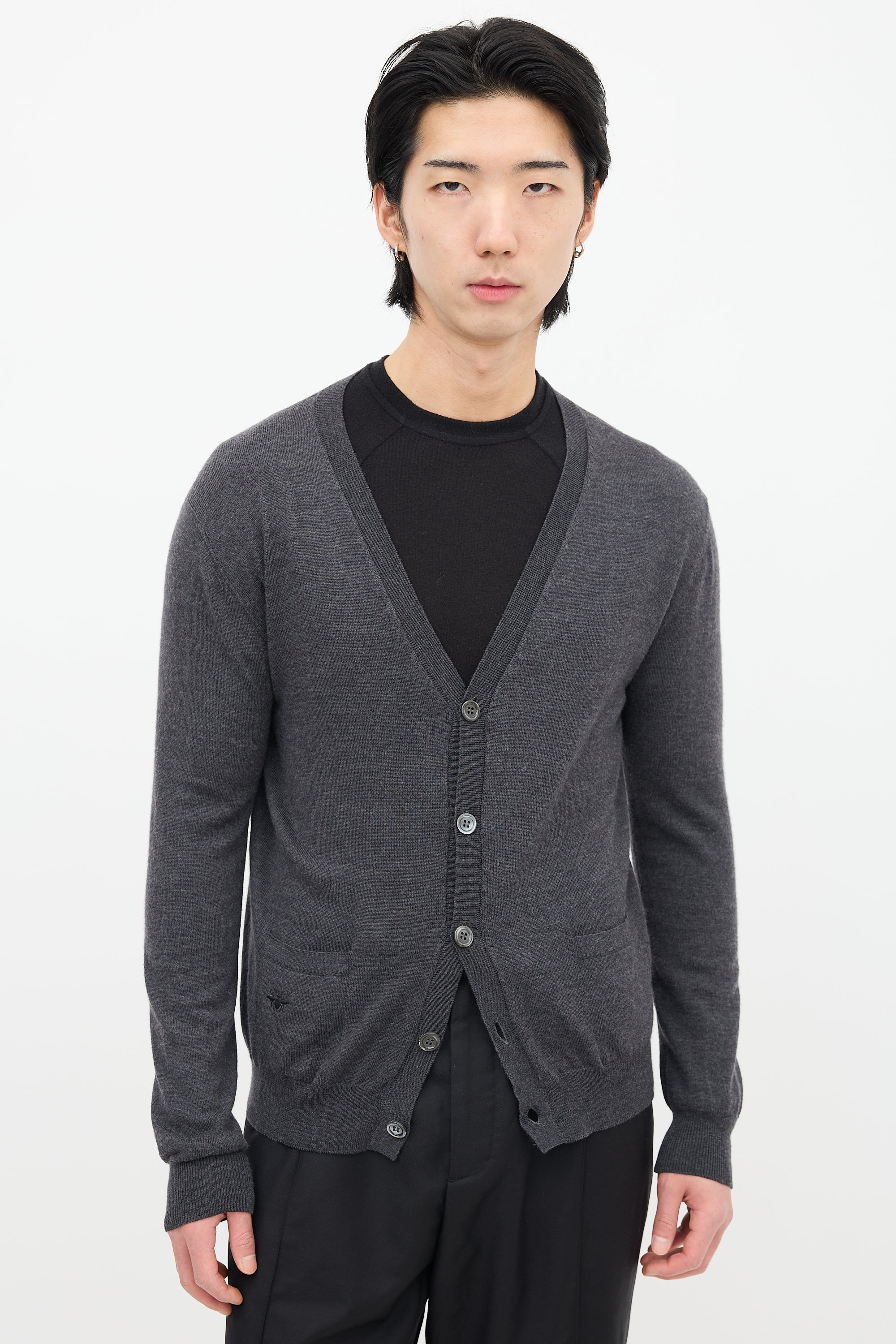 Pre-owned Dior dark grey wool cardigan featuring a V-neckline, button up front, two front pockets, tonal embroidered bee motif at right pocket, and ribbed placket, hem, and cuffs.