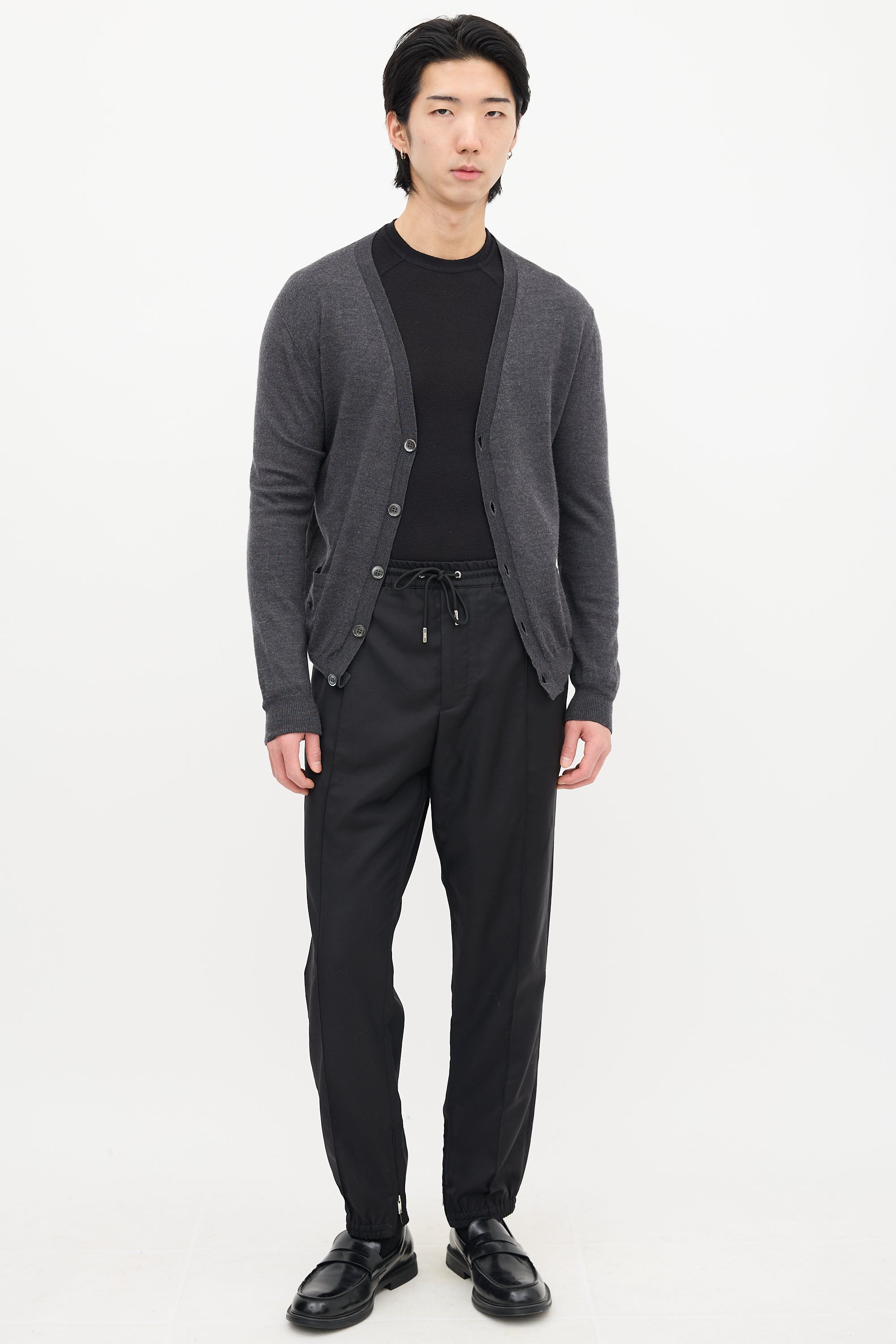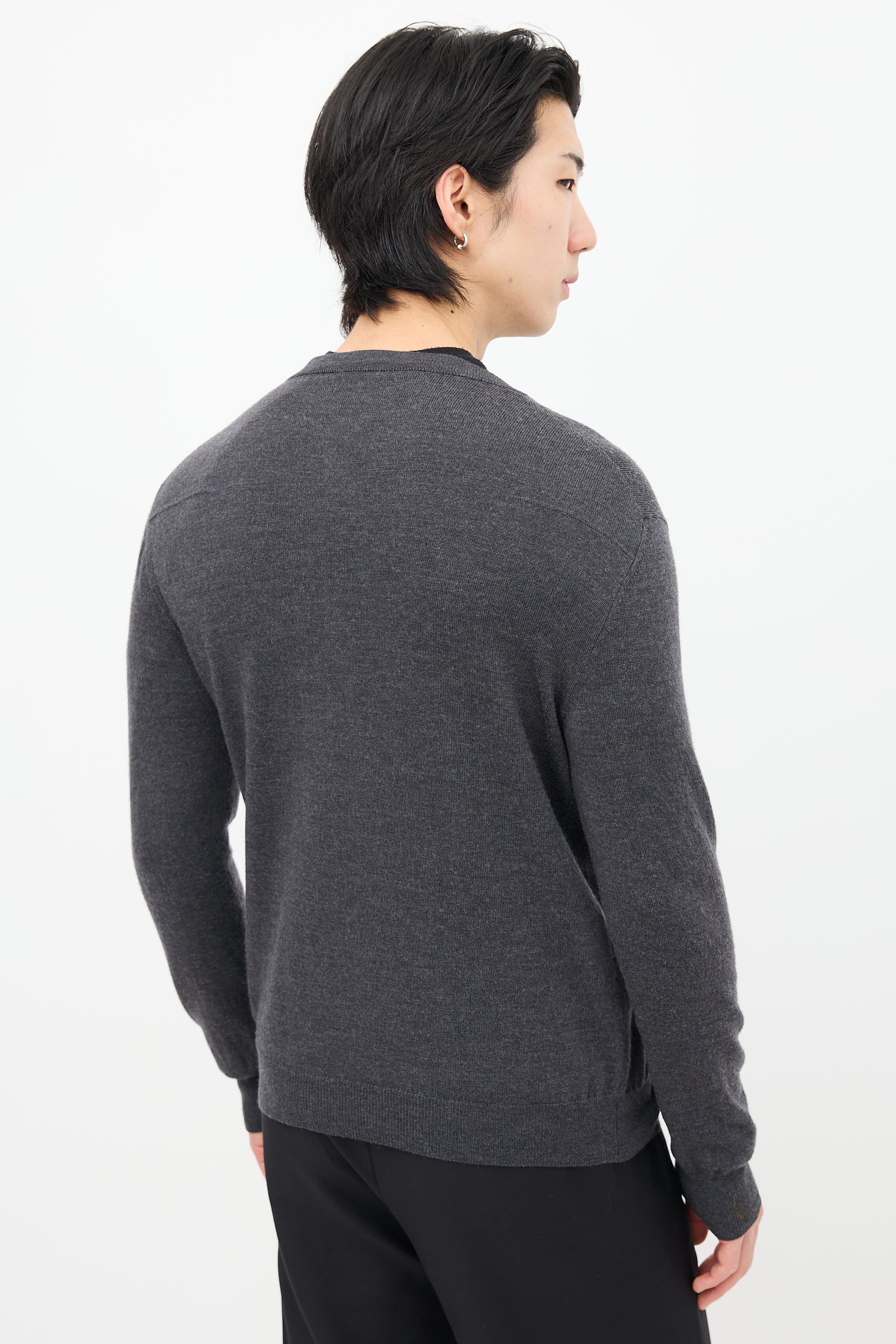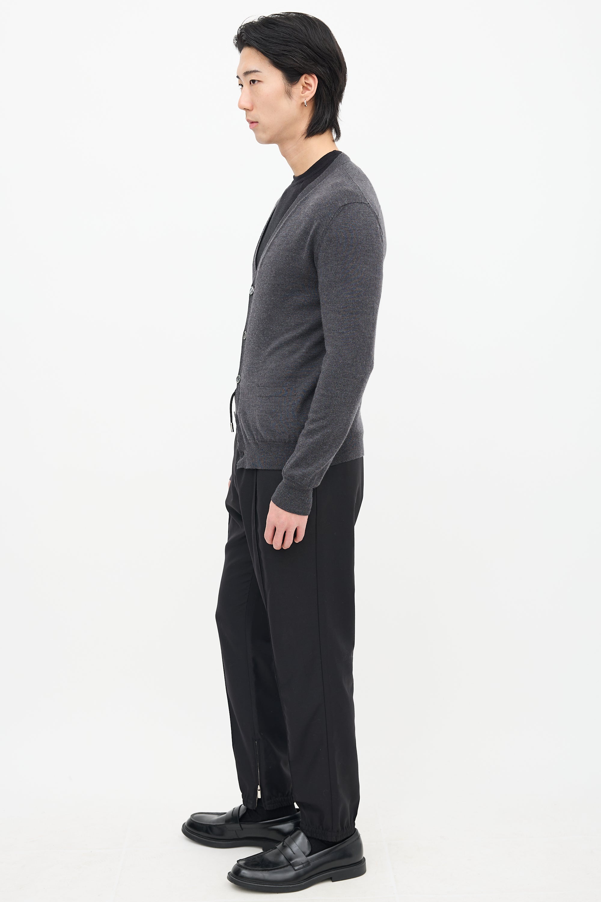 Pre-owned Dior dark grey wool cardigan featuring a V-neckline, button up front, two front pockets, tonal embroidered bee motif at right pocket, and ribbed placket, hem, and cuffs.