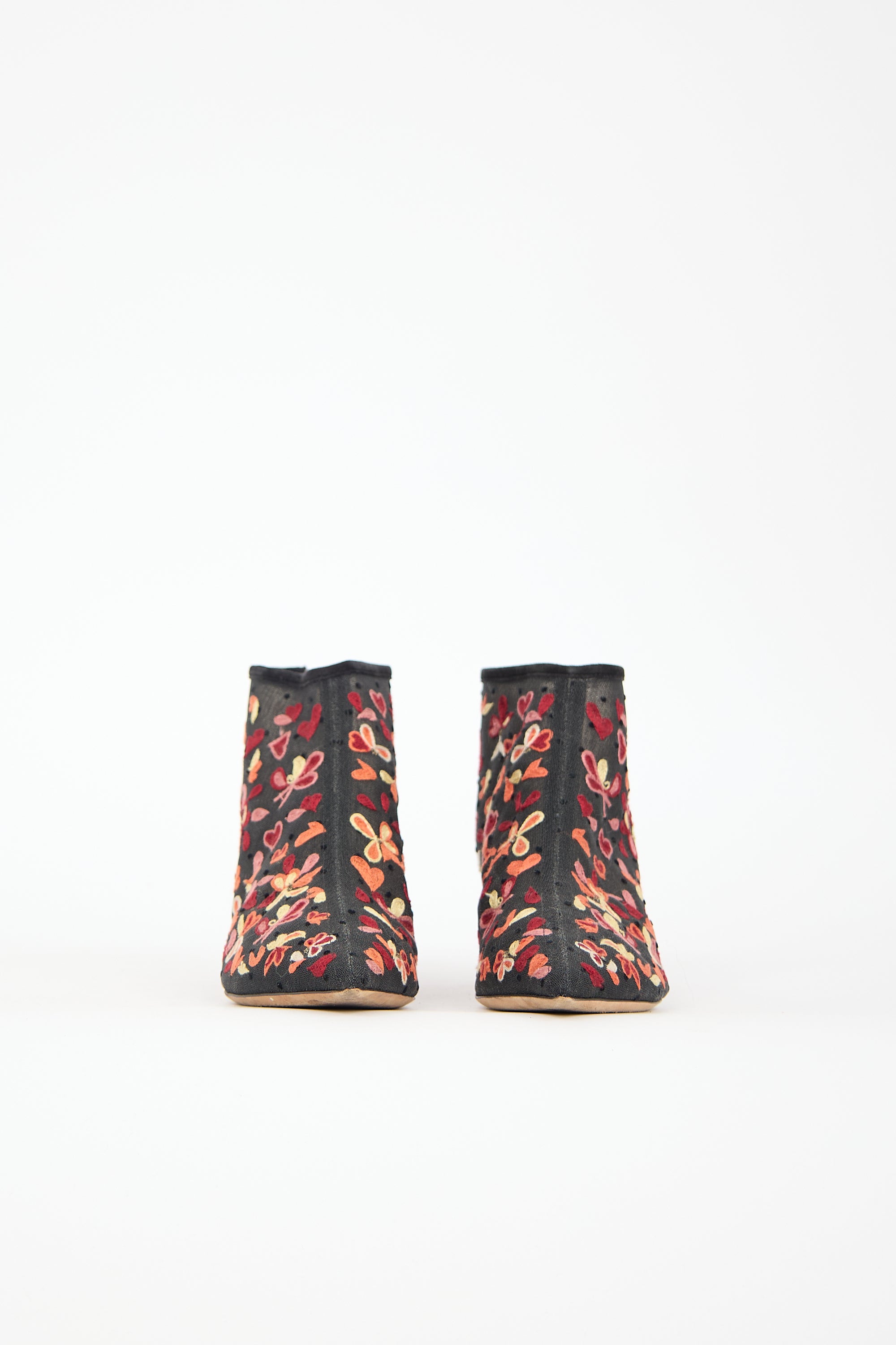Pre-owned Dior black mesh boots featuring pointed toe, orange and multicolour floral embroidery, back zip closure, and covered kitten heel.