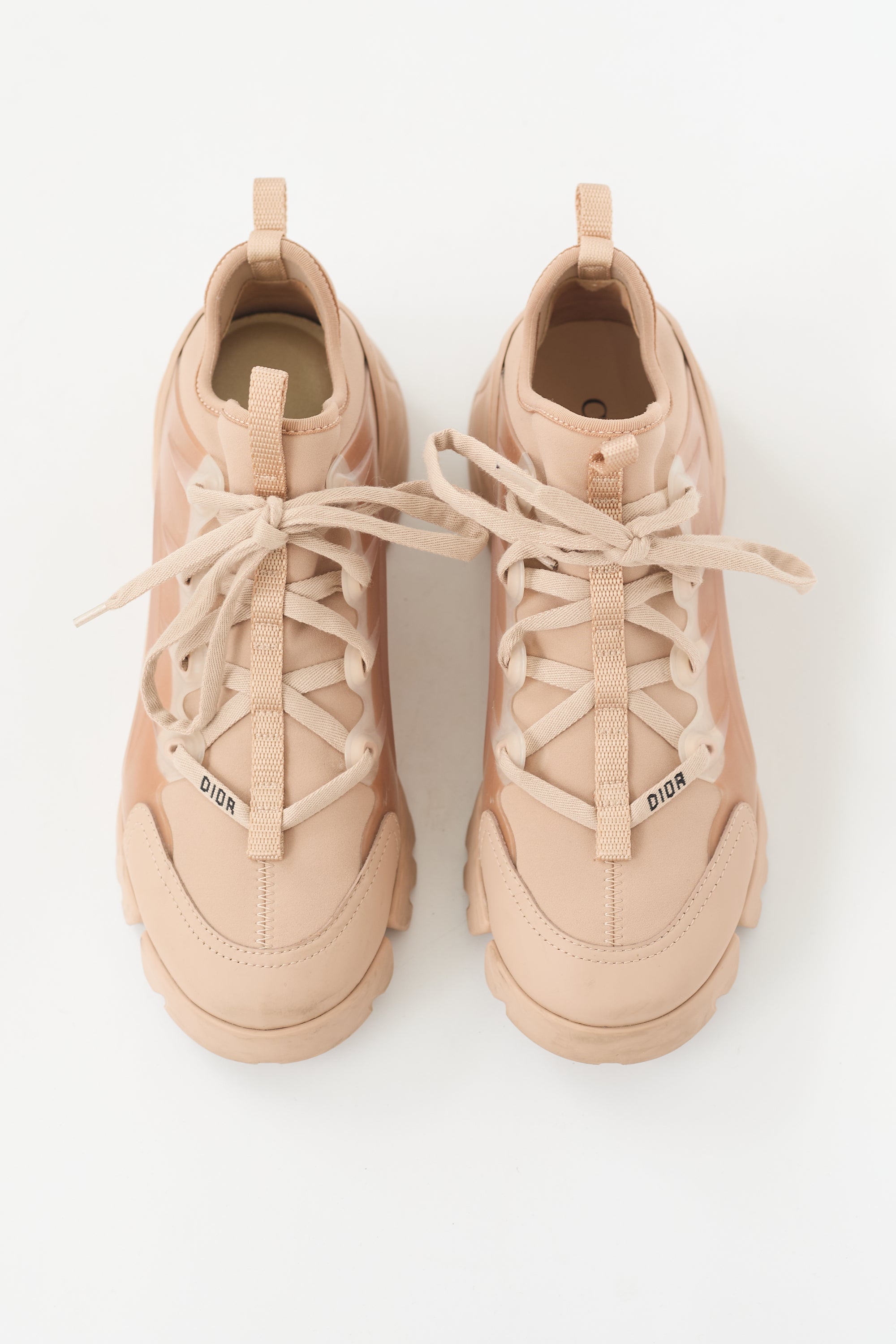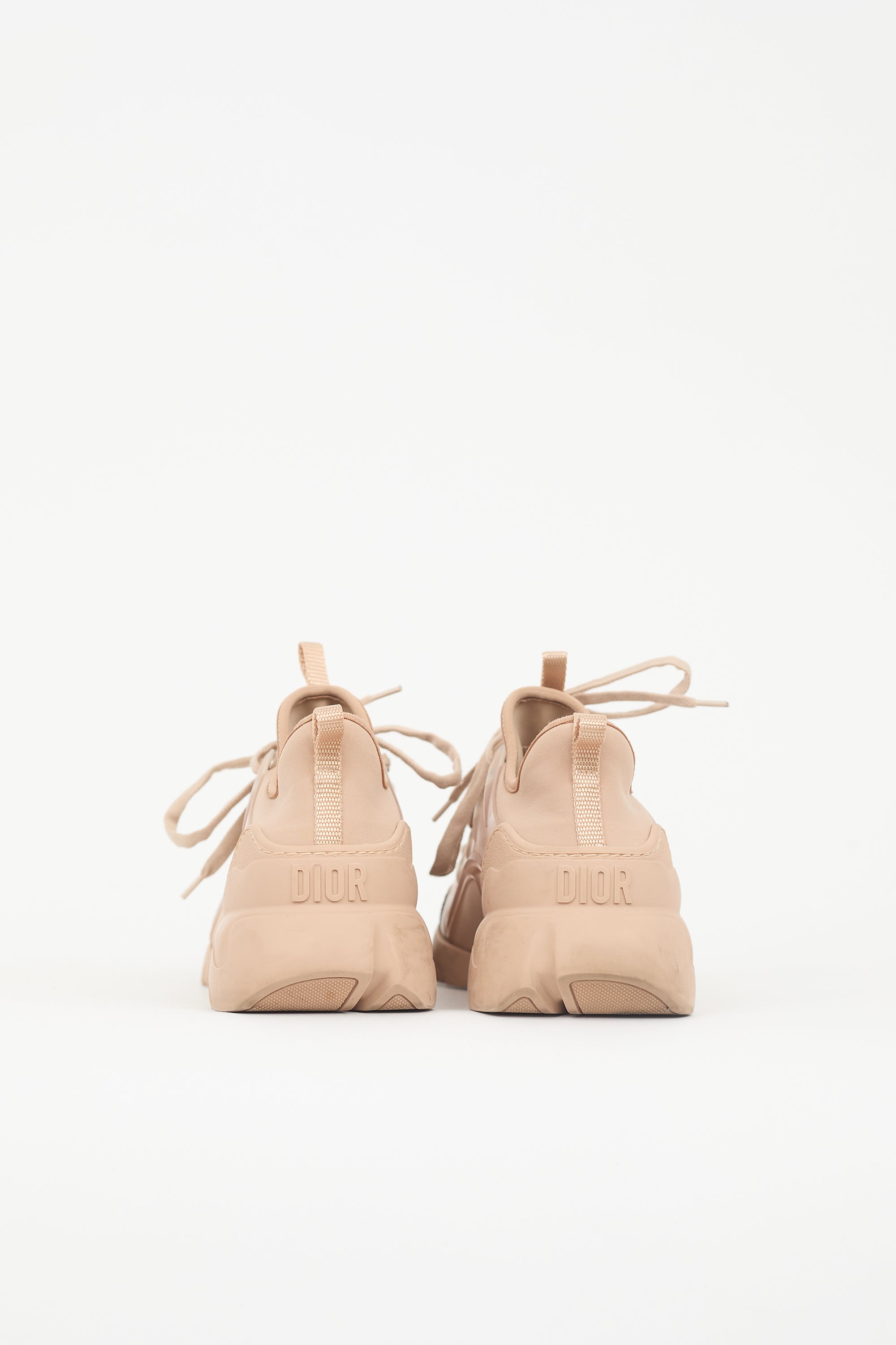 Pre-owned Dior beige D-Connect sneakers featuring rounded toe, lace up vamp with embroidered logo, rubber panels, pull tabs at front and back collar, embossed logo at heel, and tonal rubber split sole.