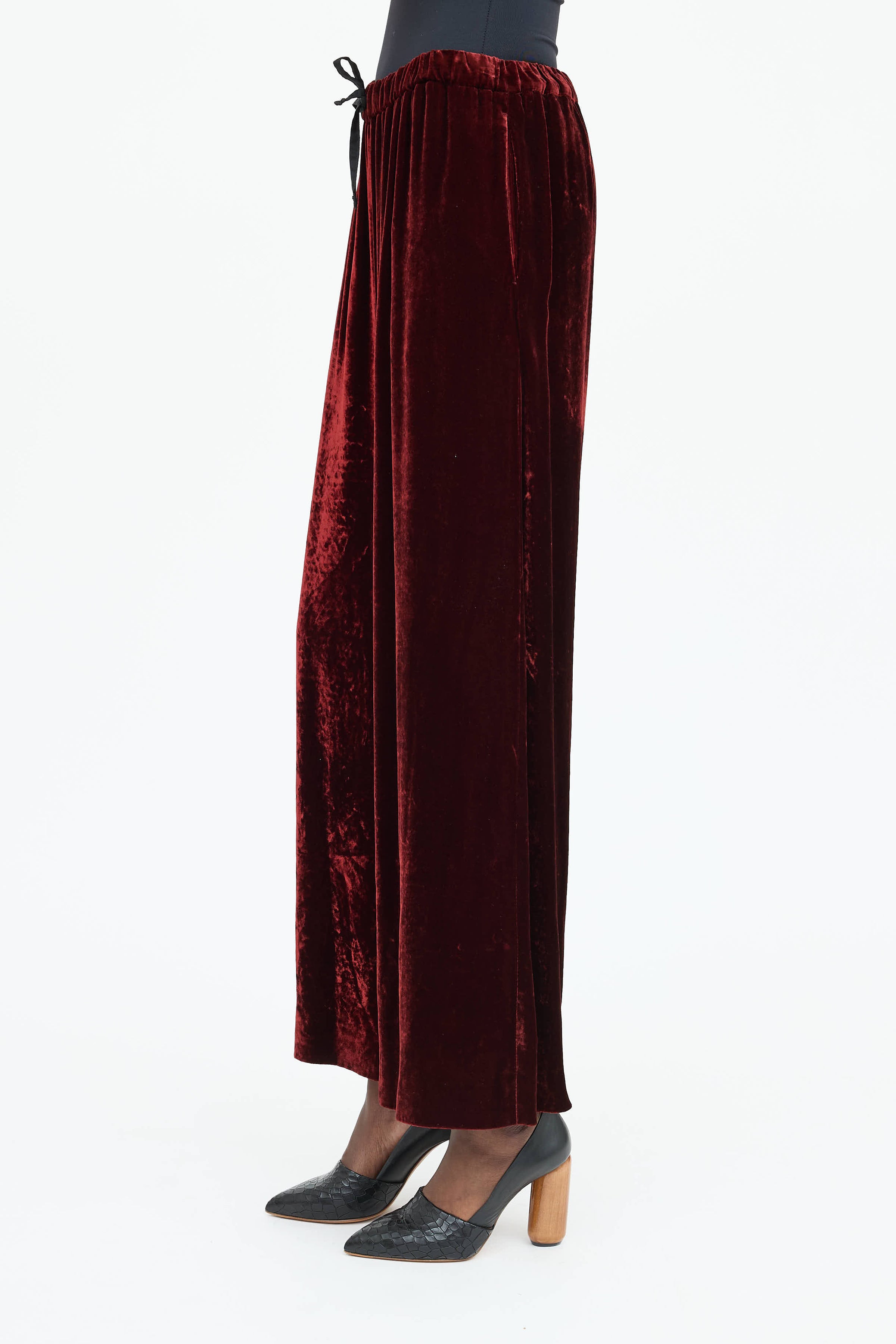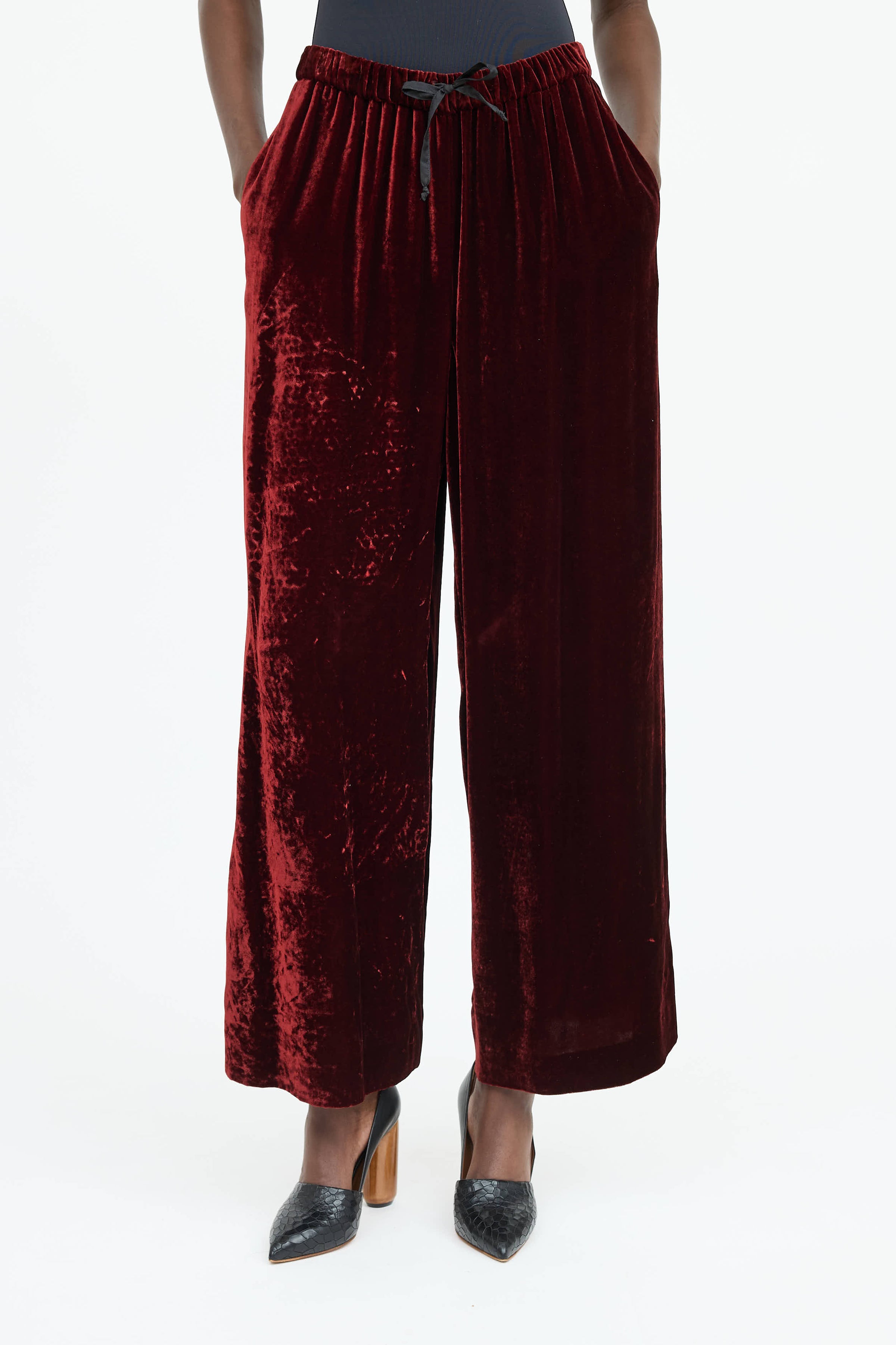 Pre-owned Dries Van Noten red velvet pant featuring wide leg styling, drawstring at waist, and slit pockets at hip.