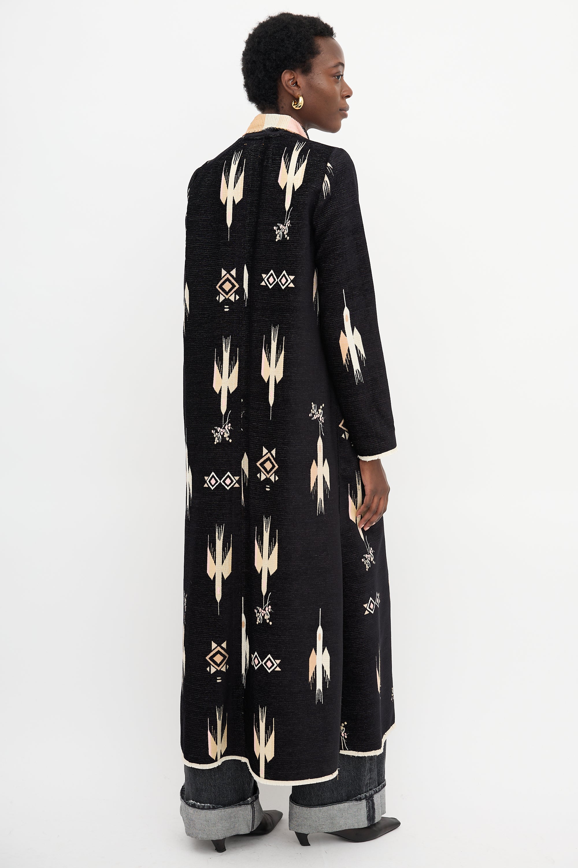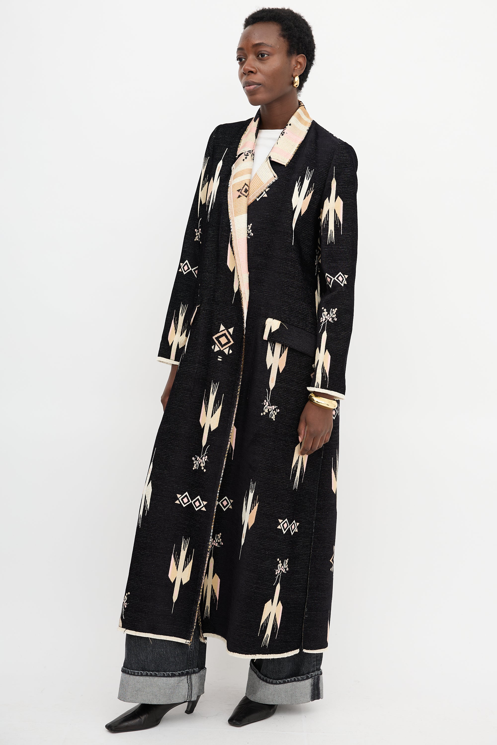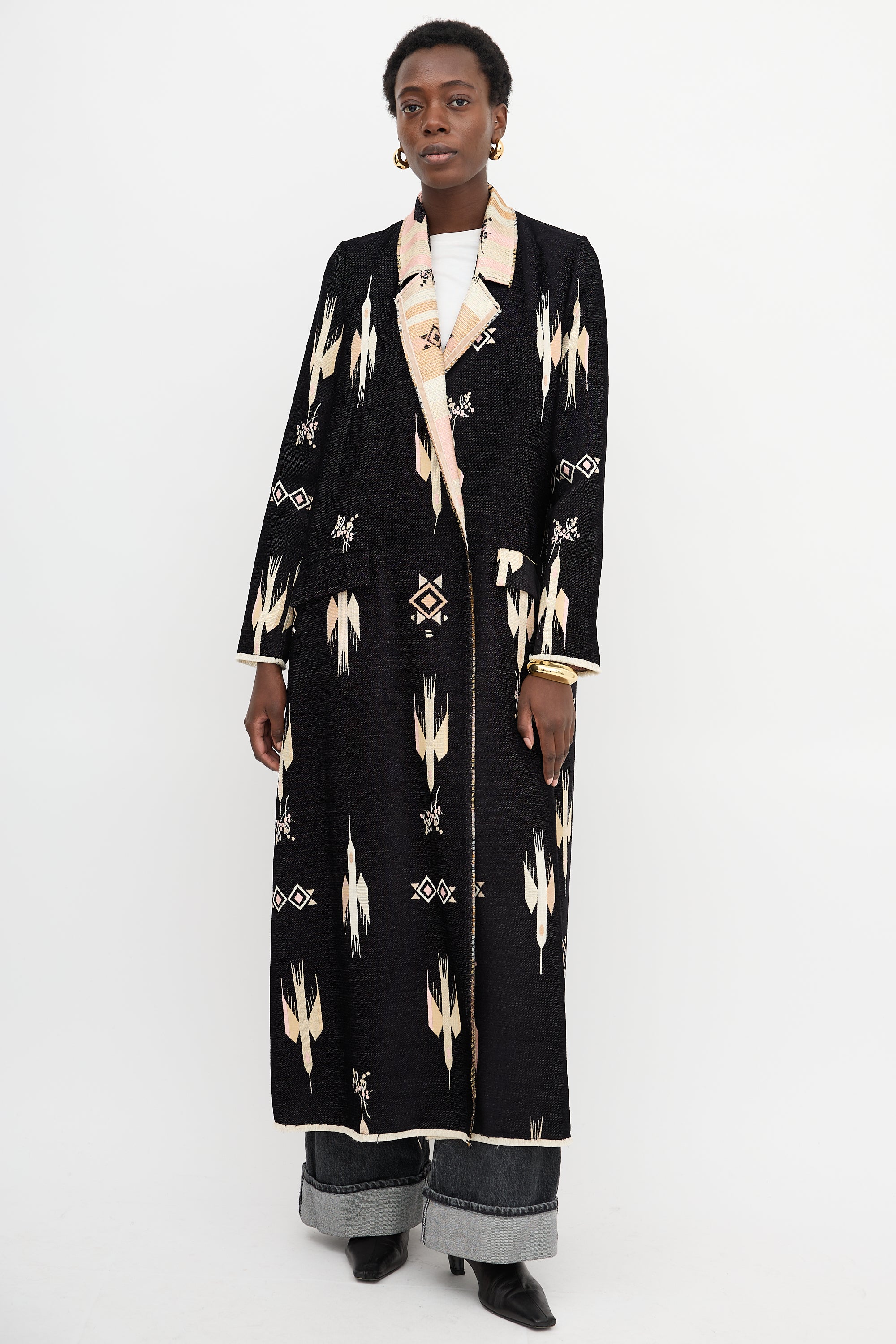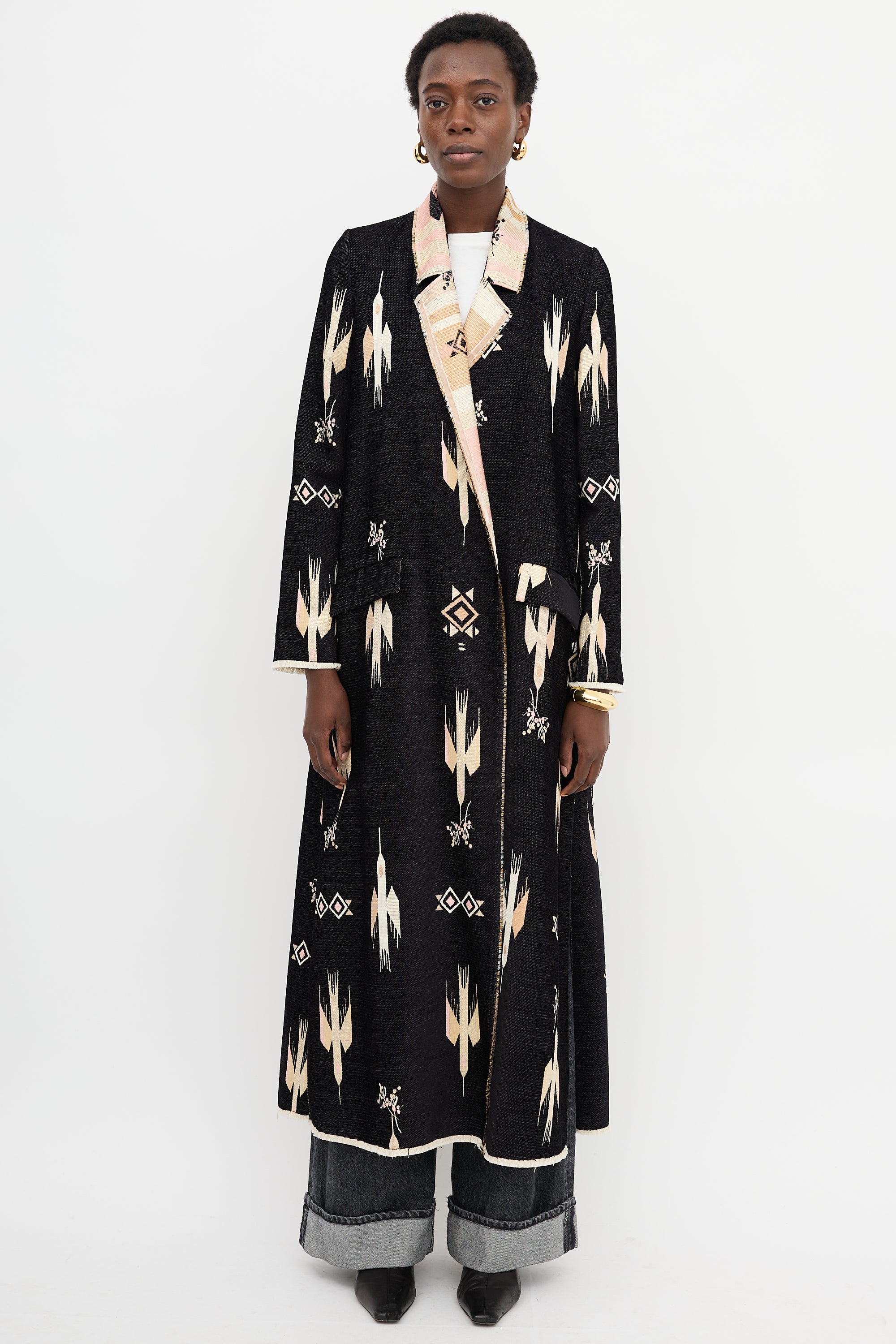 Pre-owned Forte Forte black and beige metallic jacquard coat featuring geometric bird and flower pattern, notched lapel, snap button front closure, two front flap pockets, and frayed edges. Unlined.