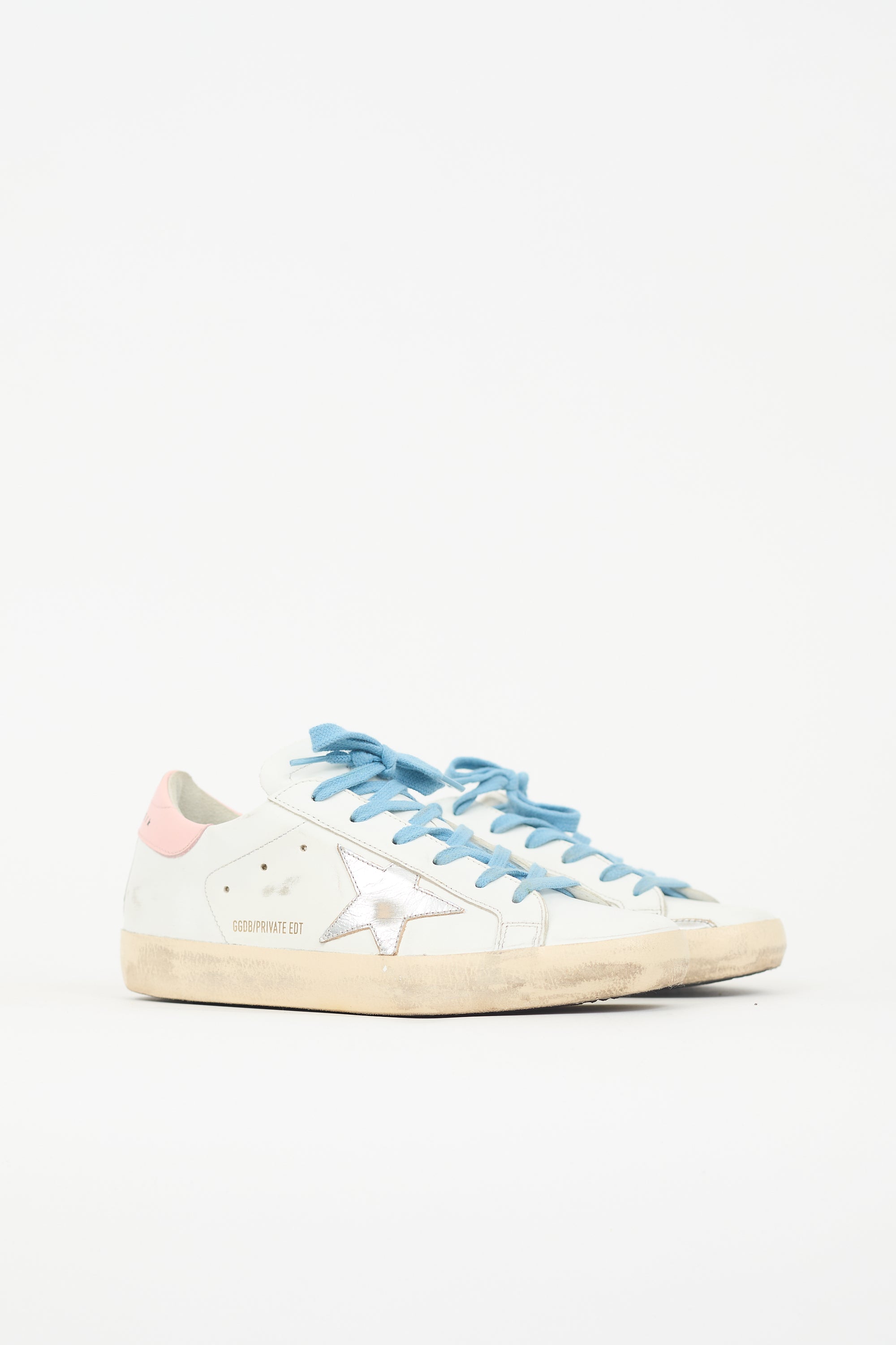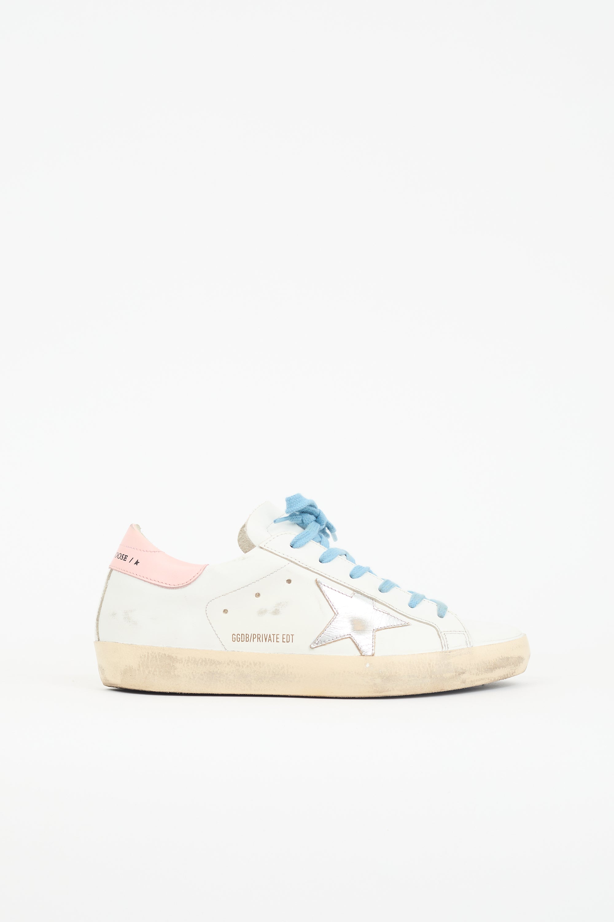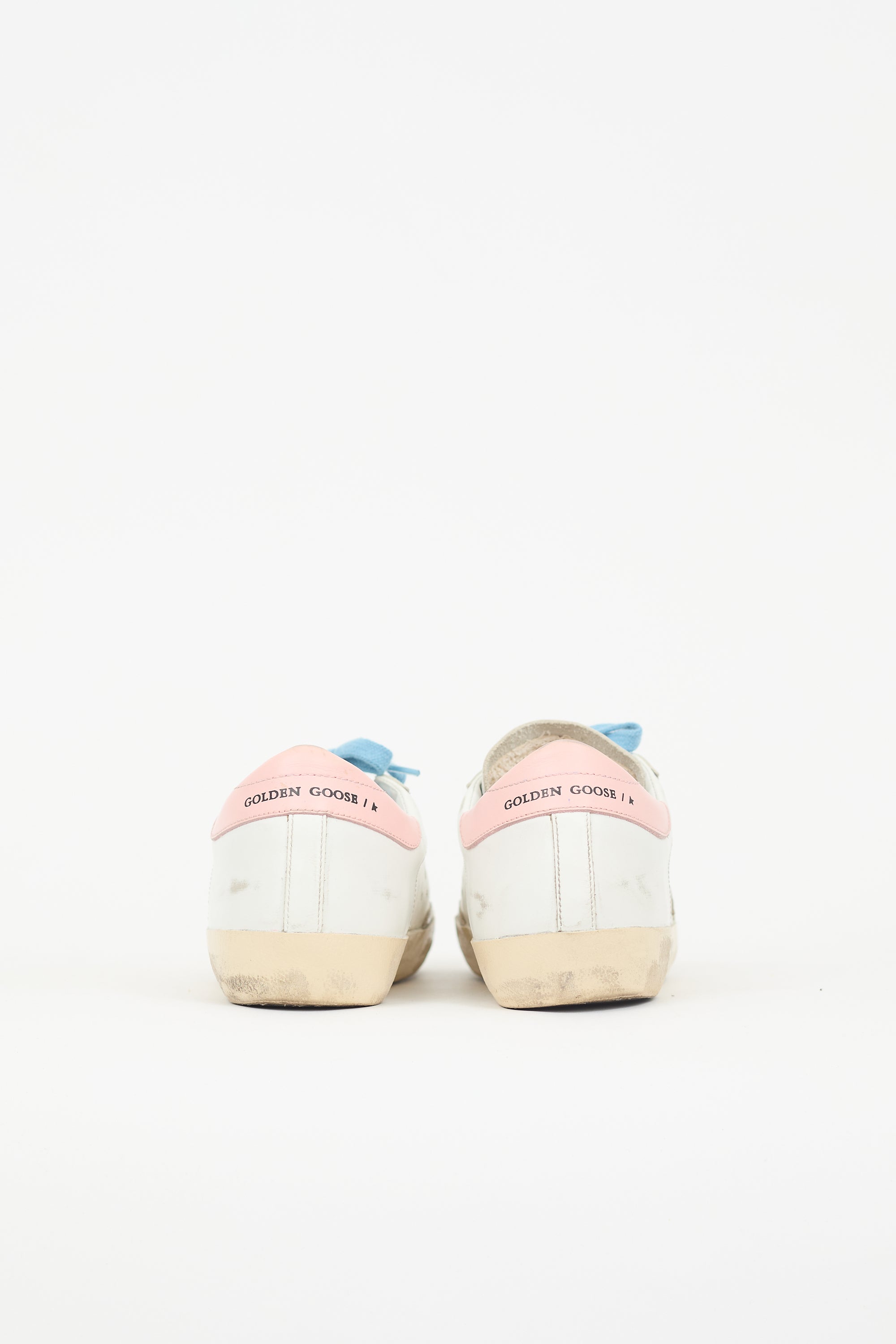 Pre-owned Golden Goose white and multicolour Superstar sneakers featuring rounded toe, lace up instep, perforated logo at tongue, silver tone metallic leather star patch at outer side, pink leather counter panel with printed logo, rubber sole, and distressing.