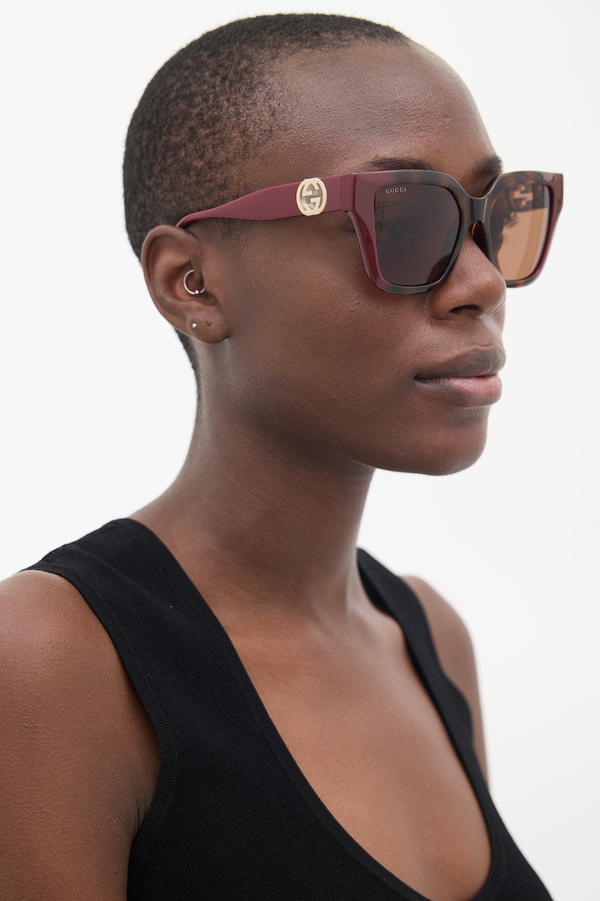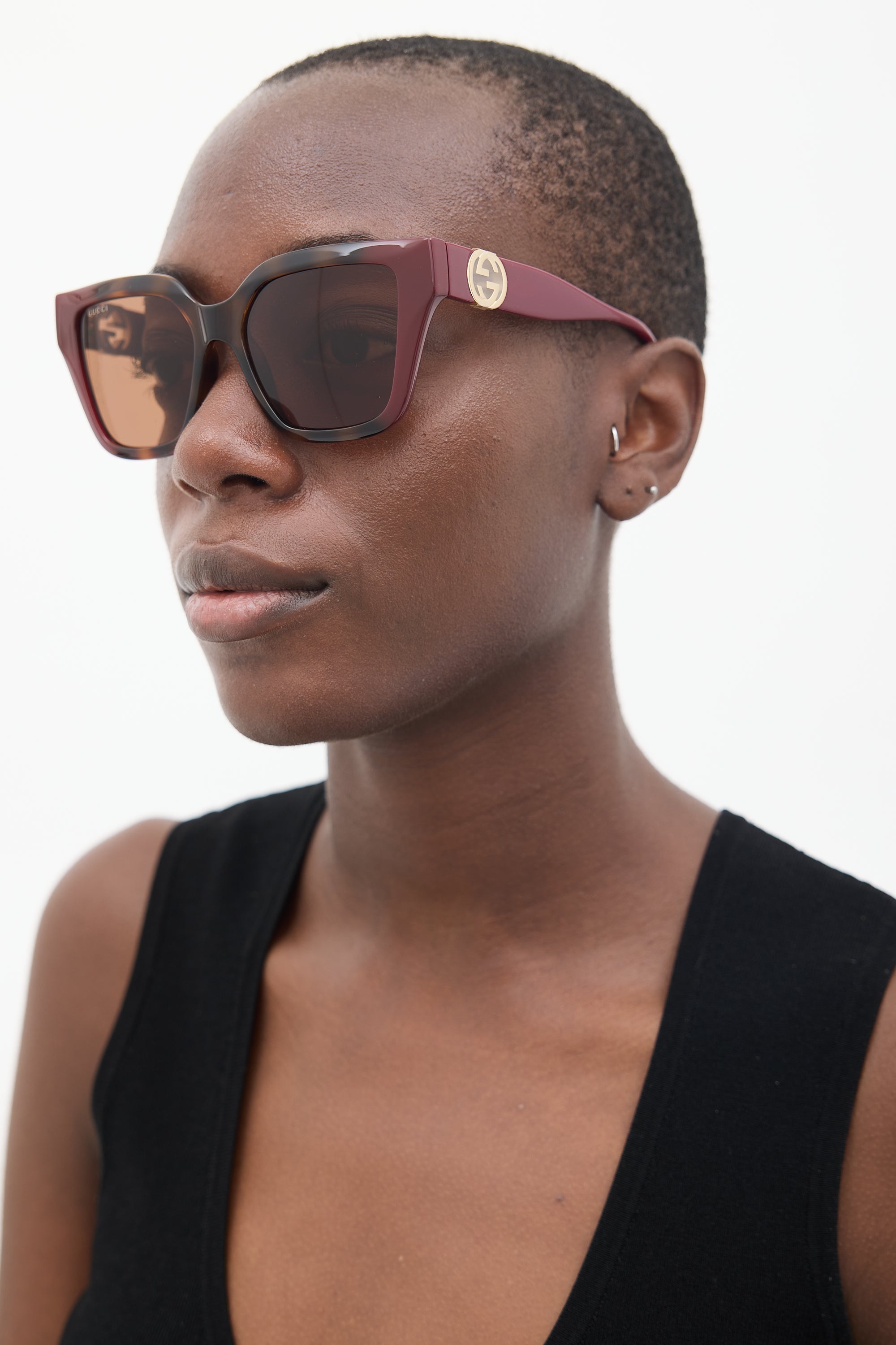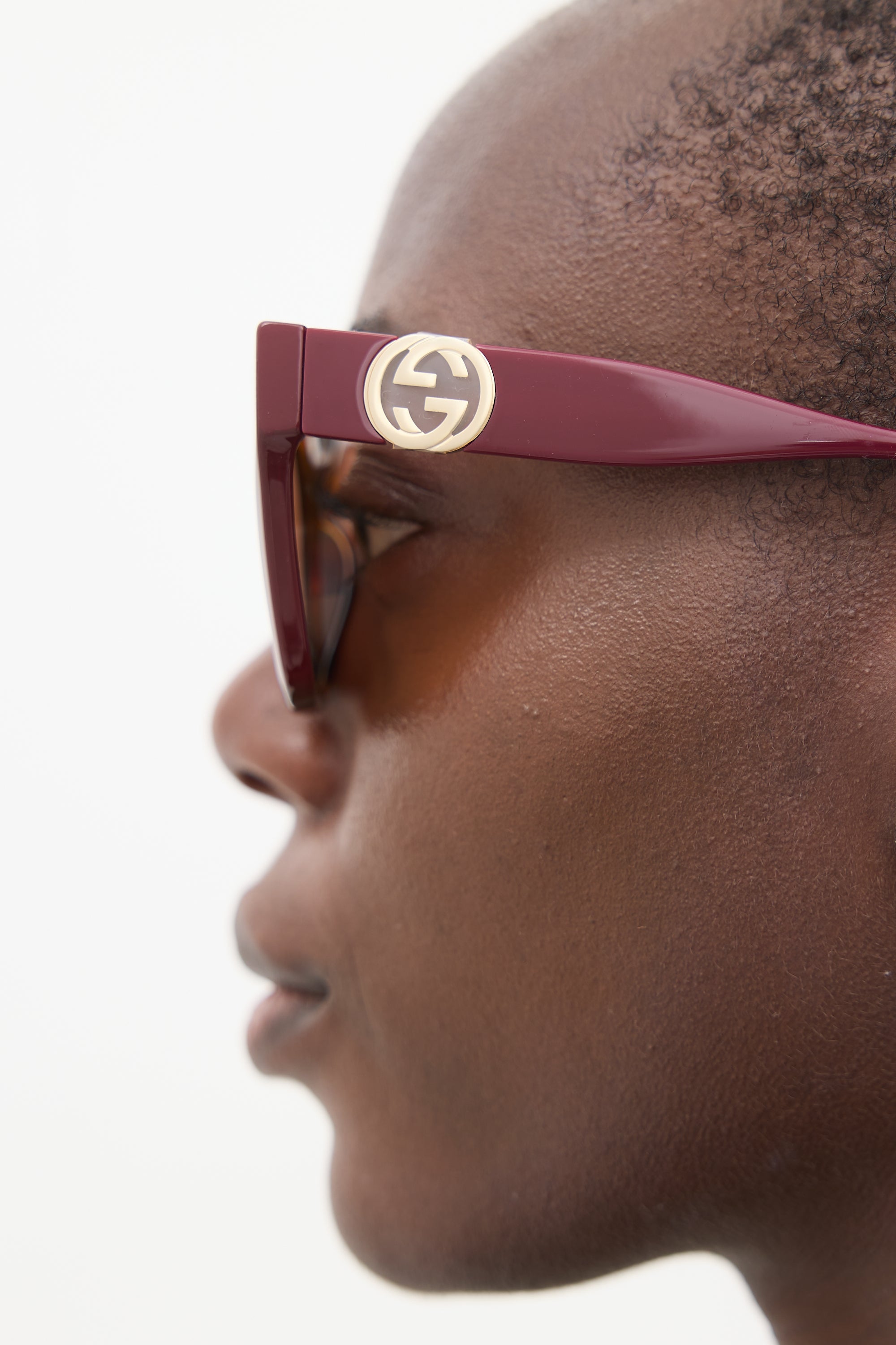 Pre-owned Gucci burgundy GG1023S sunglasses featuring a square frame with brown tortoise shell trim, tinted lenses, nose pads, and gold tone GG logo hardware at temples. Comes with original case.