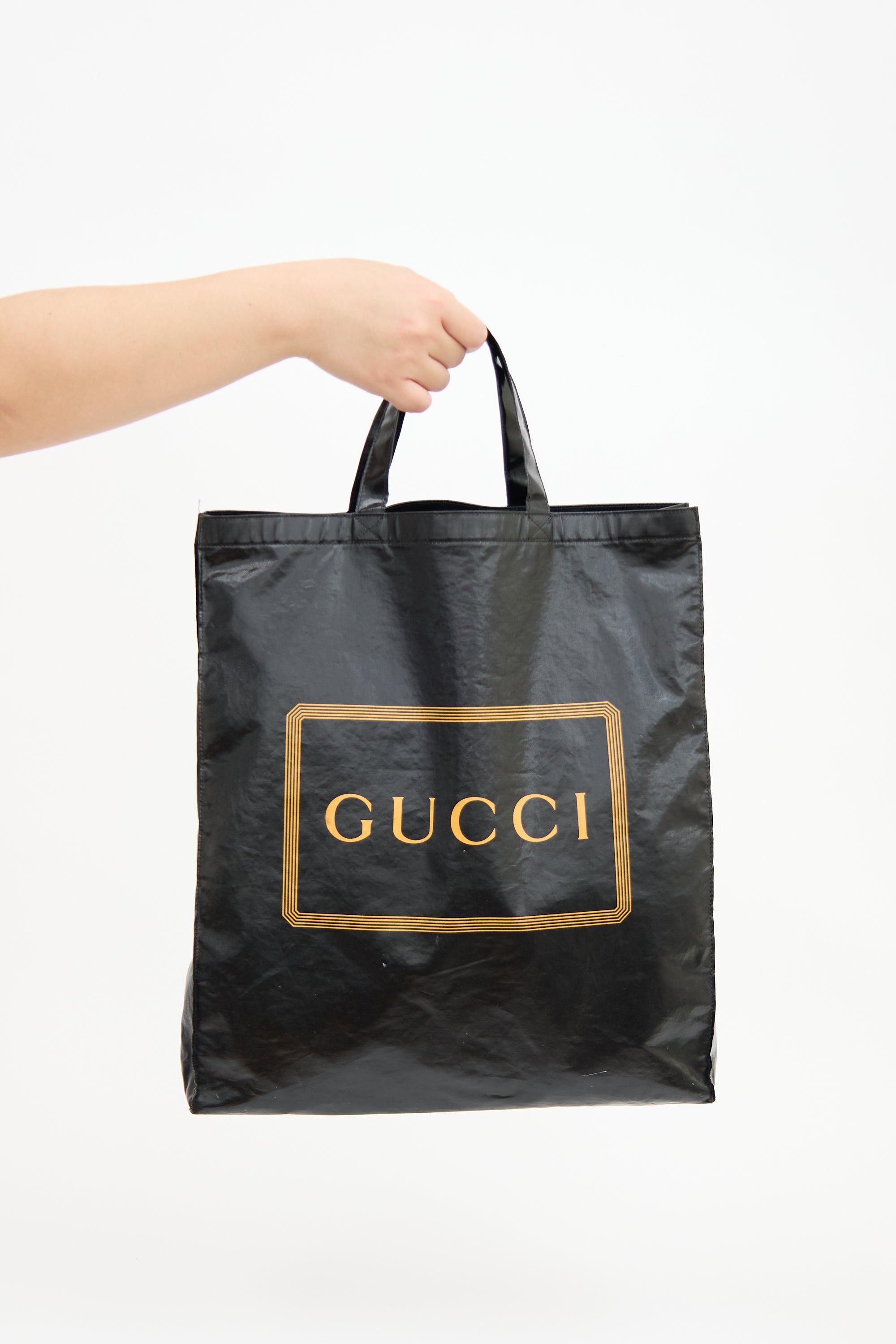 Pre-owned Gucci black coated canvas Monte Carlo tote bag featuring two flat top handles, yellow printed logo at front, and open compartment.