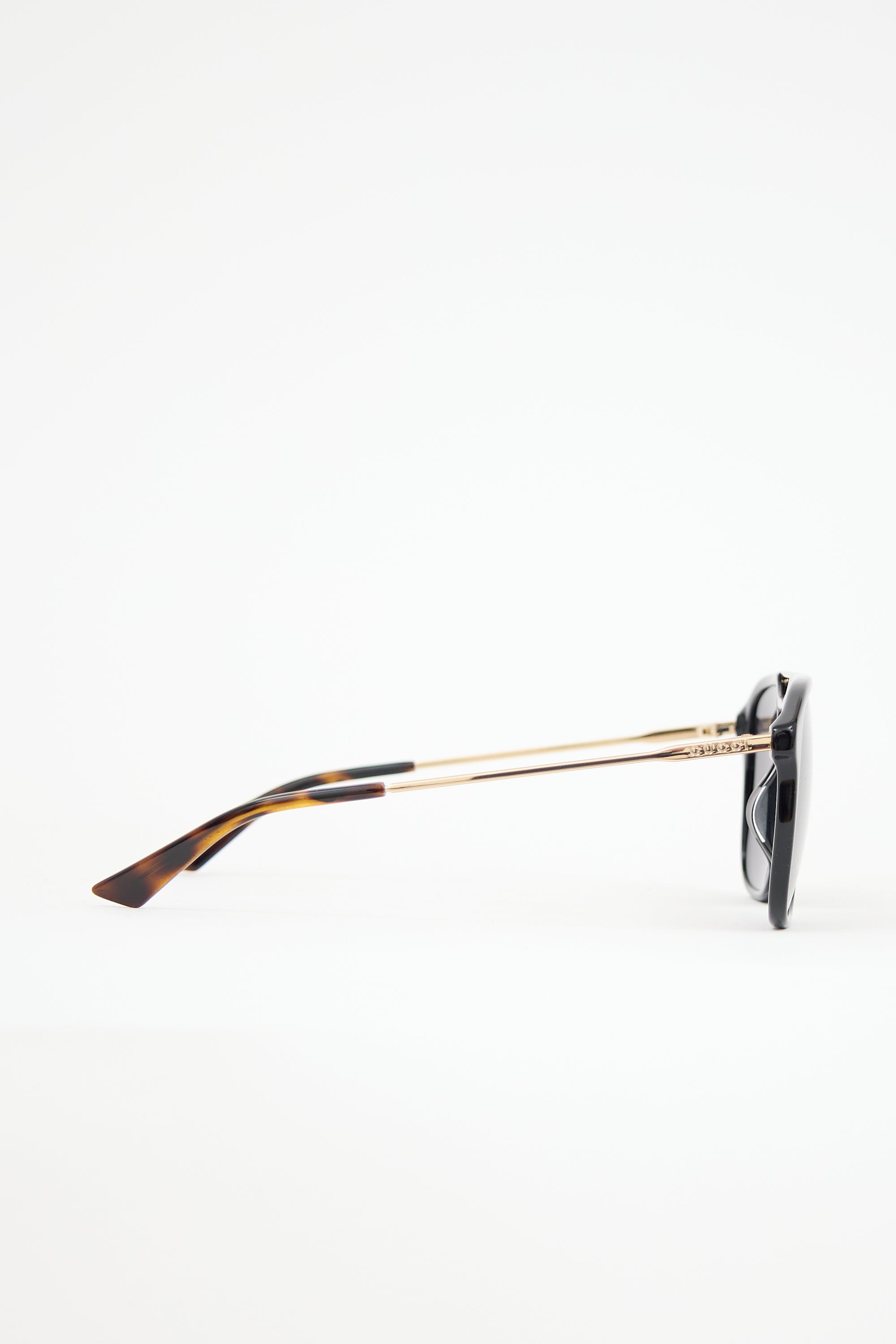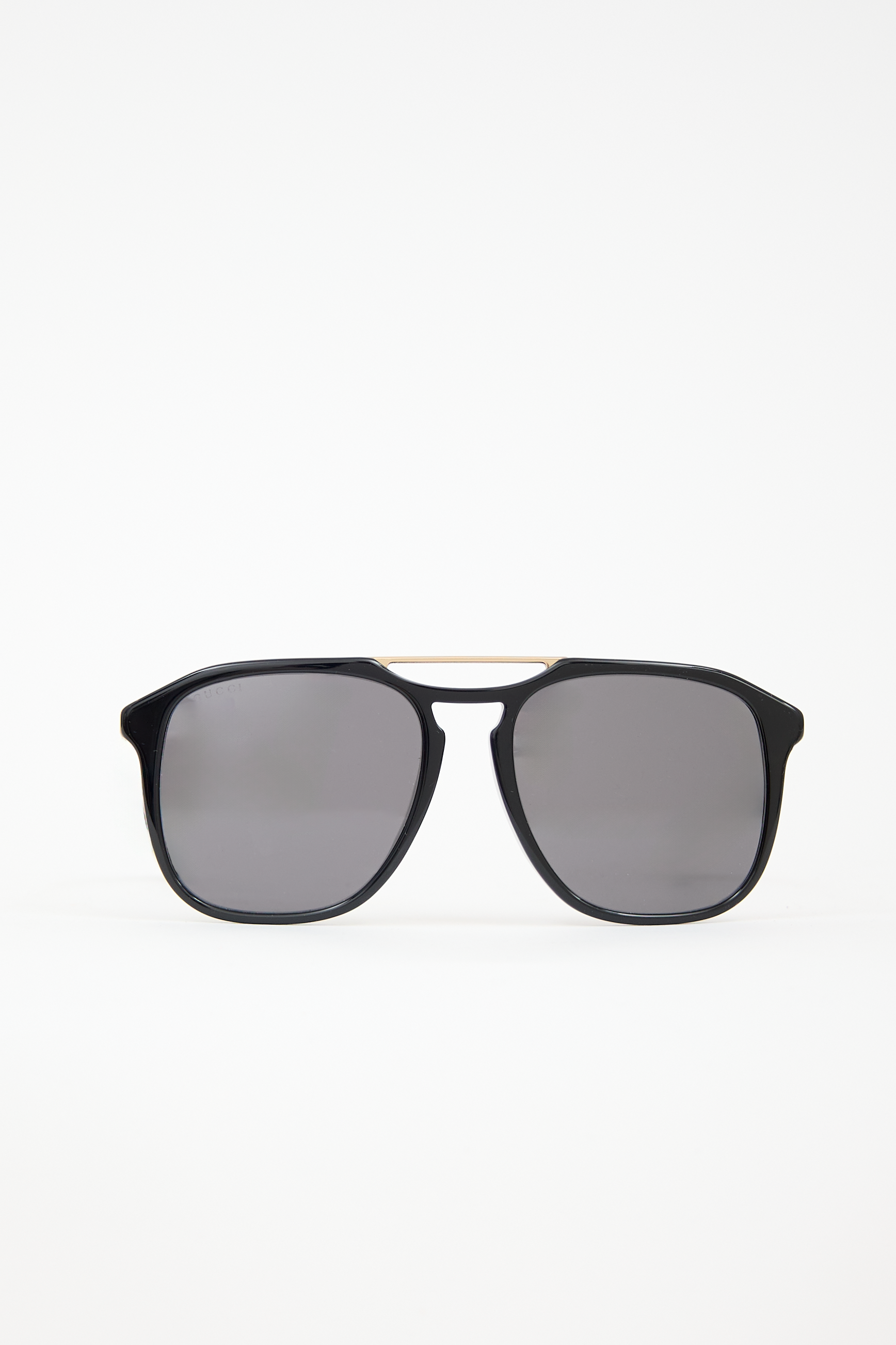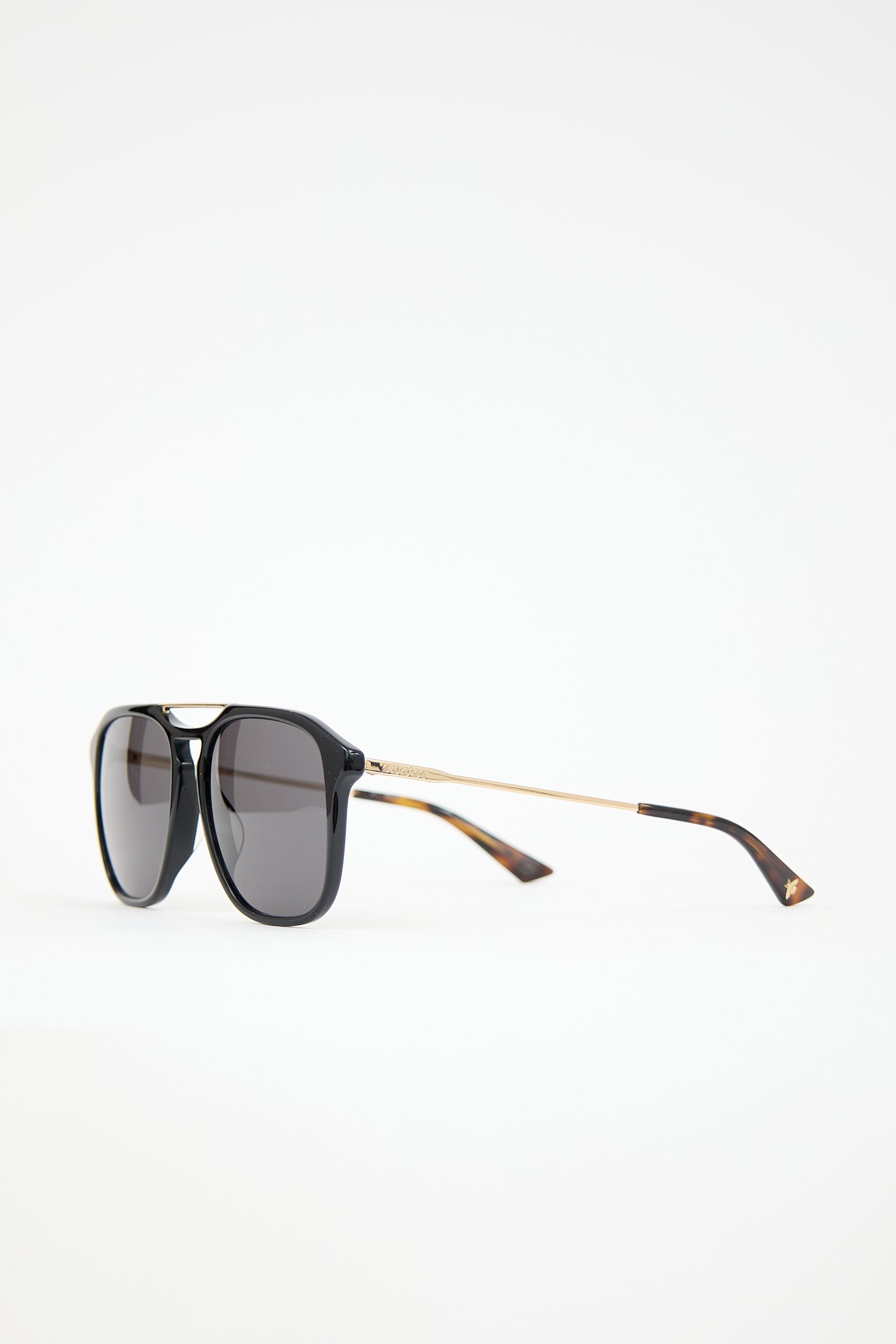 Pre-owned Gucci black GG0321S sunglasses featuring gold tone hardware, oversized square frame, engraved logo at arms, and gold tone bee stamped at temple tip. Includes original case and pouch.