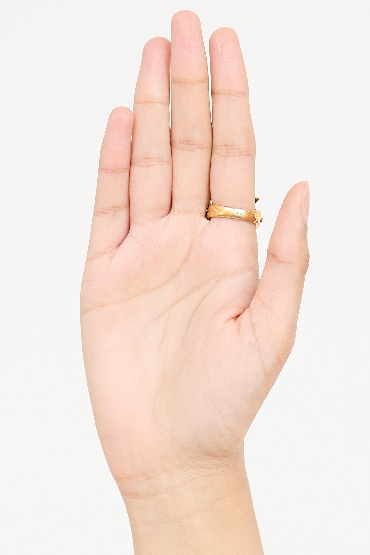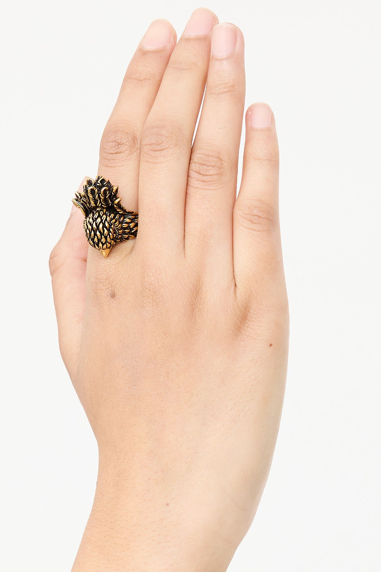 Pre-owned Gucci gold tone metal ring featuring eagle head, hammered band and engraved logo at back.