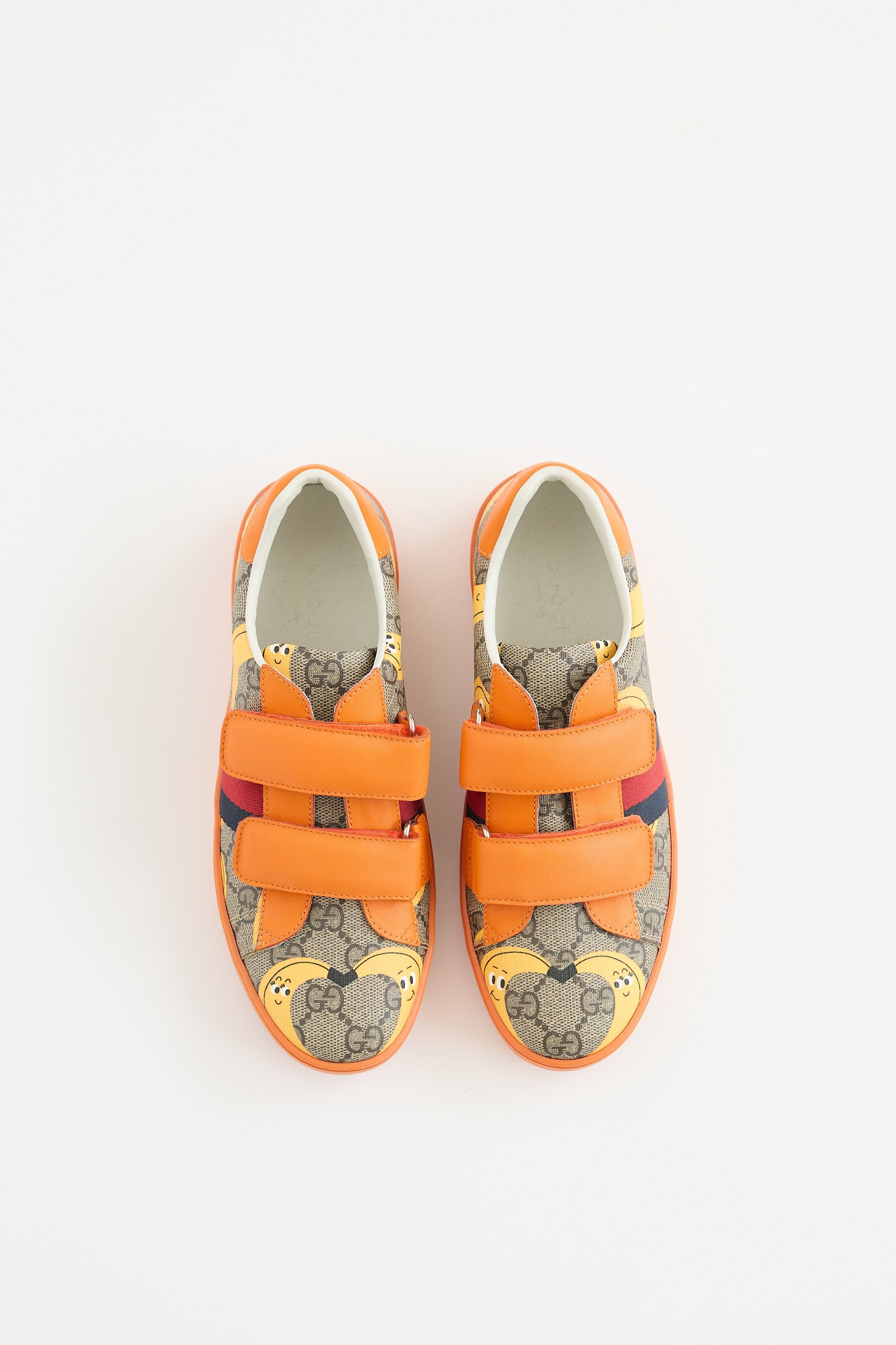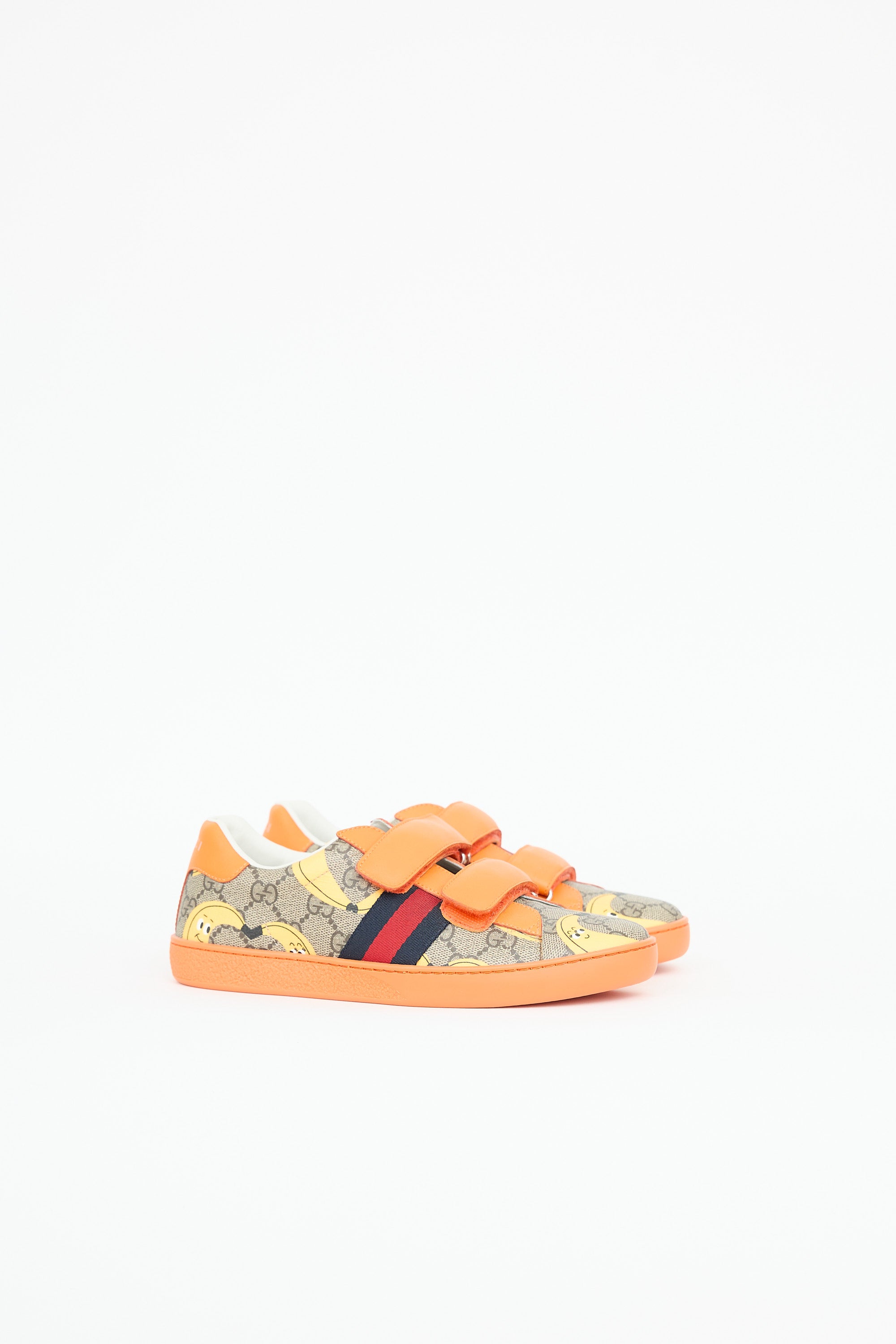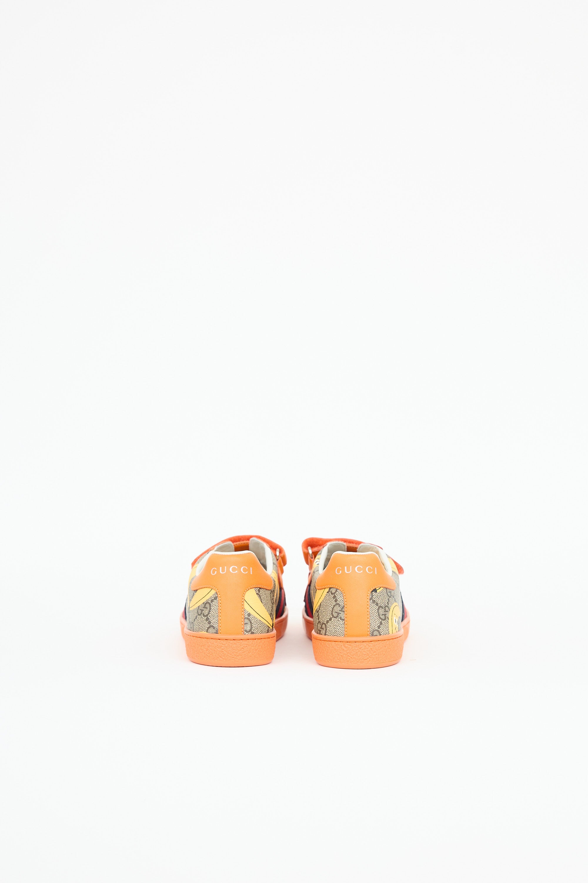 Pre-owned Gucci kids orange and multicolor leather GG Supreme H2O Banana sneaker featuring round toe, adjustable velcro straps at vamp, signature web at side, and logo at counter.