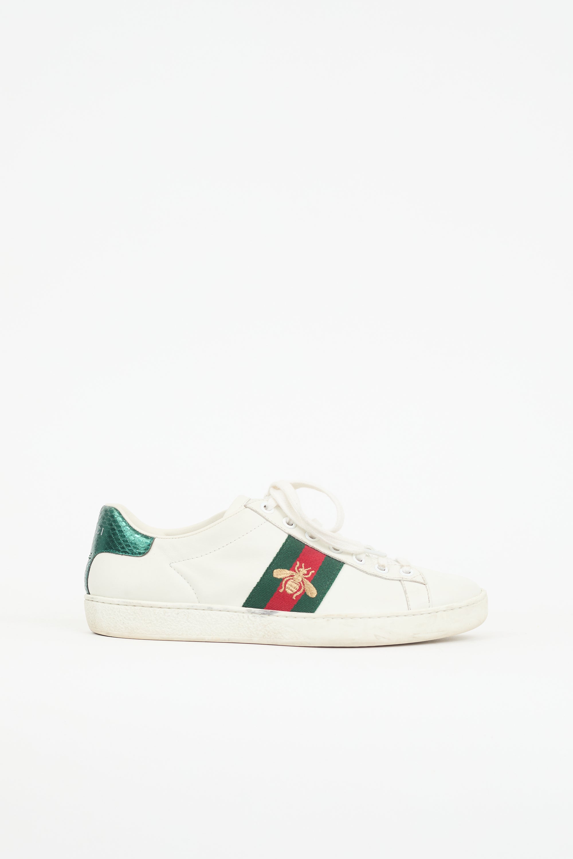 Pre-owned Gucci white leather Ace sneakers featuring rounded toe, lace up instep, signature green and red Web stripes at sides, gold tone embroidered bee motif at outer sides, mismatched metallic leather counter panels with printed logos, and rubber sole.