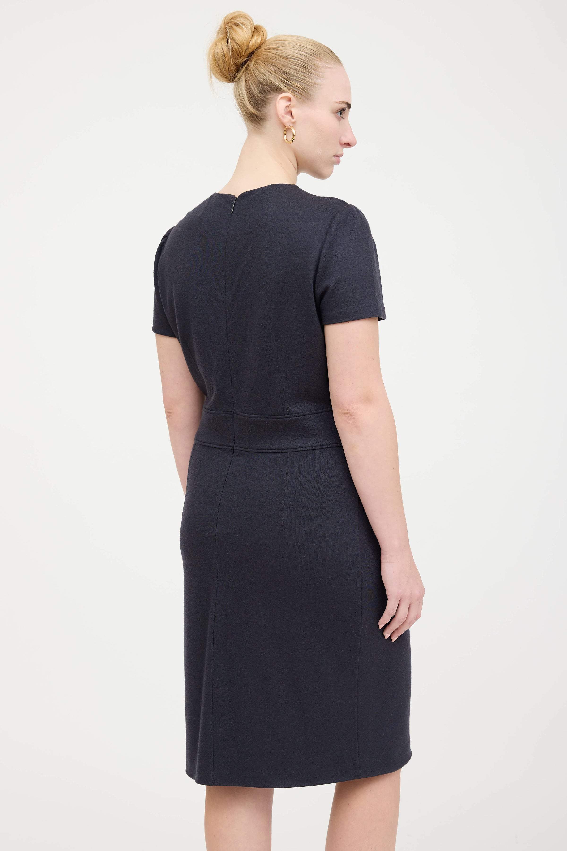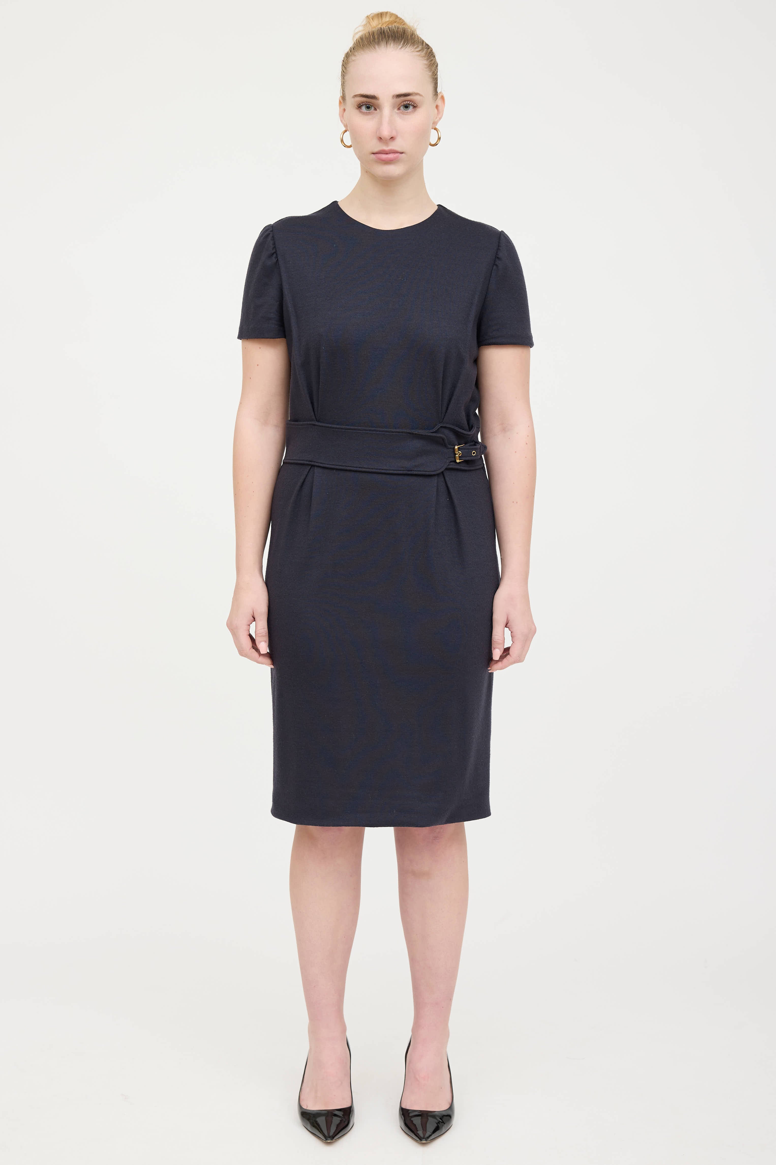 Pre-owned Gucci navy wool short sleeve dress featuring round neckline, pleated shoulders and waist, adjustable belt with gold tone hardware, and concealed zip at back.