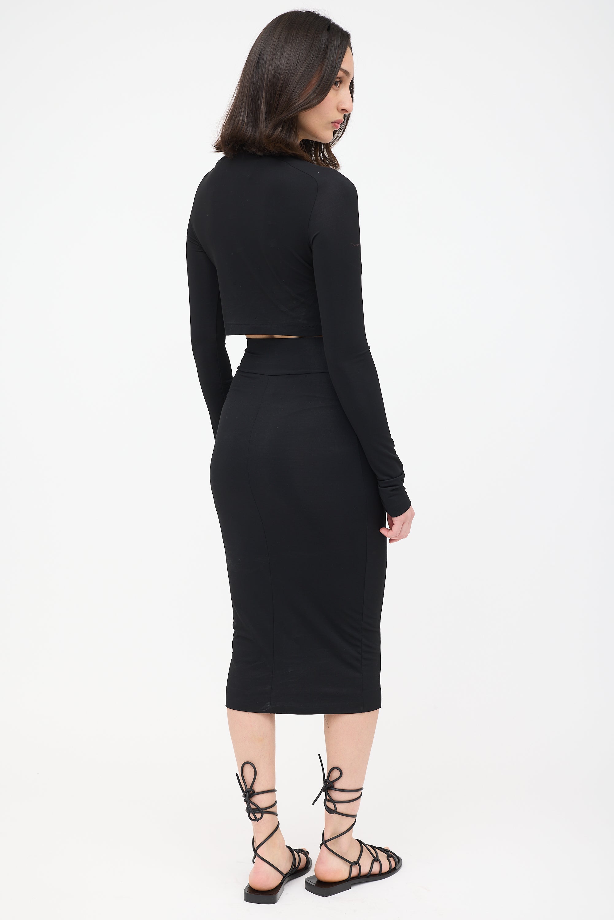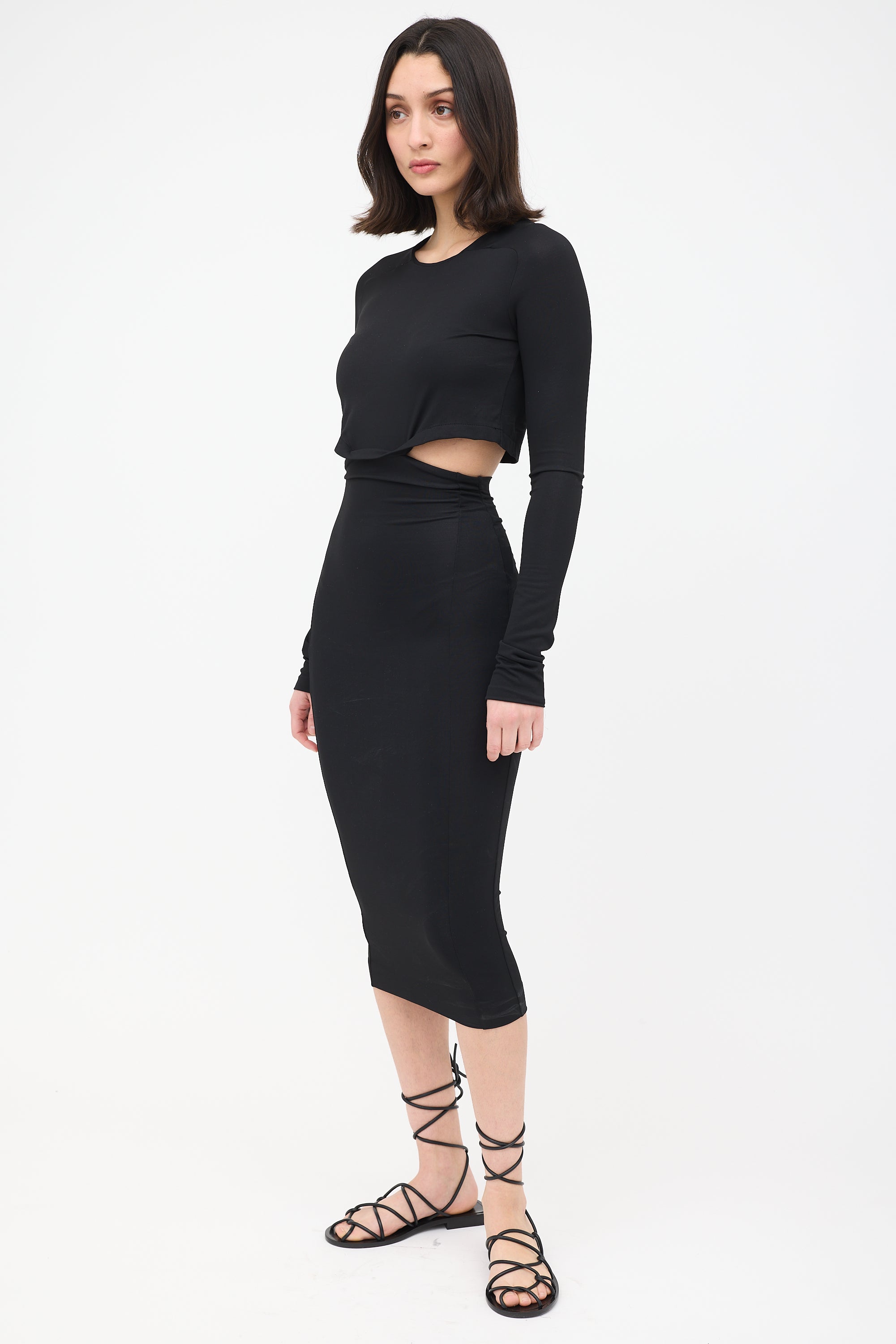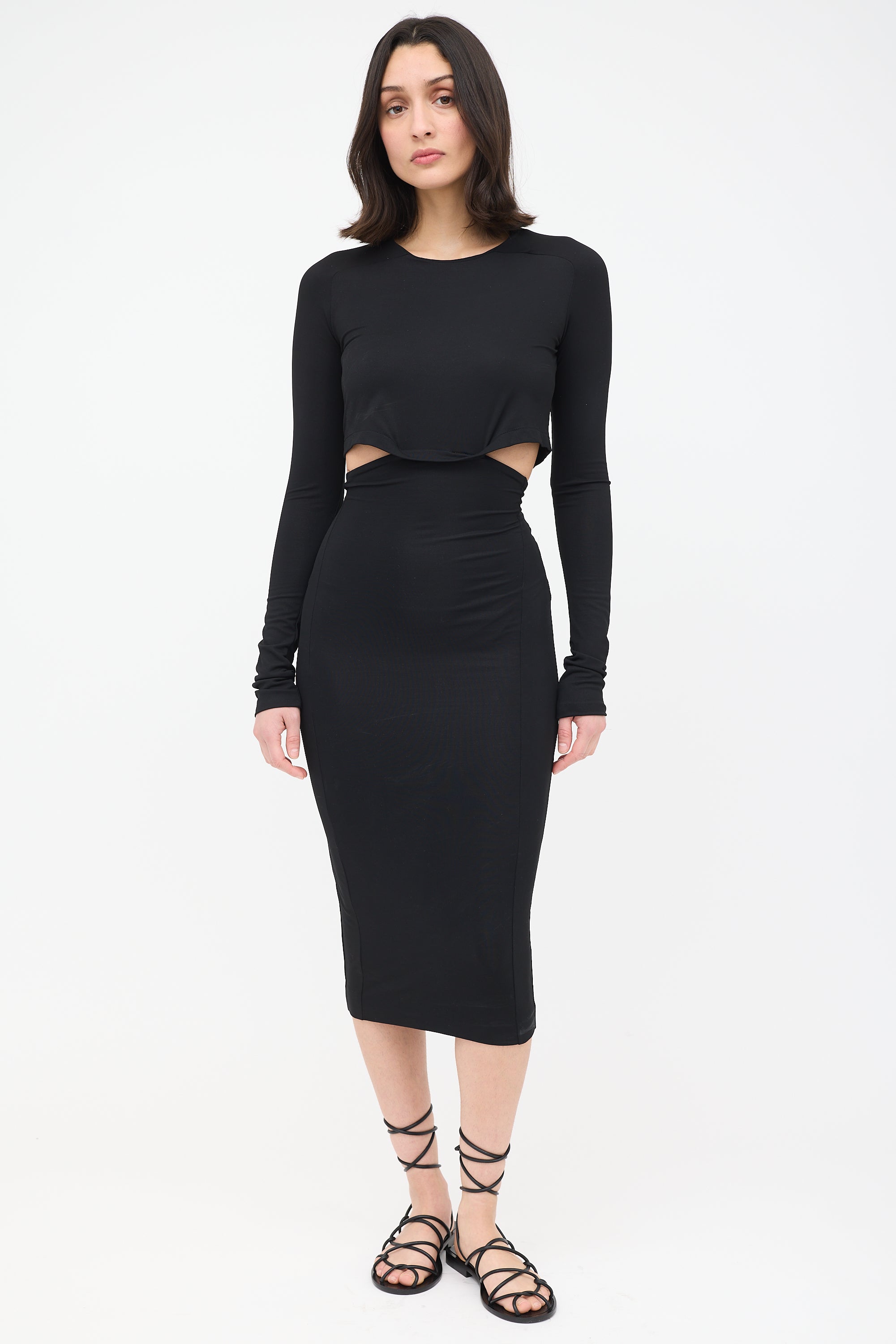 Pre-owned Haider Ackermann black midi dress featuring round neckline and cut out waist and back.
