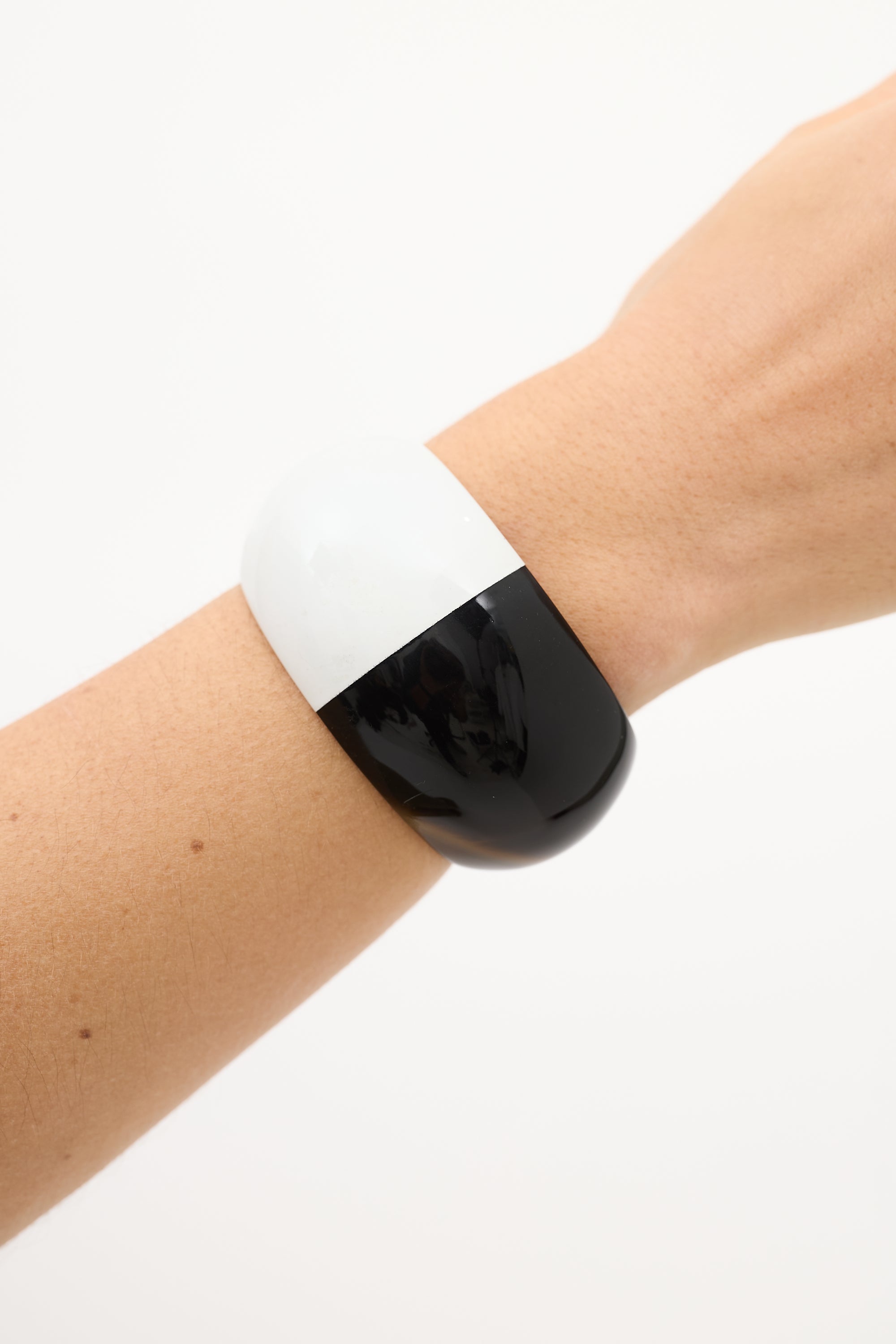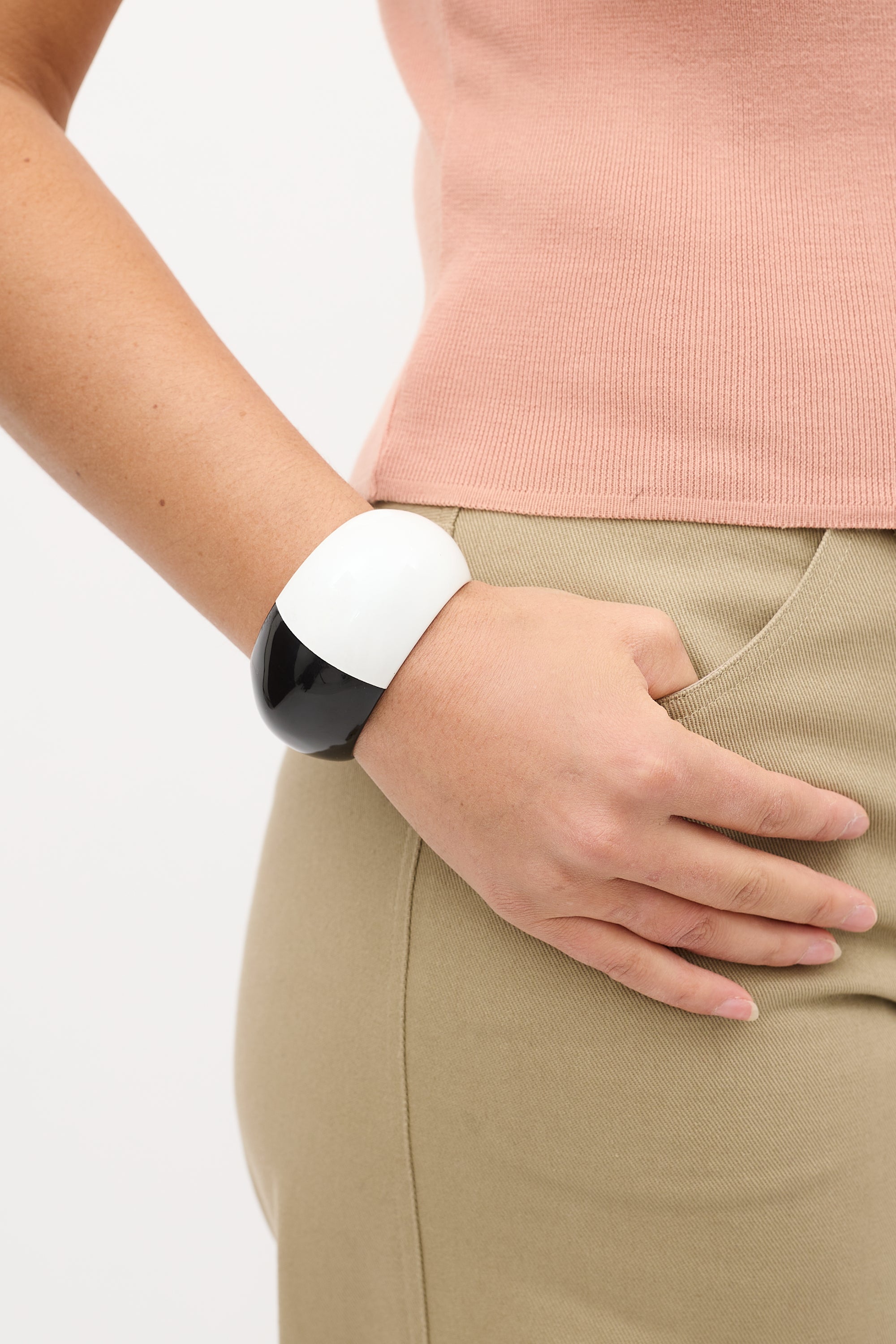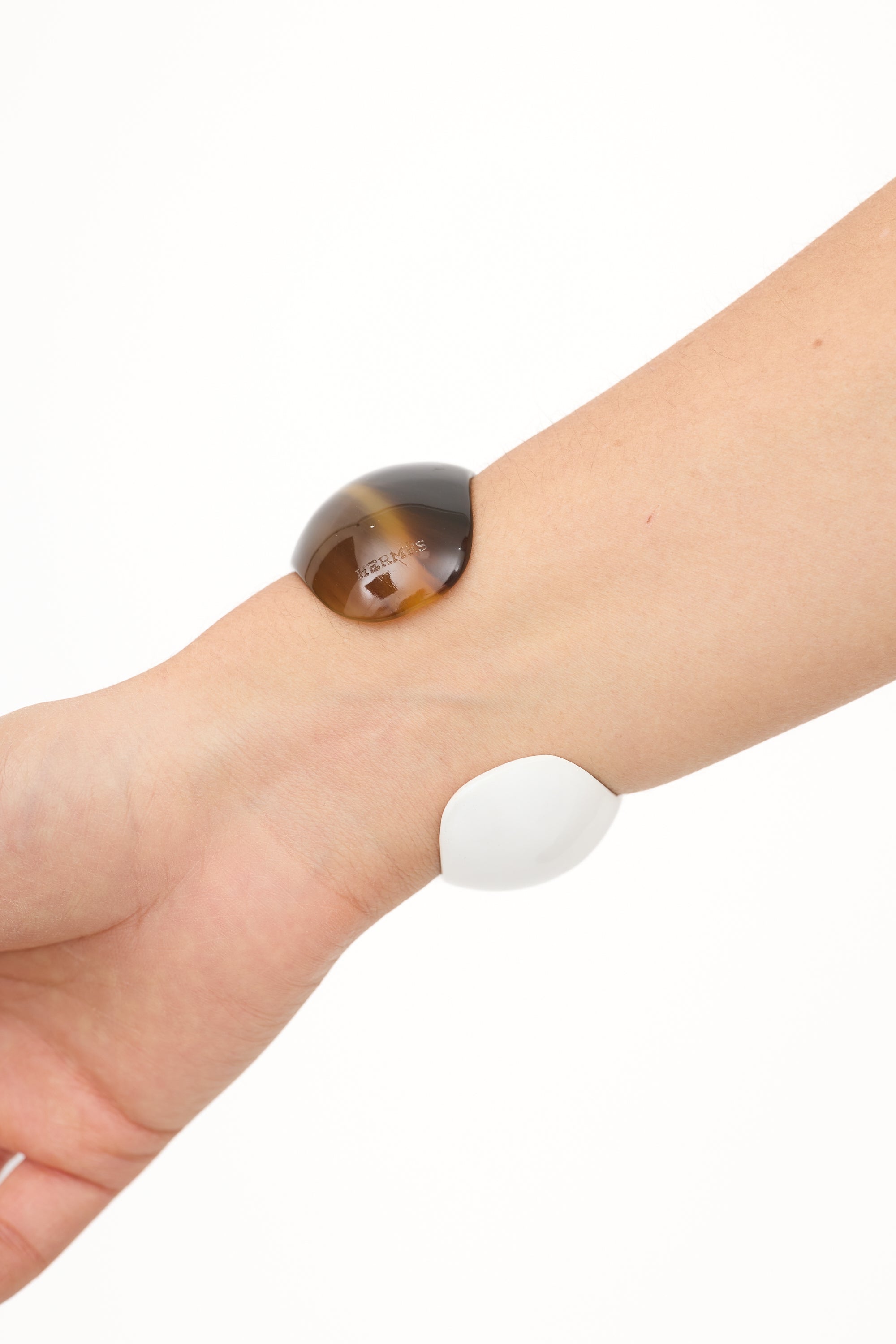 Pre-owned Hermès cuff bracelet featuring two tone design, brown horn half, white lacquer half, and etched logo at one end.